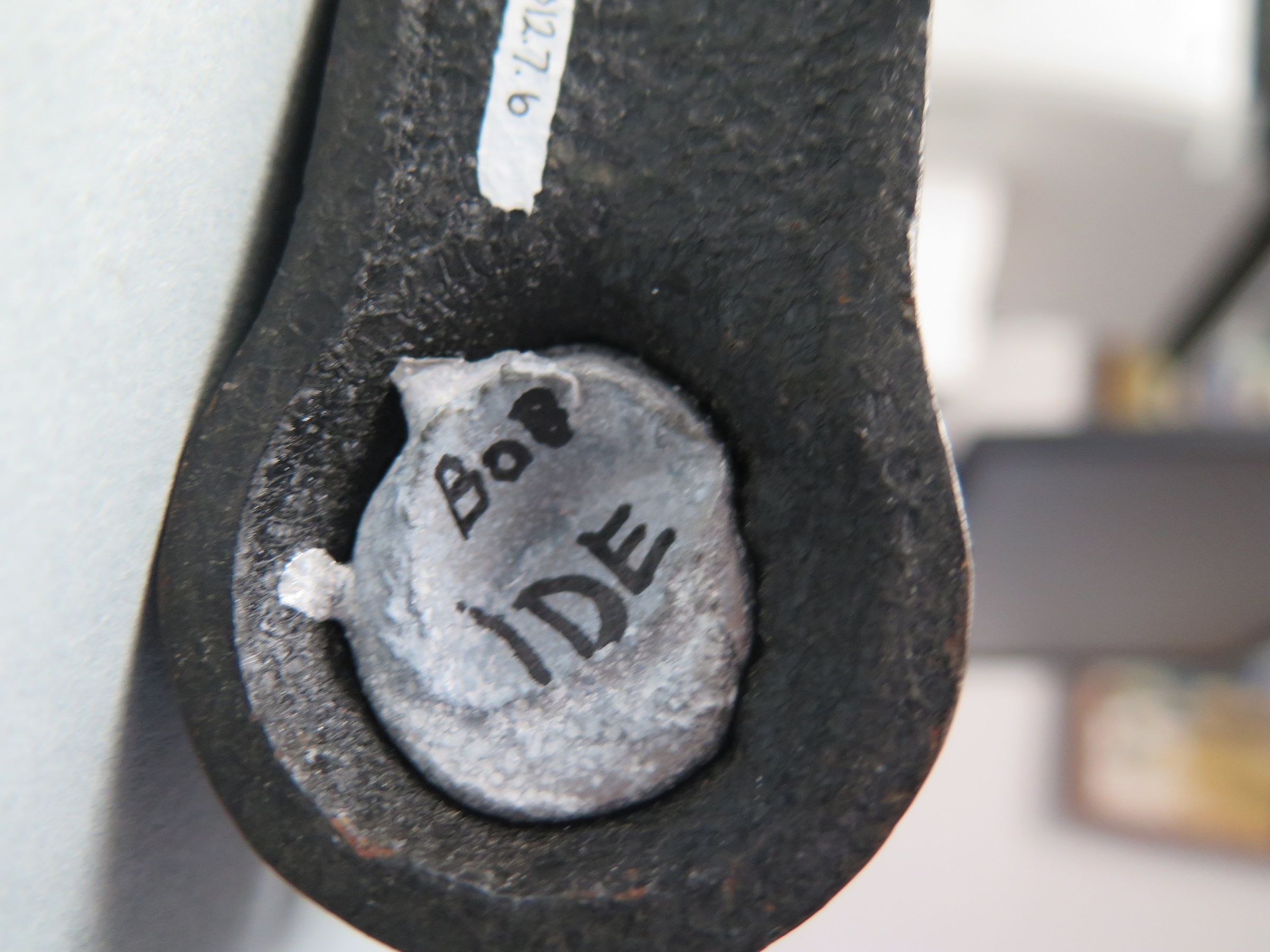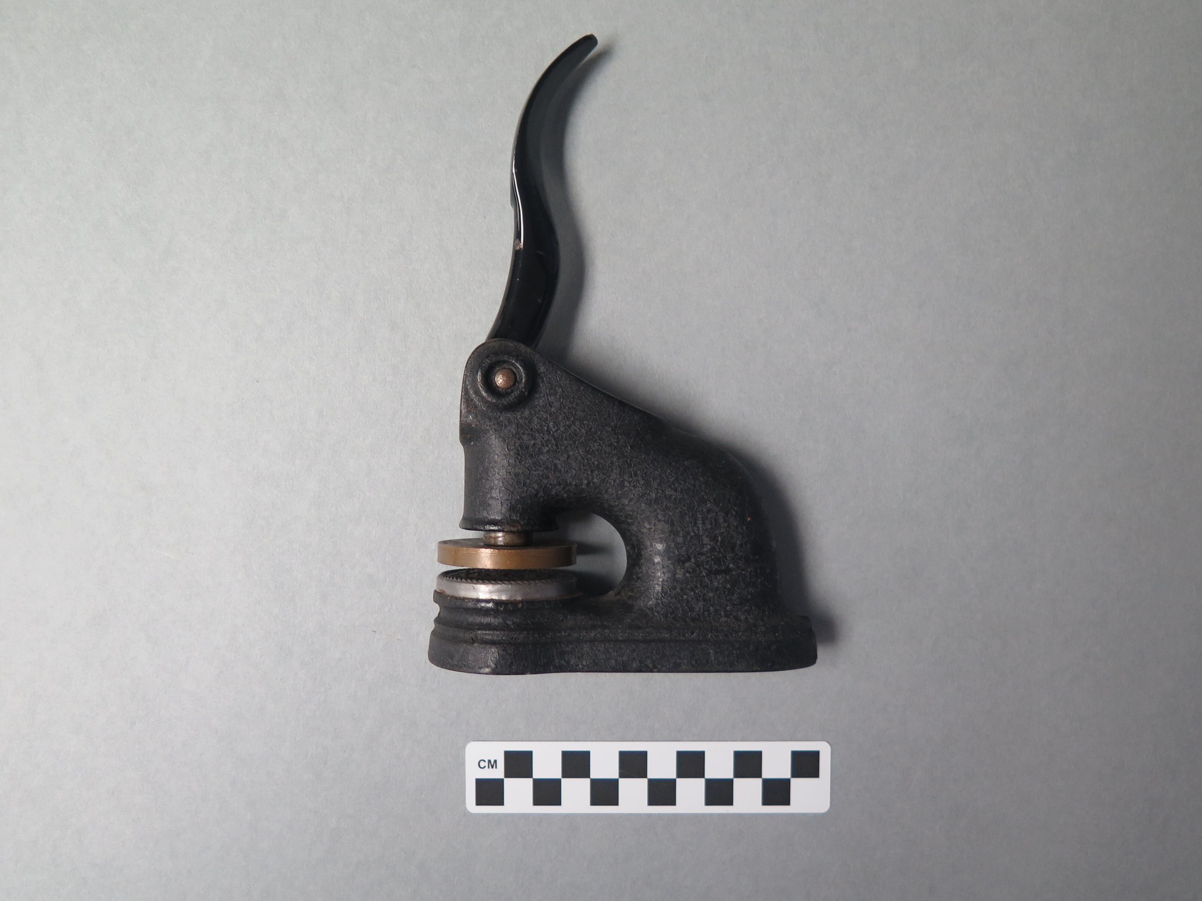 An embosser for imprinting a seal for The Broomfield Company, used circa 1955-1964. The embosser is approximately 5" (l) x 2" (w) x 8.5" (h) when standing upright, with a long lever used to imprint paper with two round metal plates. The shape of the embosser curves toward the back away from the handle, toward the base. Materially it is solid metal, black. The embossing plates are bronze and silver in color, with the former on top. The seal itself is round when applied, with the company name "The Broomfield Company" along the top edge. Underneath the base, two hollow spots are visible, one filled with dried, hardened, and silver-colored melted metal. The name "Bob Ide," referring to the embosser's owner, is inscribed in permanent black marker on the metal. Ide's business card from Northwest Properties, LLC, a real estate company, is attached with cotton string/tape on the handle. Ide worked for Transamerica Development Company in the 1970s; Transamerica bought The Broomfield Company in 1964.Collection