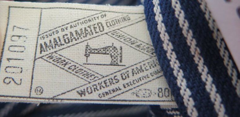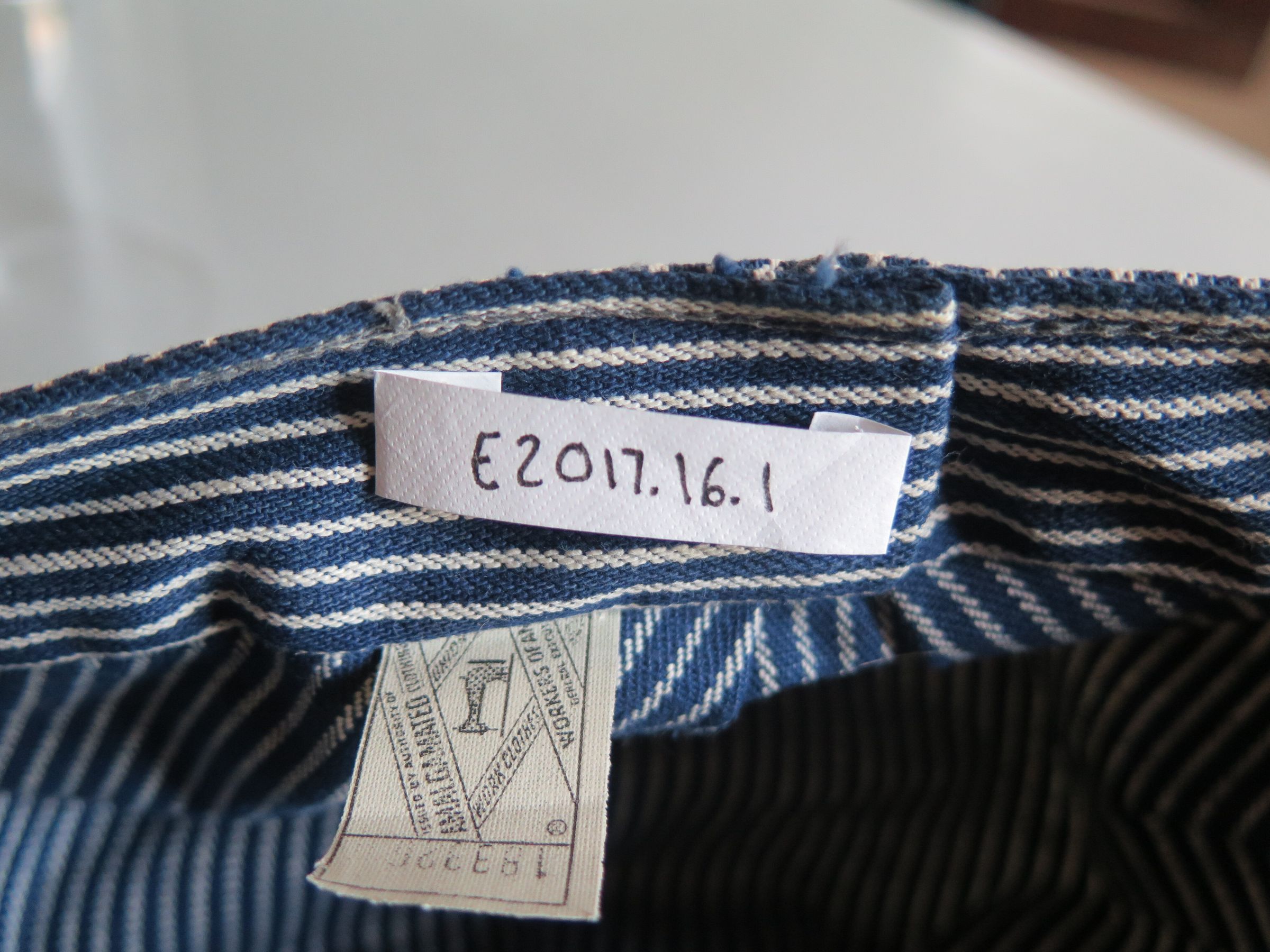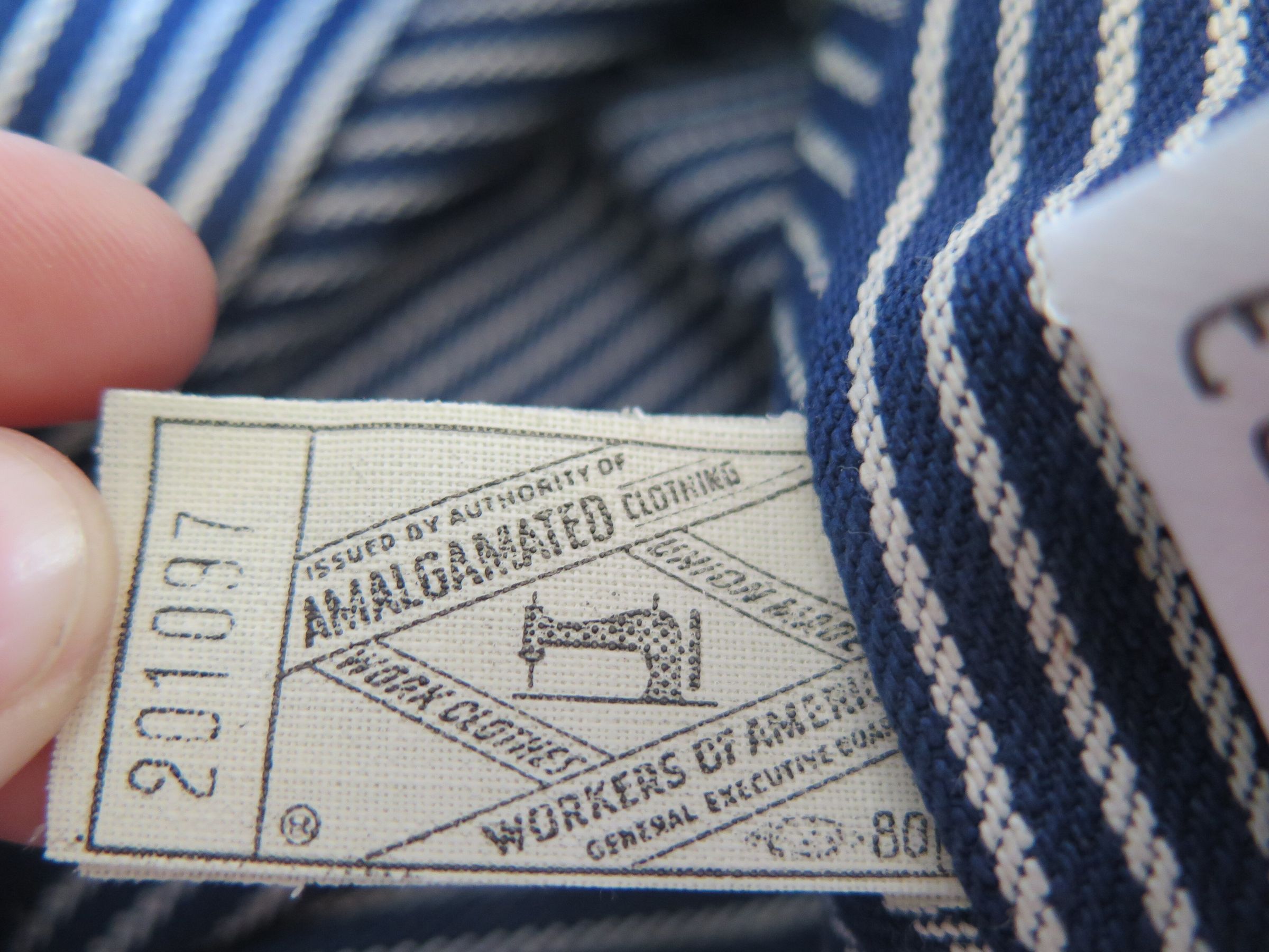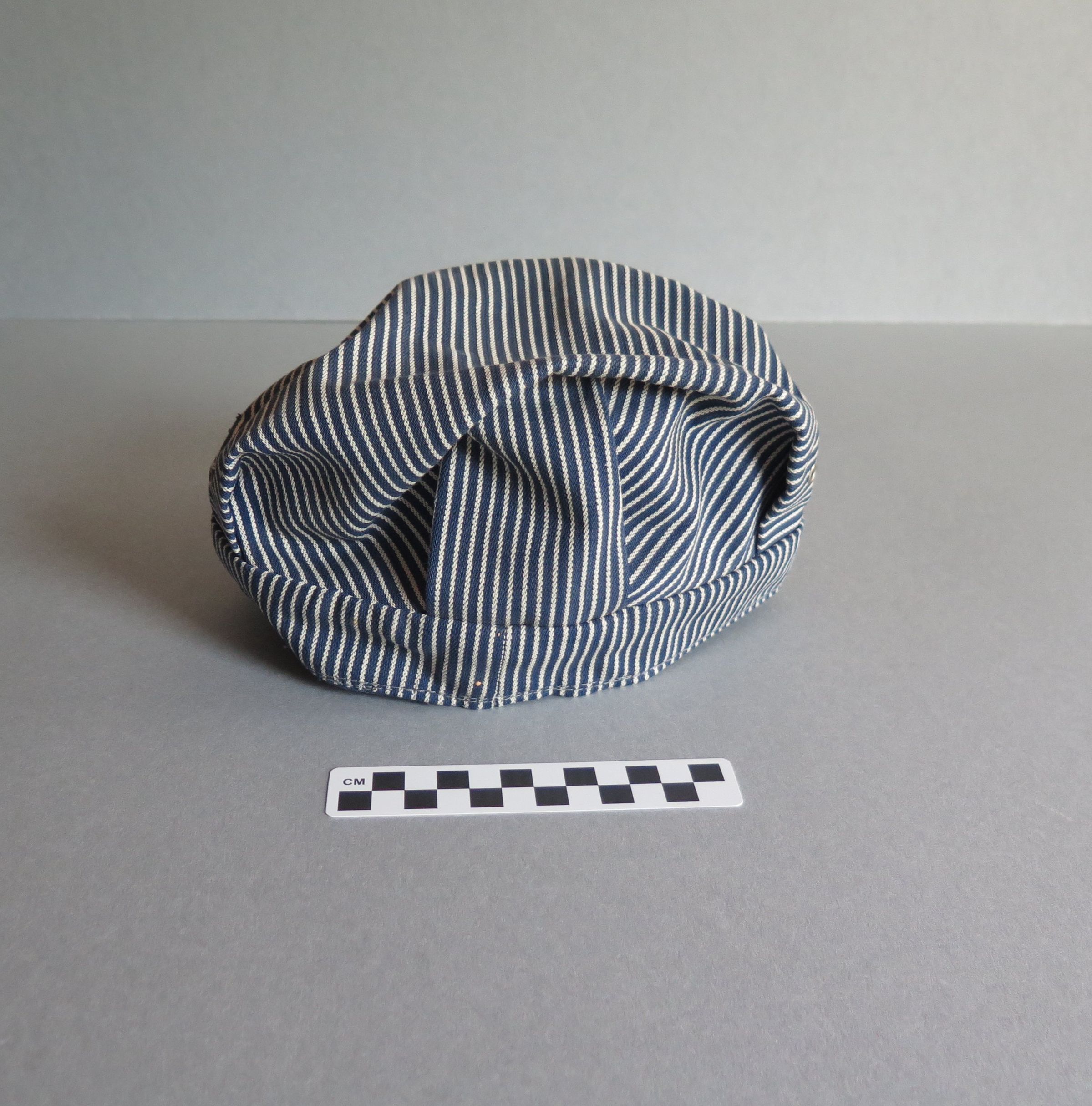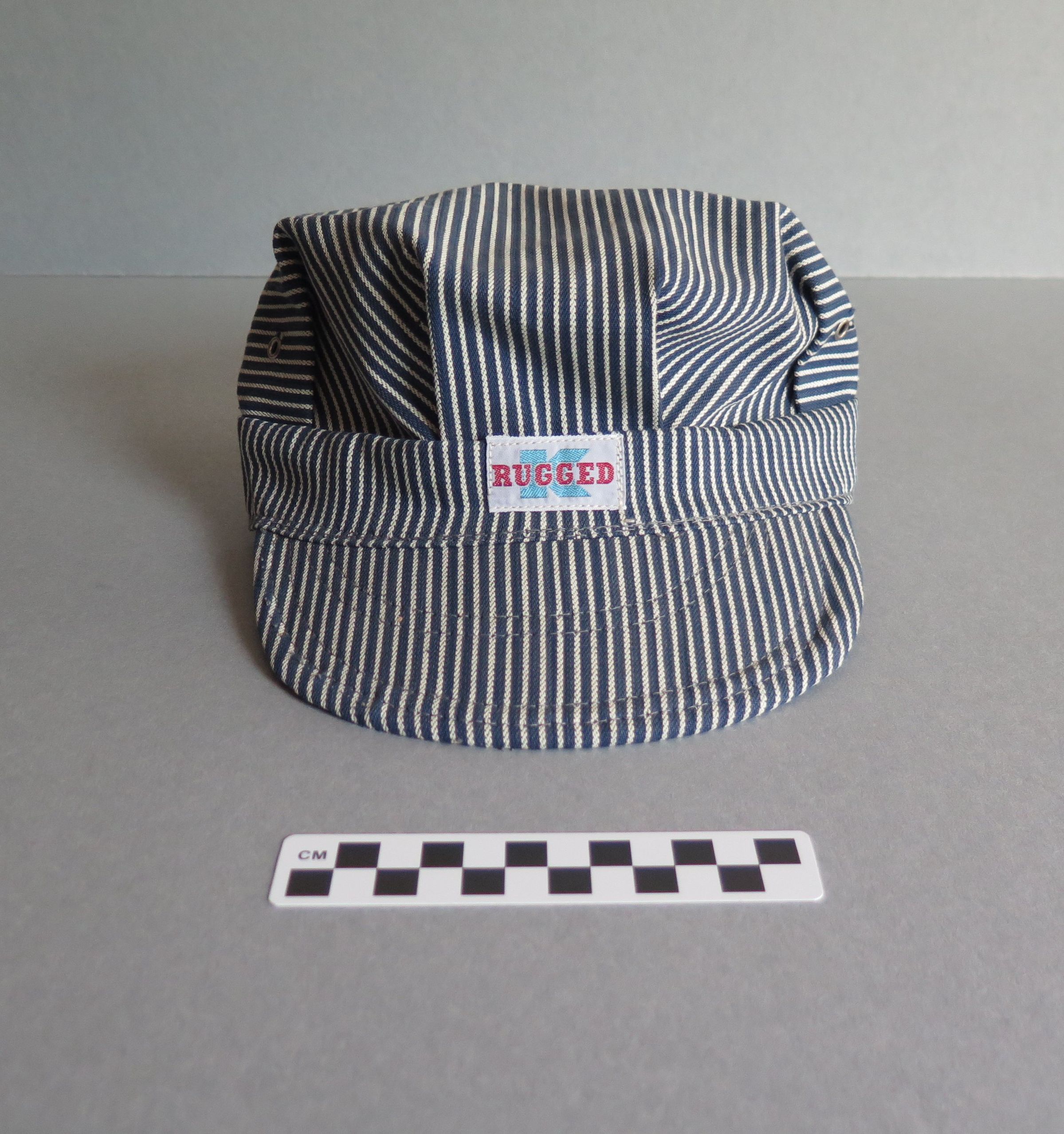 Blue rimmed train conductor or railroad engineer style hat with hickory stripes. There is a white cloth tag sewn above the brim of the hat with a blue "K" embroidered on it and red "RUGGED" layering the "K." There is white tag sewn into the back of the hat that has "ISSUED BY AUTHORITY OF AMALGAMATED CLOTHING / UNION . . . WORK CLOTHING / WORKERS OF AMERICA / GENERAL EXECUTIVE . . . " in black ink. The top of the hat is pleated above the rim of the hat and it has two holes lined in metal on either side on the top of the hat. The hat measures 6" (h) x 10" (w) x 10" (l).