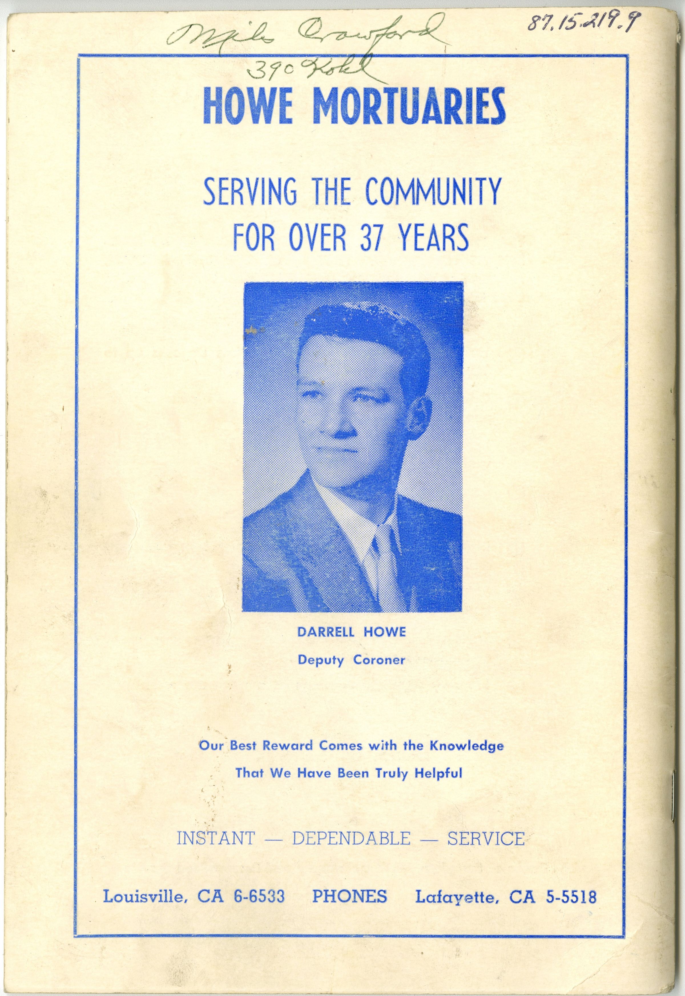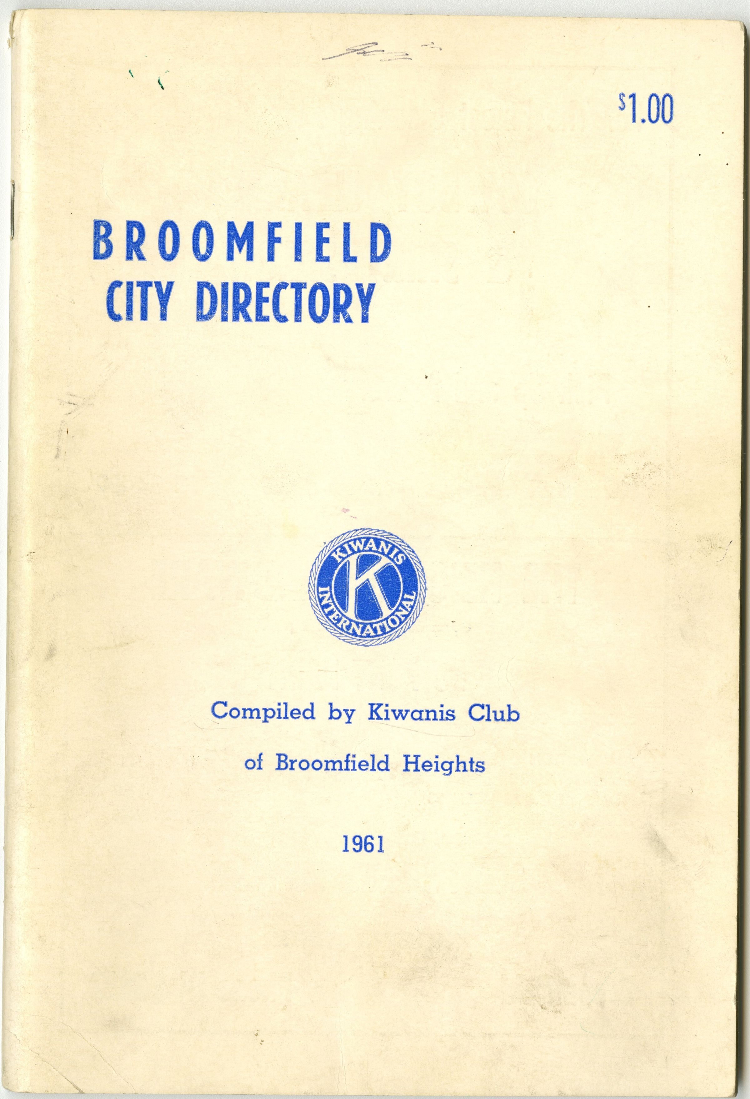 Broomfield City Directory, Compiled by Kiwanis Club of Broomfield Heights, 1961. $1.00. On back, "Miles Crawford 390 Kohl."