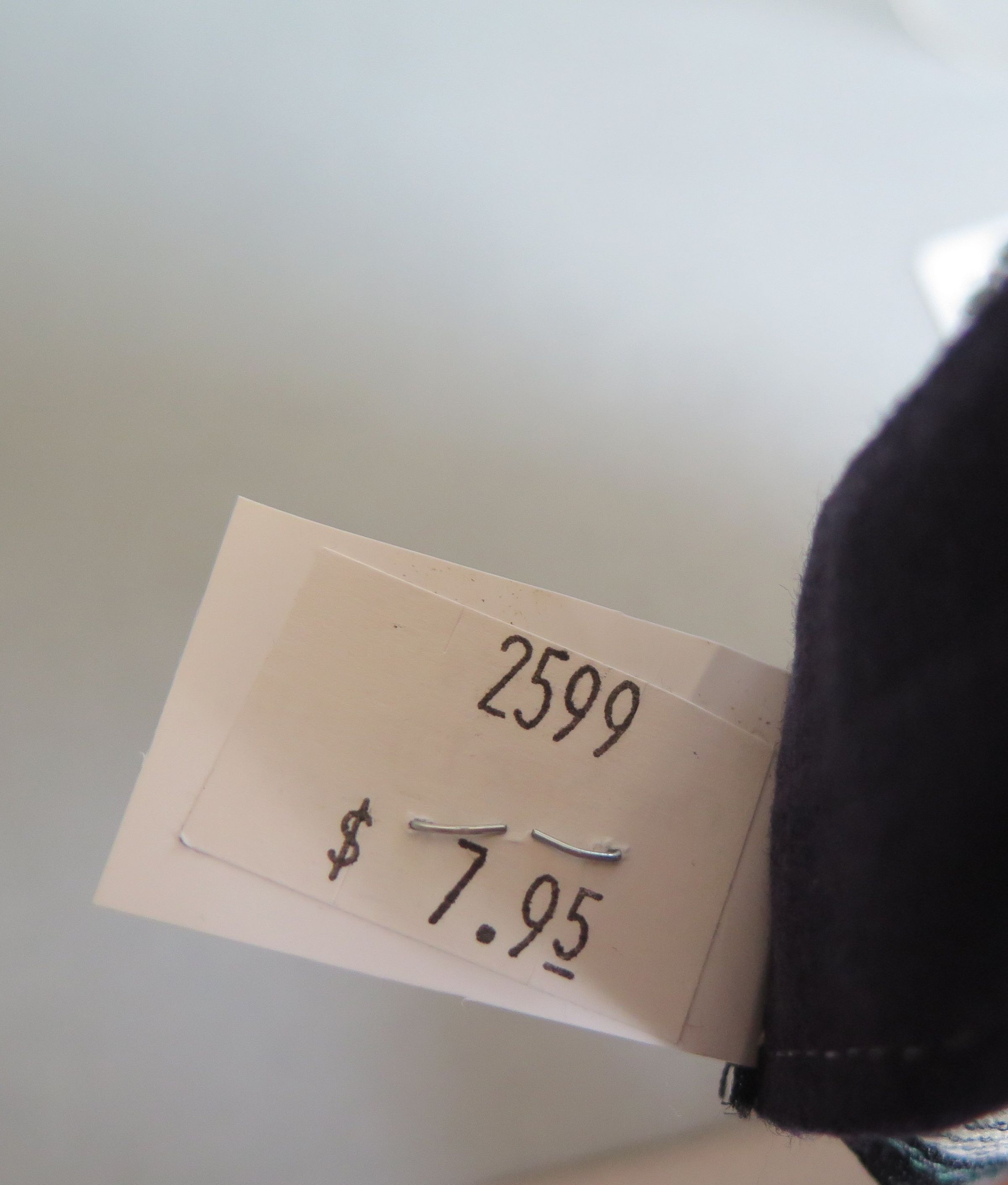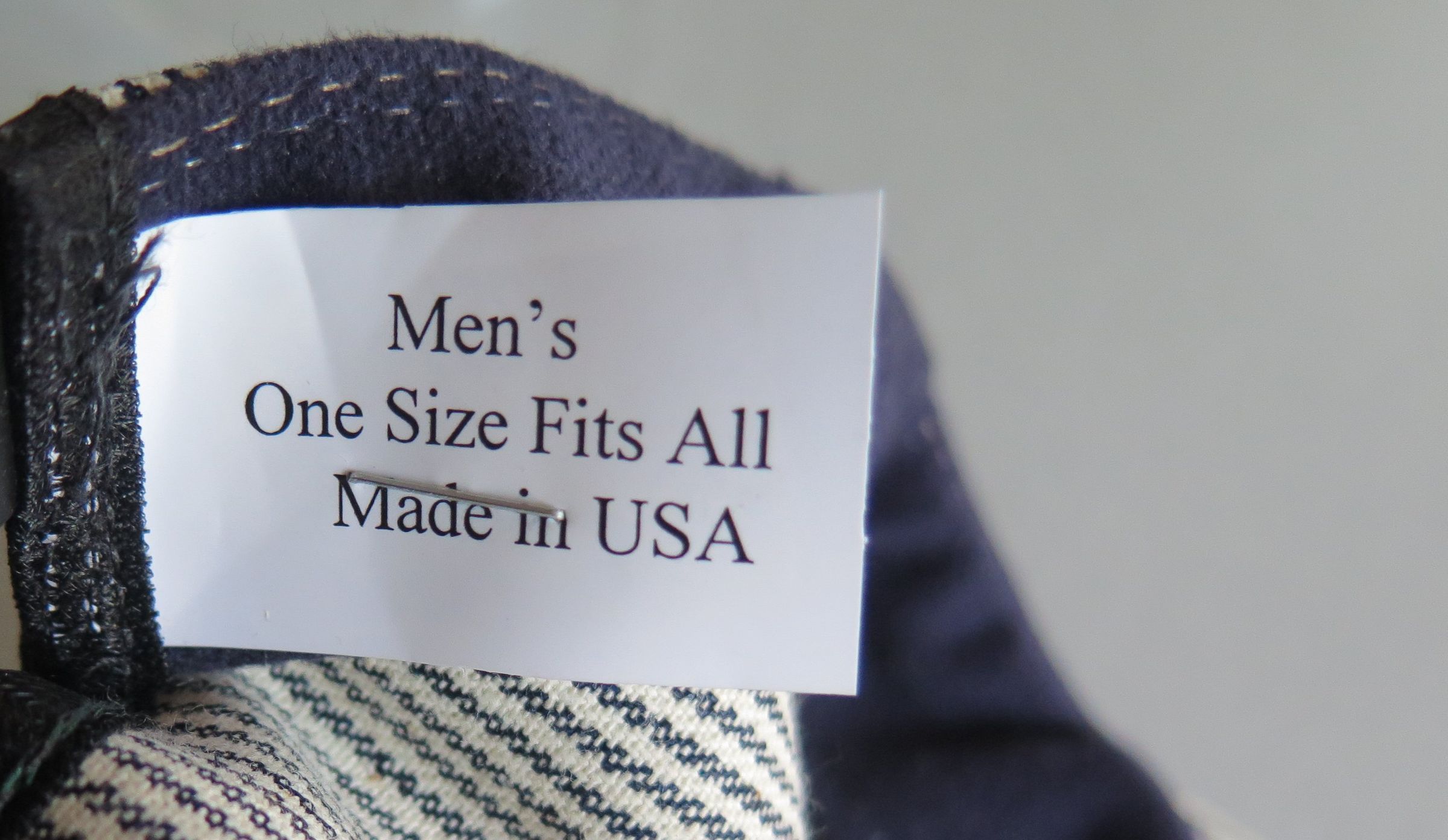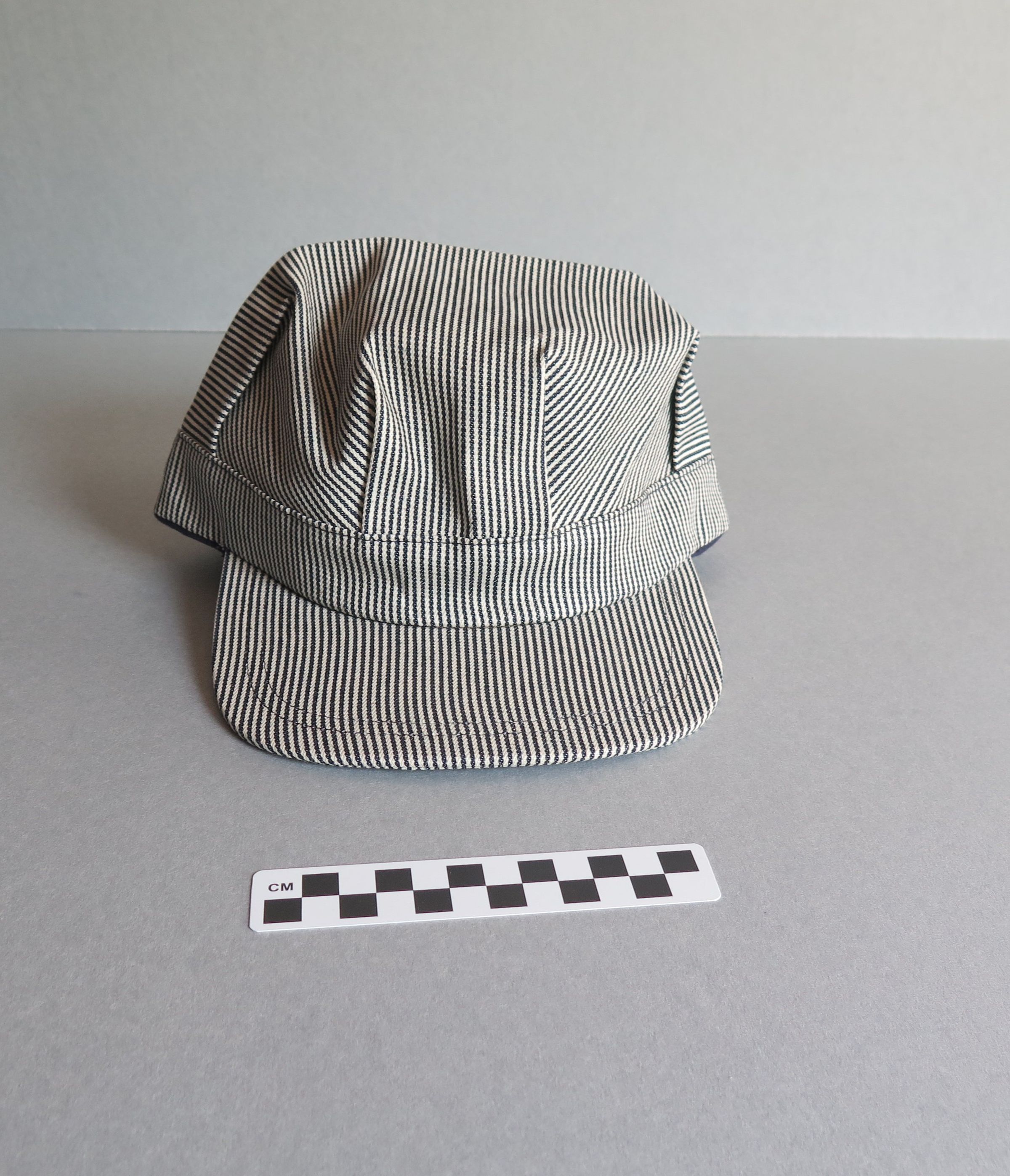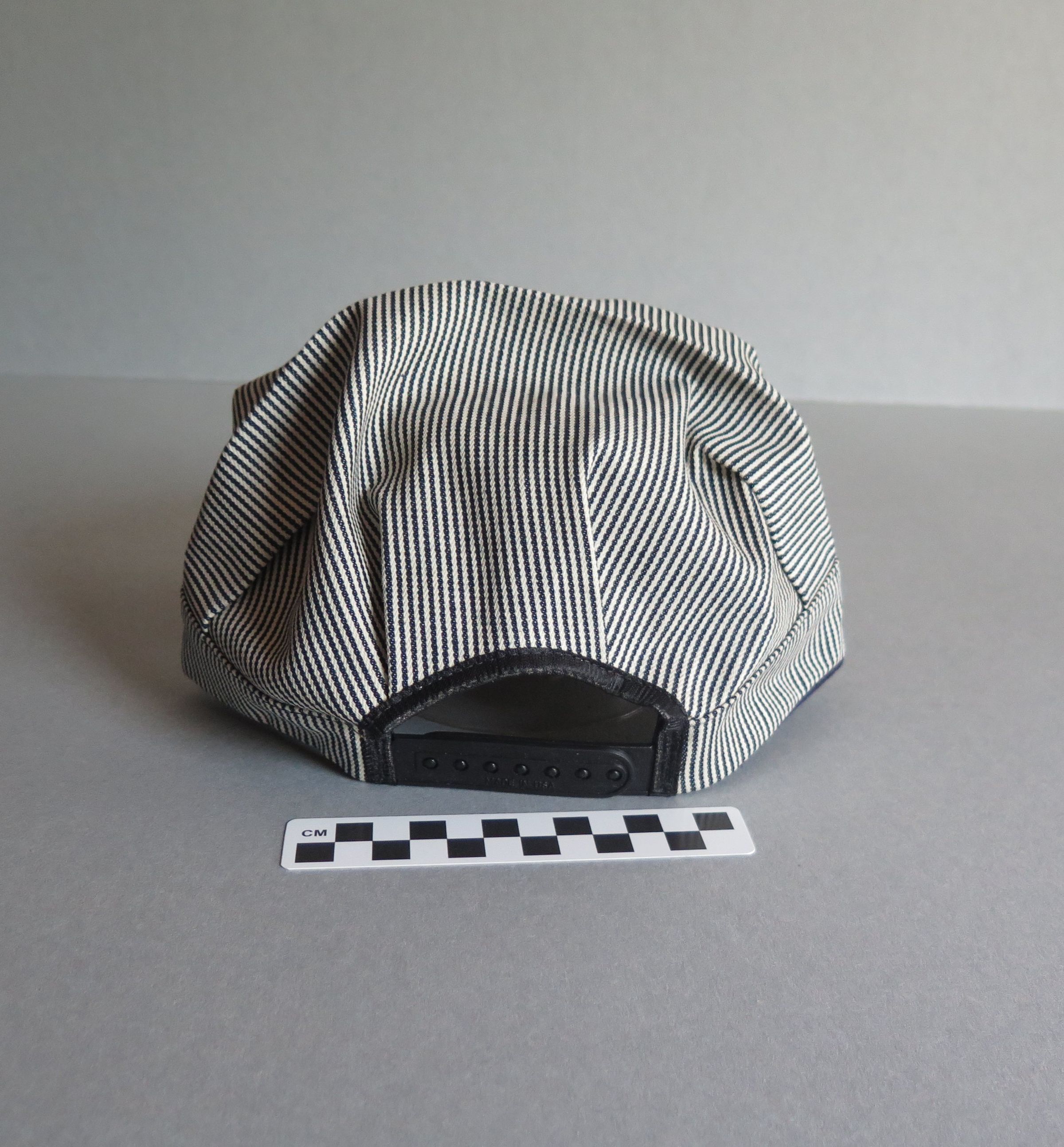 Blue and white hickory striped snapback train conductor or railroad engineer style hat. The top of the hat is pleated above the rim of the hat. The back of the hat is adjustable in size, with a plastic snapping piece that read "MADE IN USA" on both sides. The white plastic tag sewn into the back inside of the hat is printed in black ink "Men's One Size Fits All/ Made in USA." The other side reads "$7.95." The hat measures 5" (h) x 9.5" (w) x 10.5" (l).