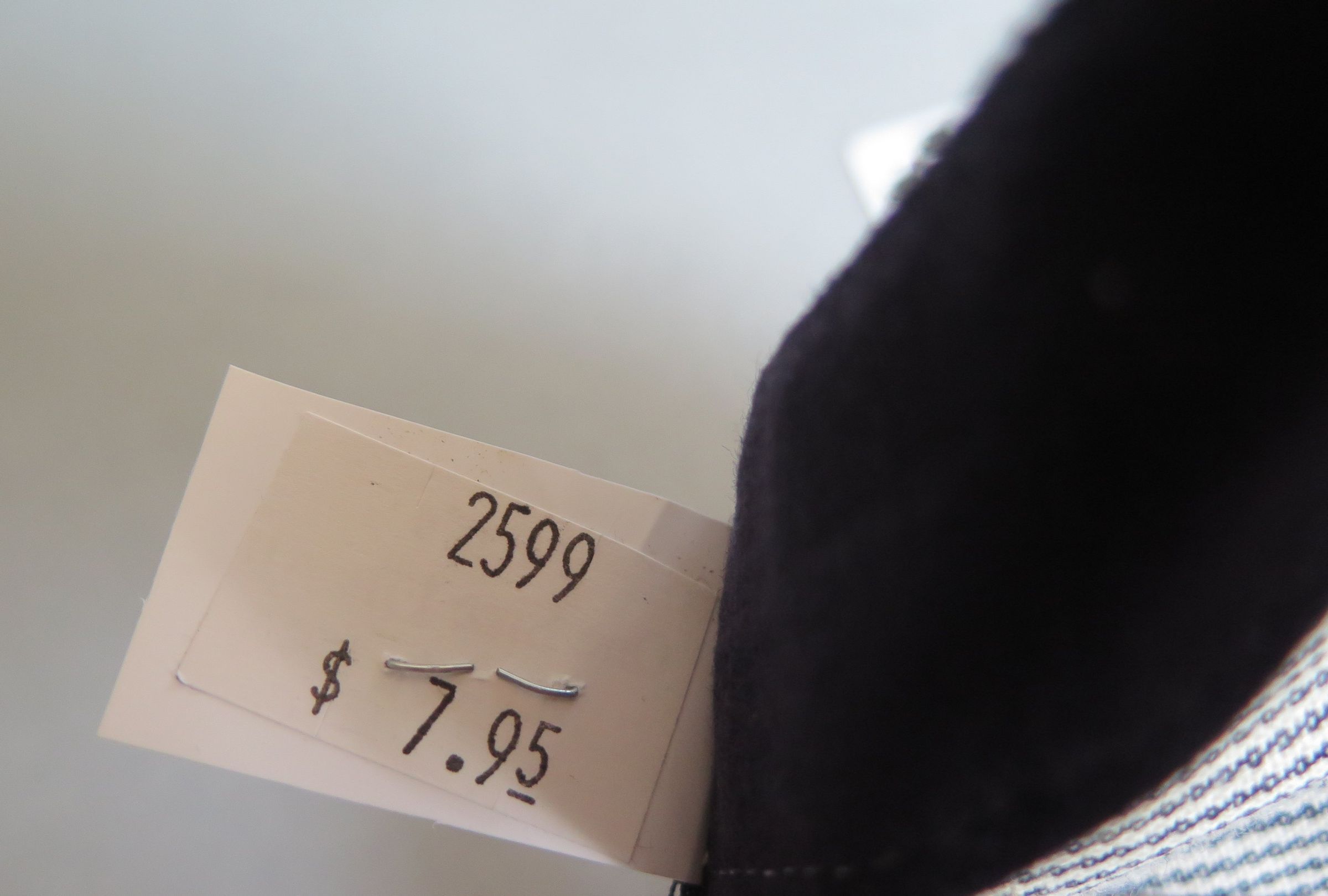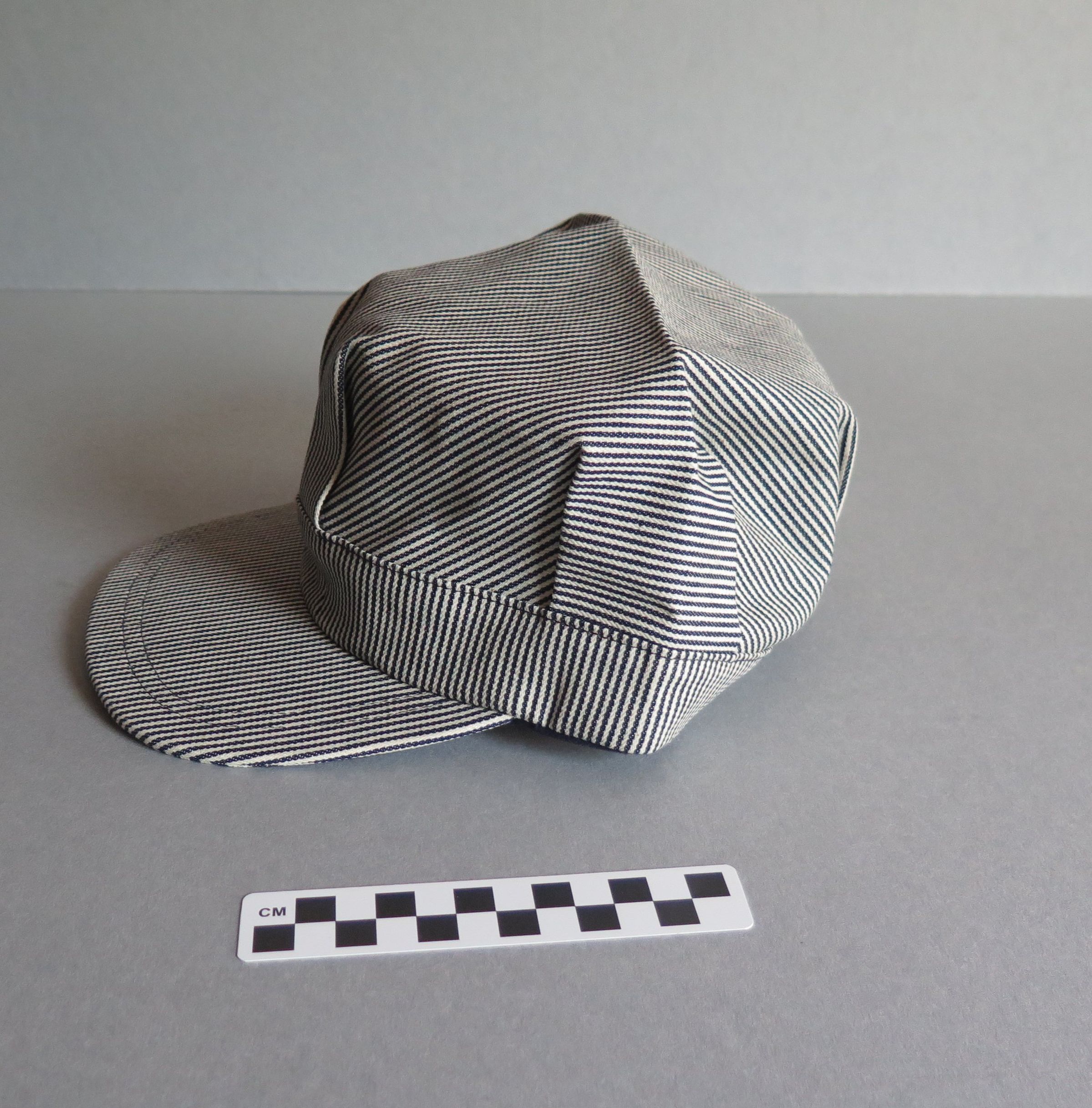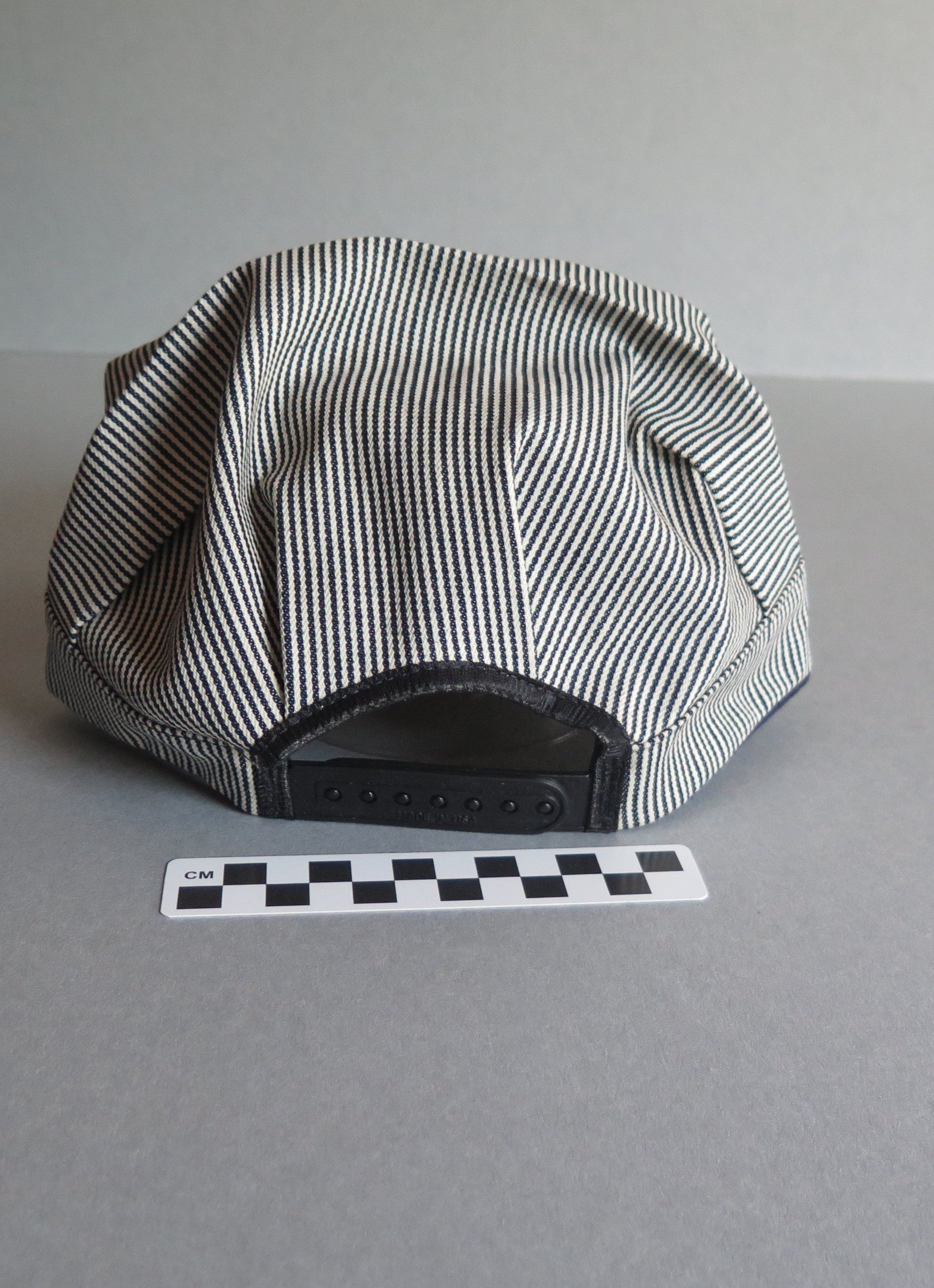 Blue and white hickory striped snapback train conductor or railroad engineer style hat. The top of the hat is pleated above the rim of the hat. The back of the hat is adjustable in size, with a plastic snapping piece that read "MADE IN USA" on both sides. The white plastic tag sewn into the back inside of the hat is printed in black ink "Men's One Size Fits All/ Made in USA." The other side reads "$7.95." The hat measures 5" (h) x 9.5" (w) x 10.5" (l).