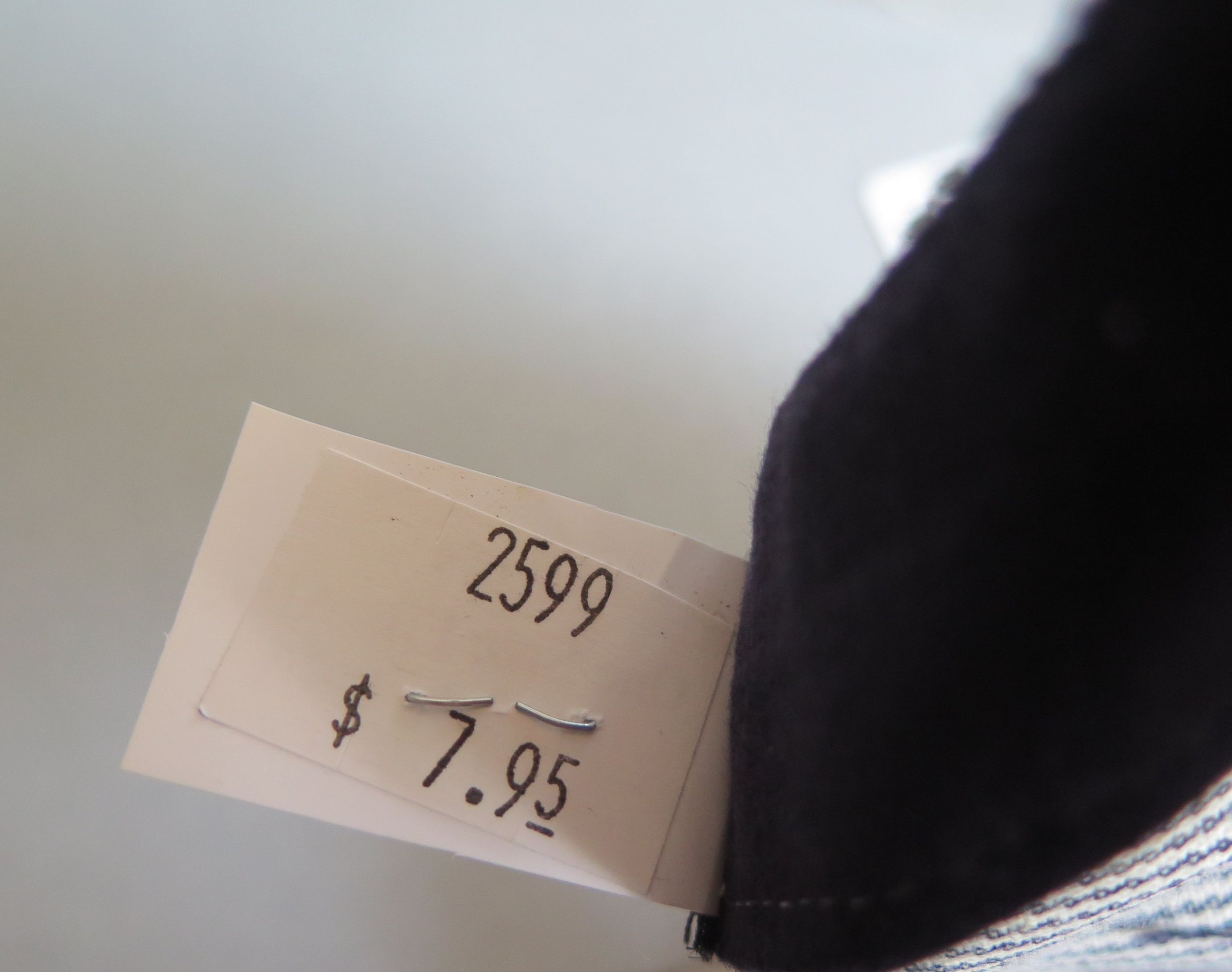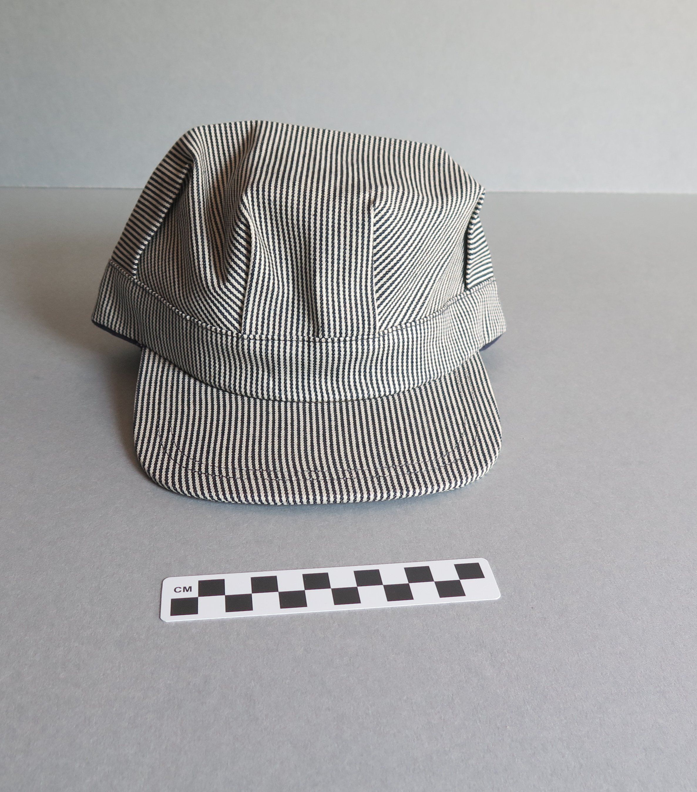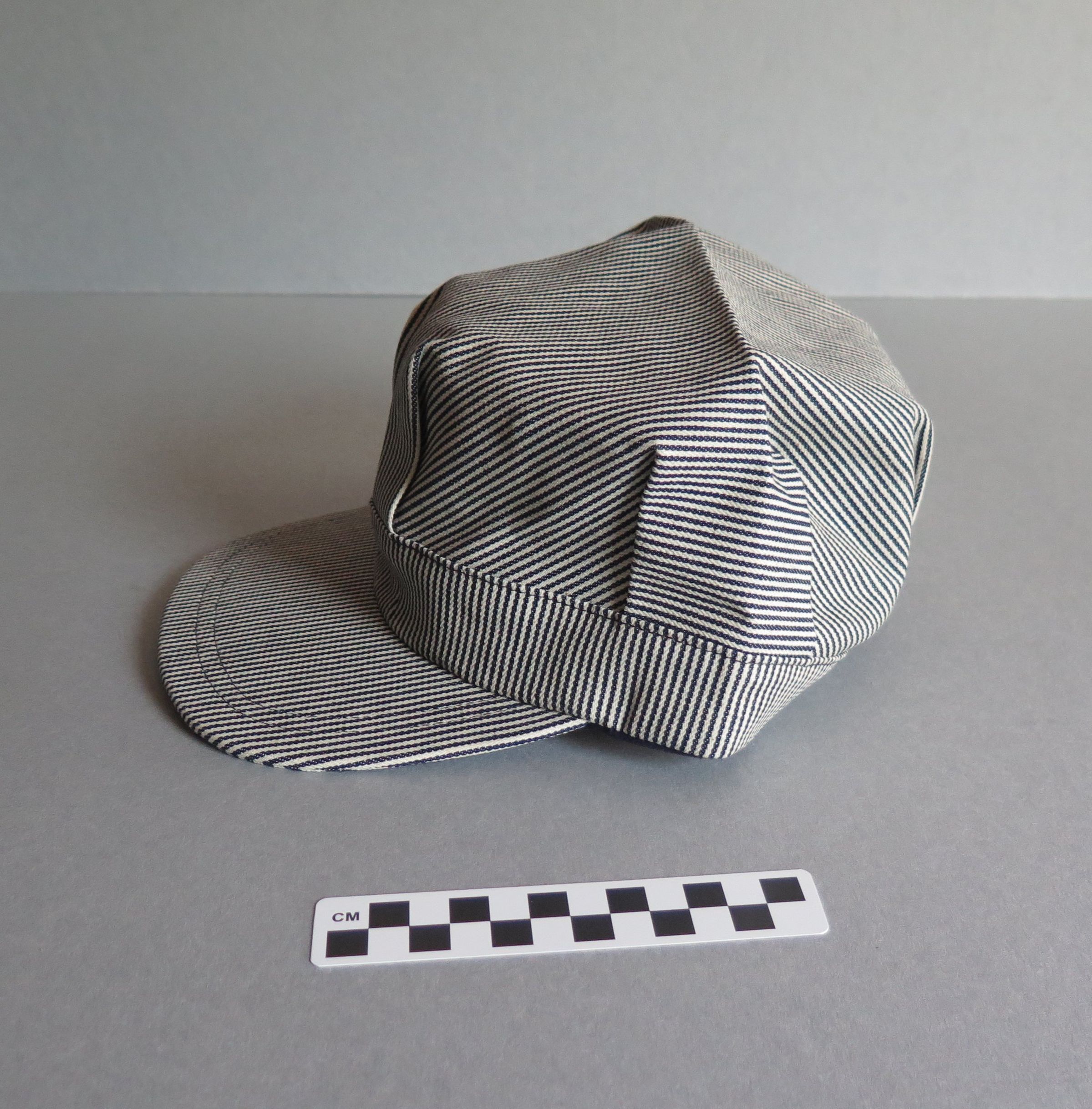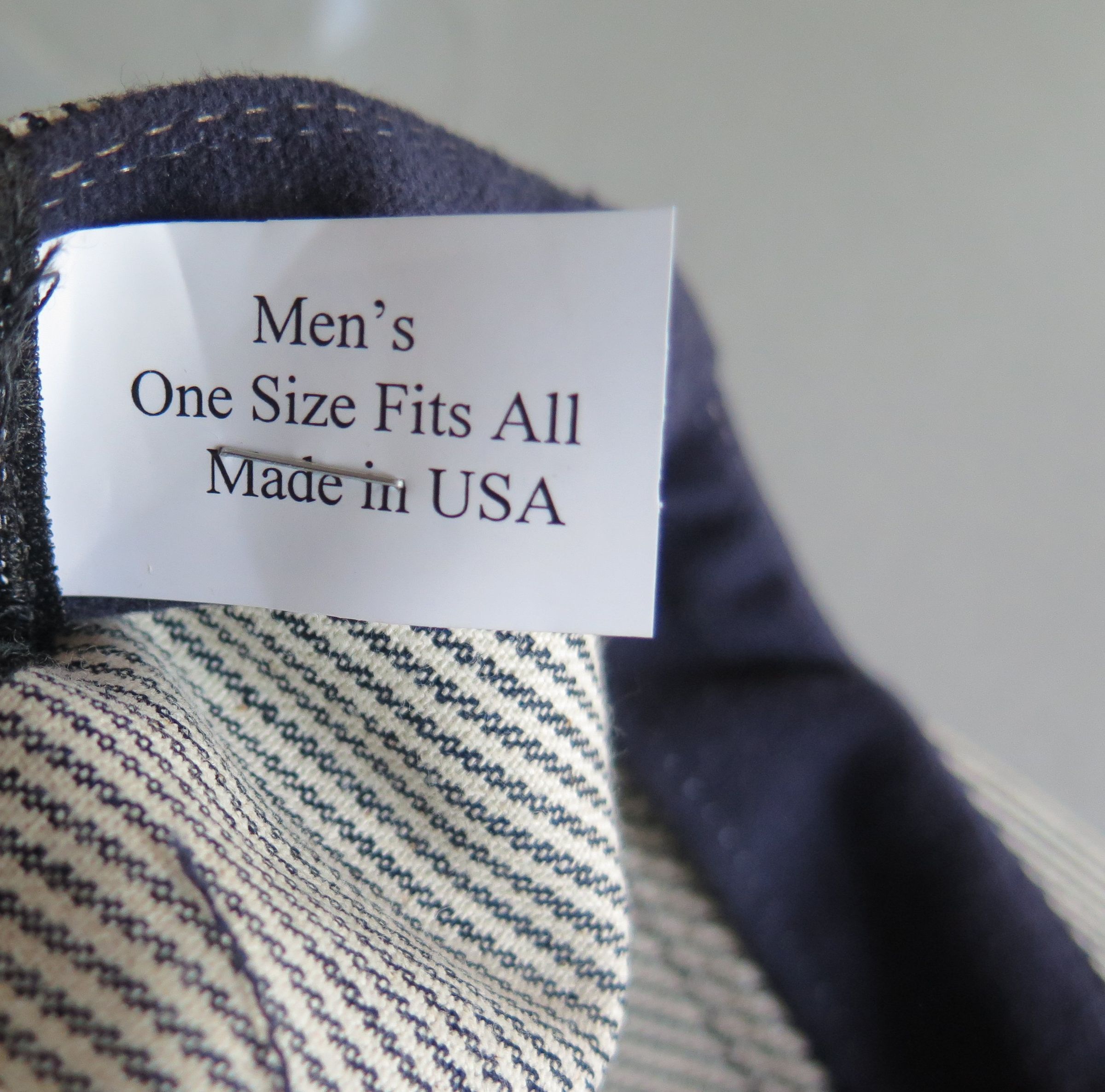 Blue and white hickory striped snapback train conductor or railroad engineer style hat. The top of the hat is pleated above the rim of the hat. The back of the hat is adjustable in size, with a plastic snapping piece that read "MADE IN USA" on both sides. The white plastic tag sewn into the back inside of the hat is printed in black ink "Men's One Size Fits All/ Made in USA." The other side reads "$7.95." The hat measures 5" (h) x 9.5" (w) x 10.5" (l).
