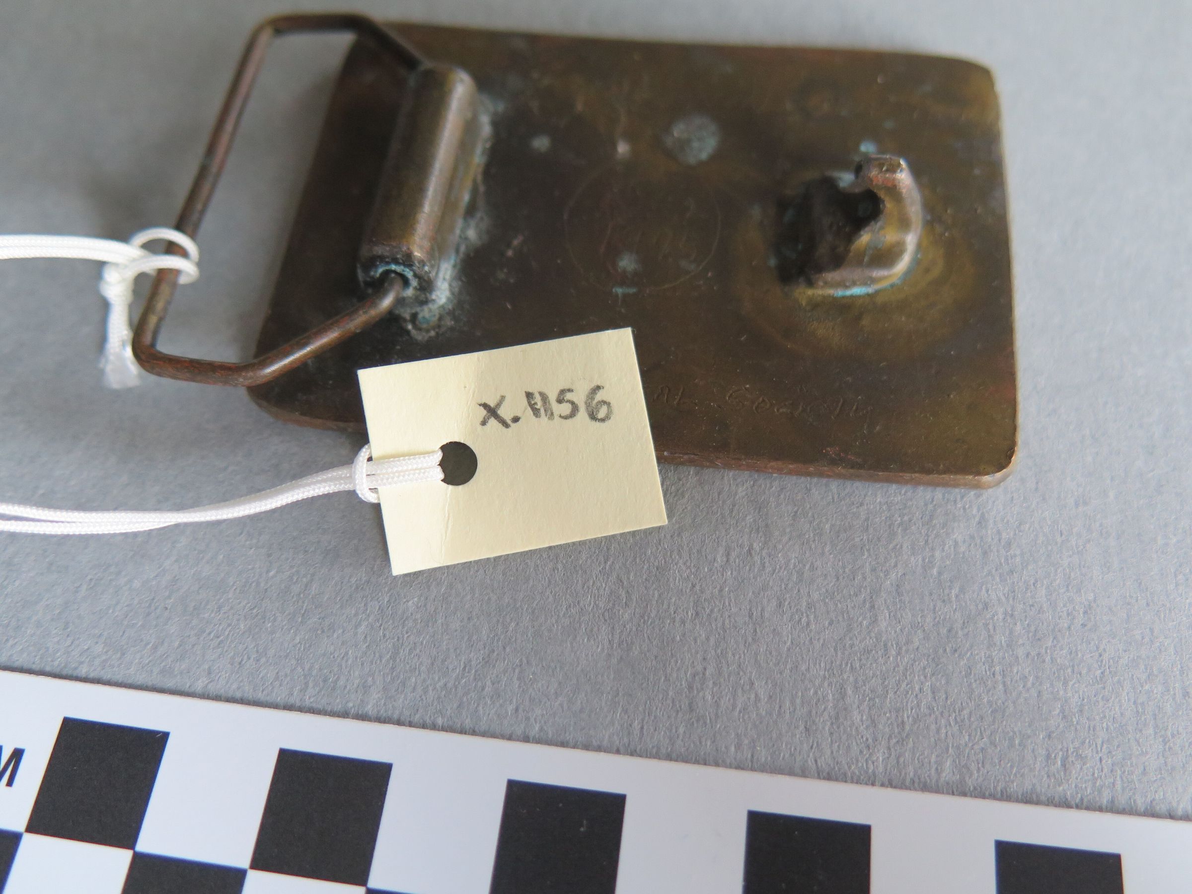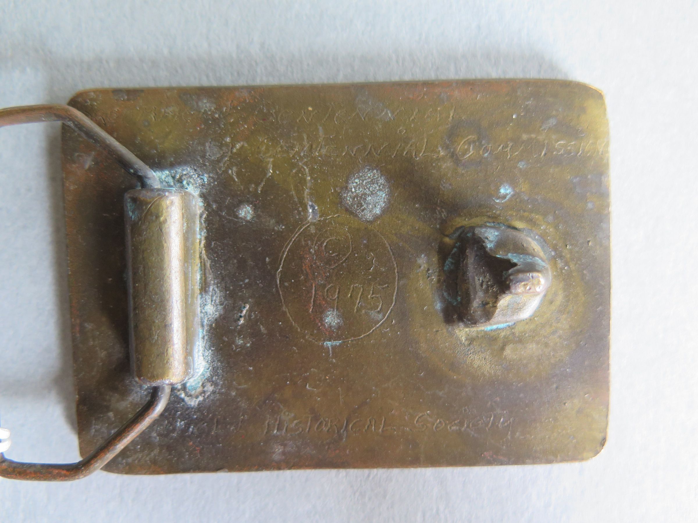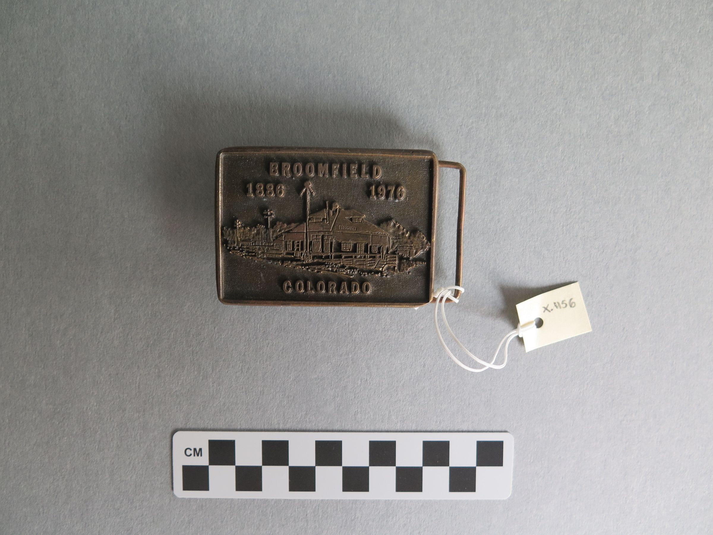 This is a brass belt buckle with the image of the Depot on it. The belt buckle has text embossed on the front that reads, "Broomfield/ 1886 1976/ Colorado". Engraved into the back of the belt buckle is the text, "Broomfield Centennial/ Bicentennial Commission/ 1975/ Broomfield Historical Society". The belt buckle measures 2.25" (h) x 3" (w).