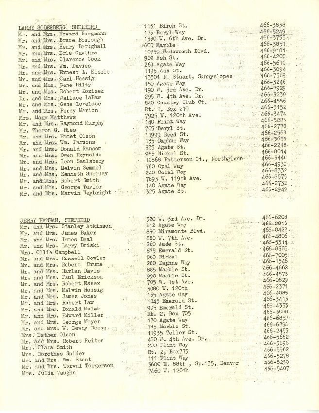 Further information about the Shepherd program from the Broomfield United Methodists. Document contains lists of Shepherd groups, addresses, and phone numbers. 3 pages, typed, front and back.Collection