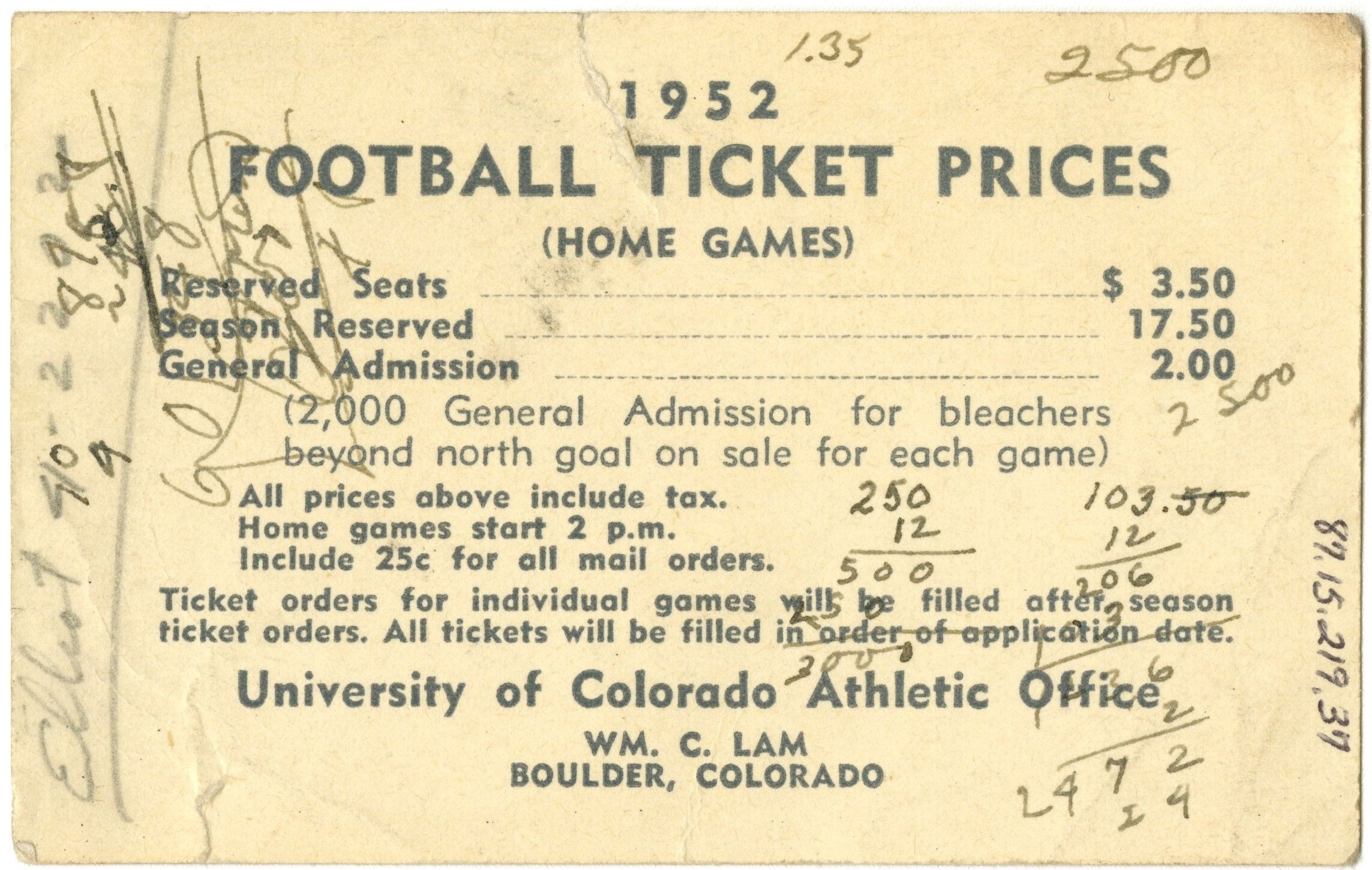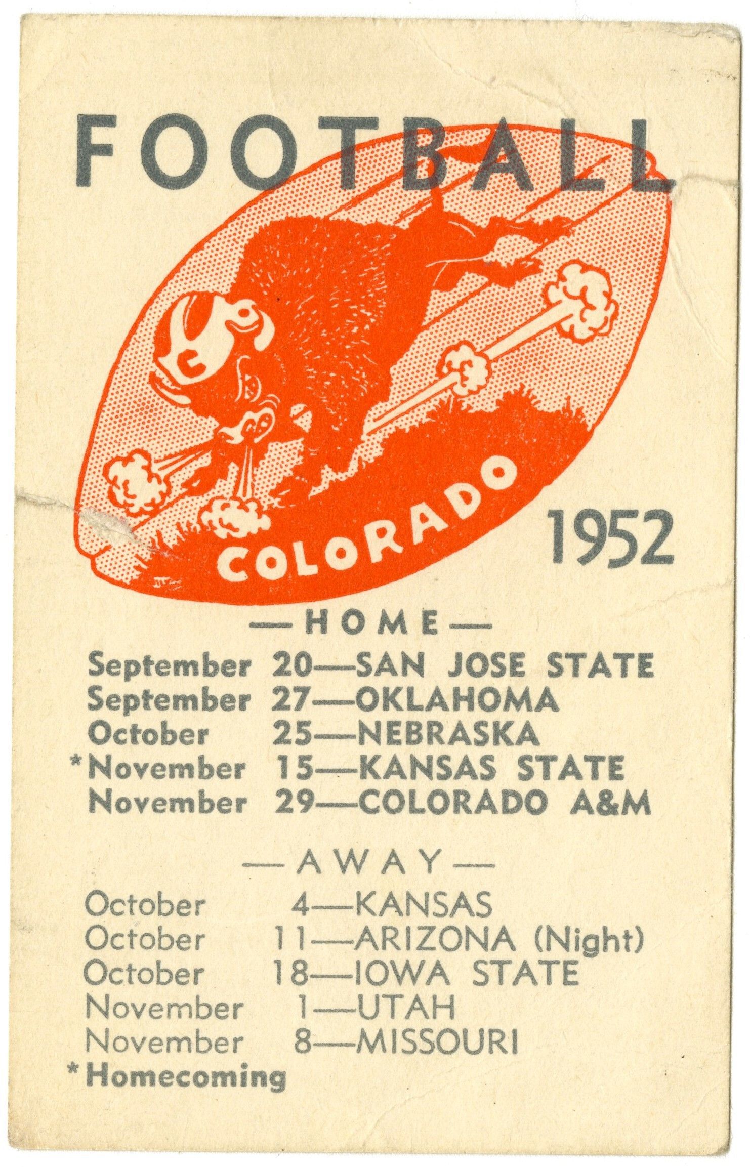 Small card with football schedule, 1952. On front, orange picture of a buffalo on a football, with the word "Colorado." Listed home and away games. On back, Football Ticket Prices for home games. Also pencil markings.Collection