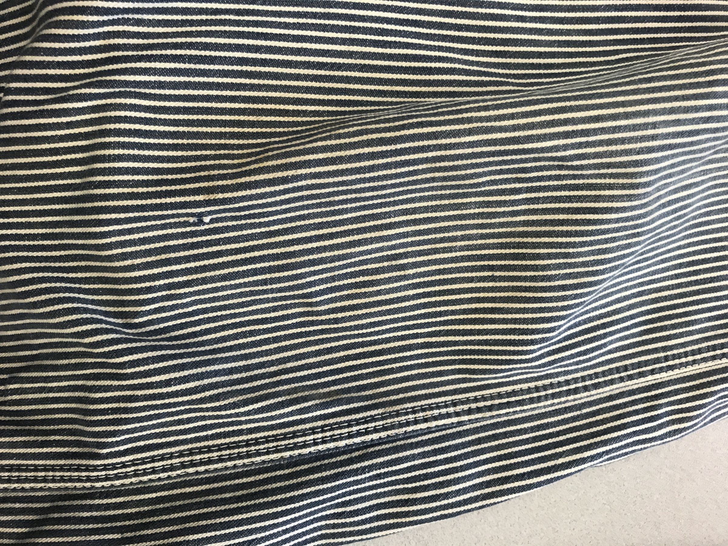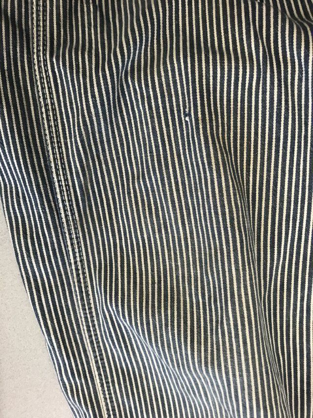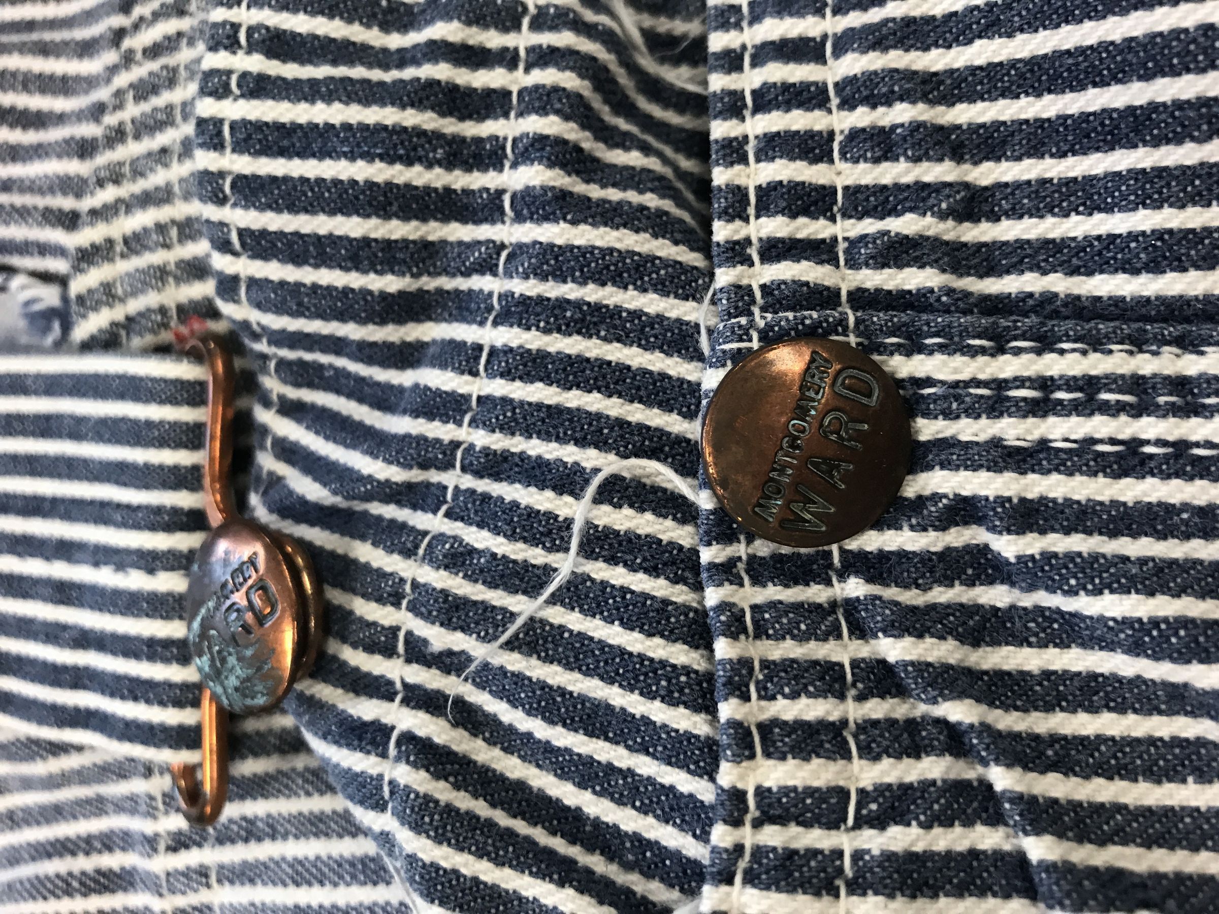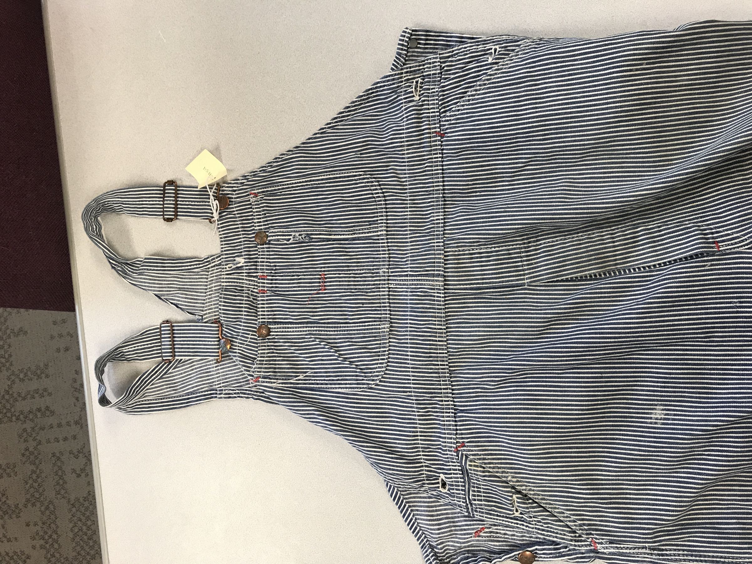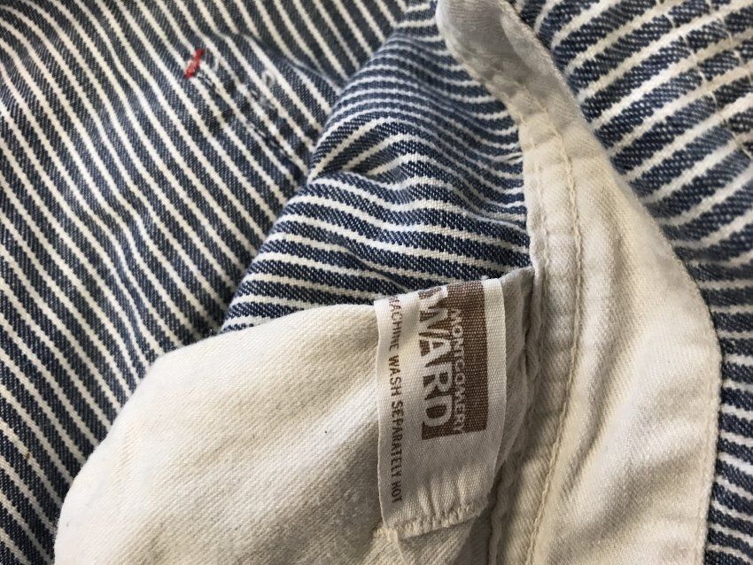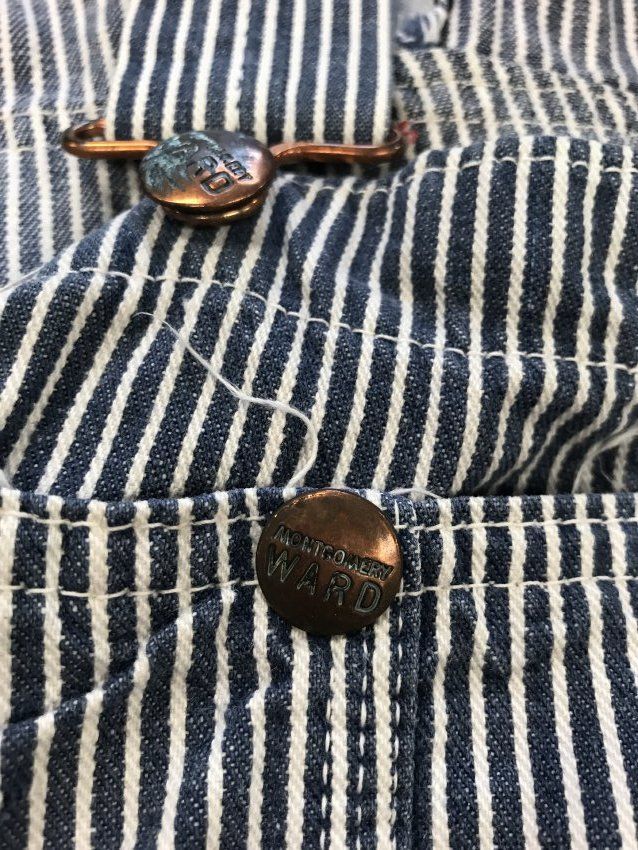 This is a pair of Montgomery Ward brand Hickory striped overalls. The overalls have light blue and white stripes vertical stripes printed all over. There are 2 straps to hold the overalls up. These straps do not cross in the back. Overalls like these would have been worn by railroad carpenters. The overalls measure 23.5" (w) x 59" (l).