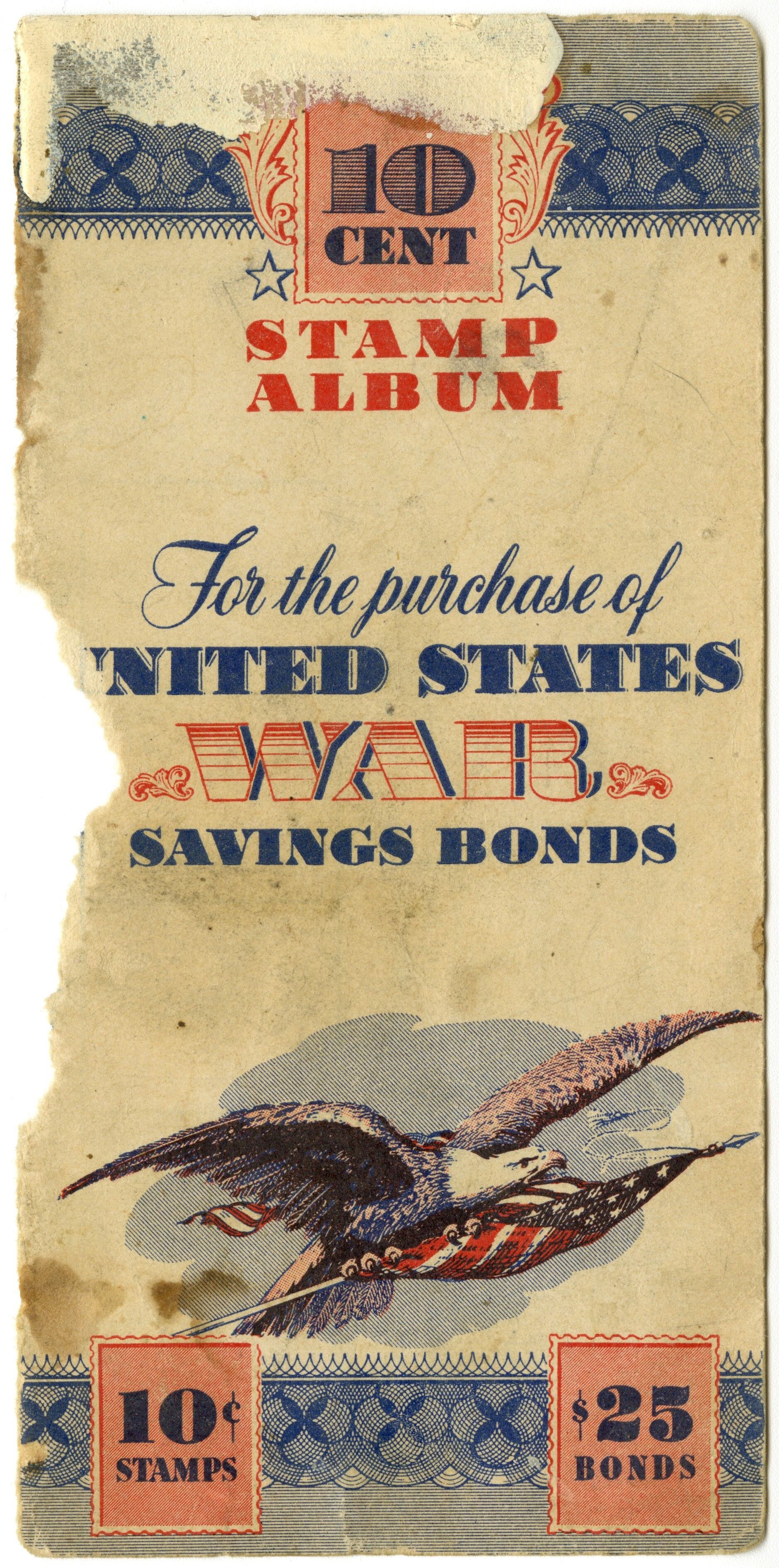 10 Cent Stamp Album, For the Purchase of United States War Saving Bonds. Eagle carrying a flag above a 10c Stamps image and a $25 Bonds image.