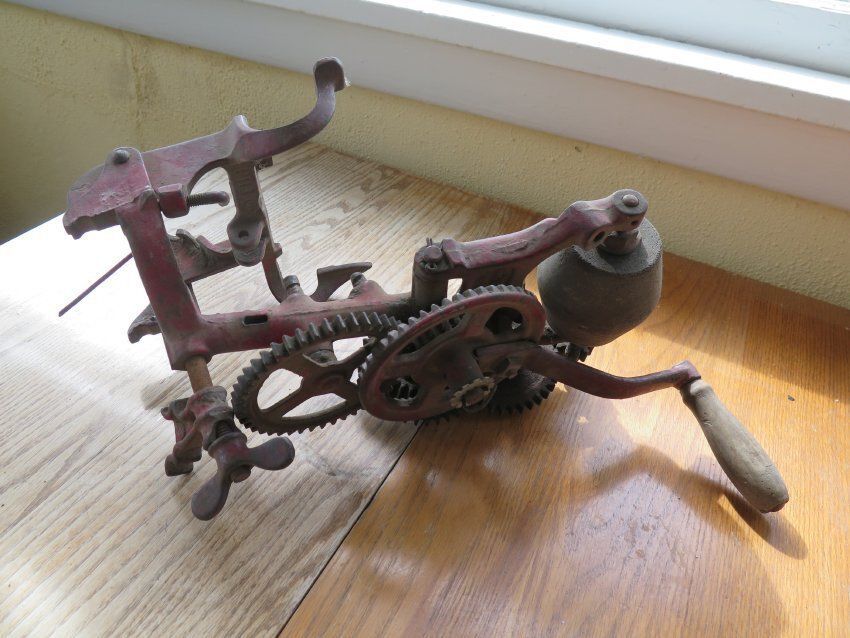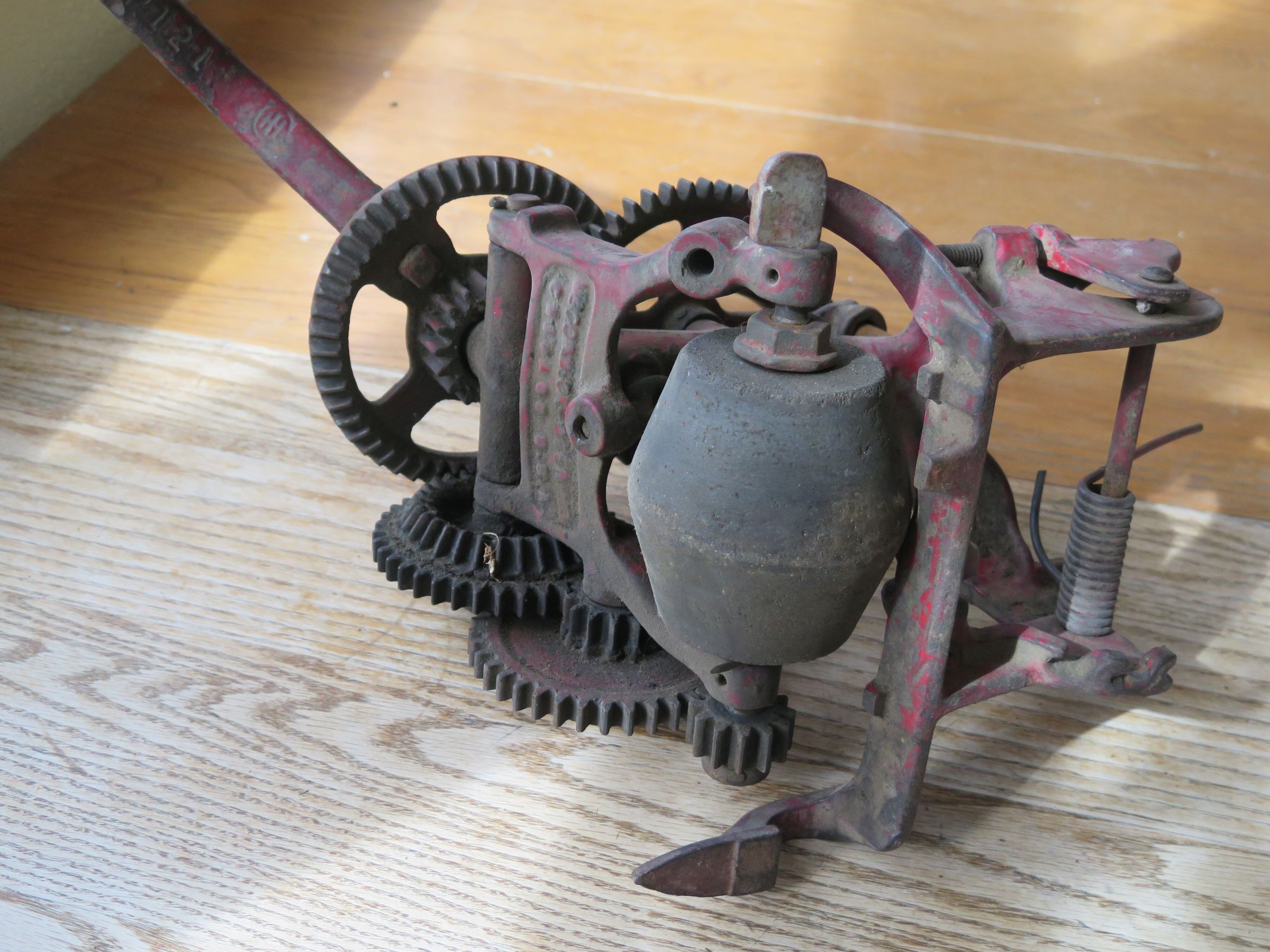 This is a painted red metal sickle mower grinder that mounts on the side of a sickle mower to sharpen the blade. The mower knife grinder was made by McCormick-Deering. The text embossed on the mower knife grinder reads, "McCormick-Deering/ Chicago U.S.A.". The mower knife grinder measures 11.5" (h) x 9" (w) x 20" (l).