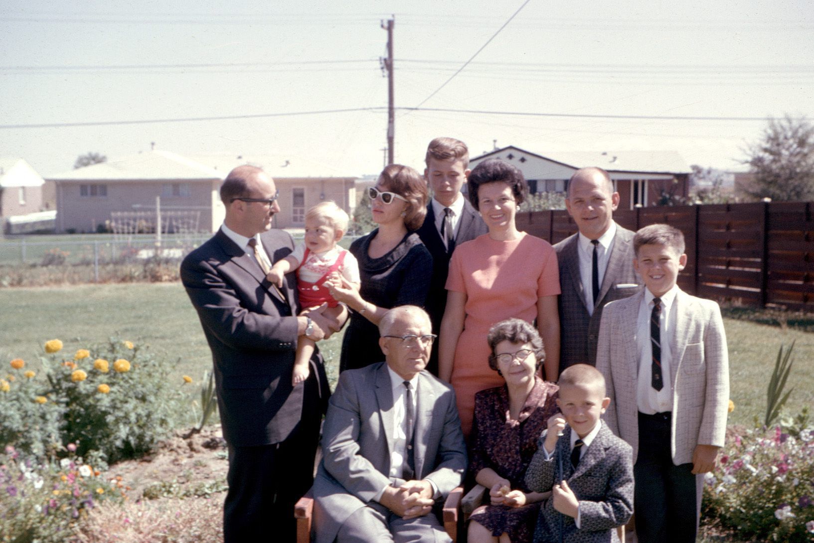 Color photograph of a family in a backyard. An older gentleman and an older woman are sitting in chairs, while everyone else stands. The man on the left side of the image is holding a baby. All the people are dressed nicely in dresses or suits.