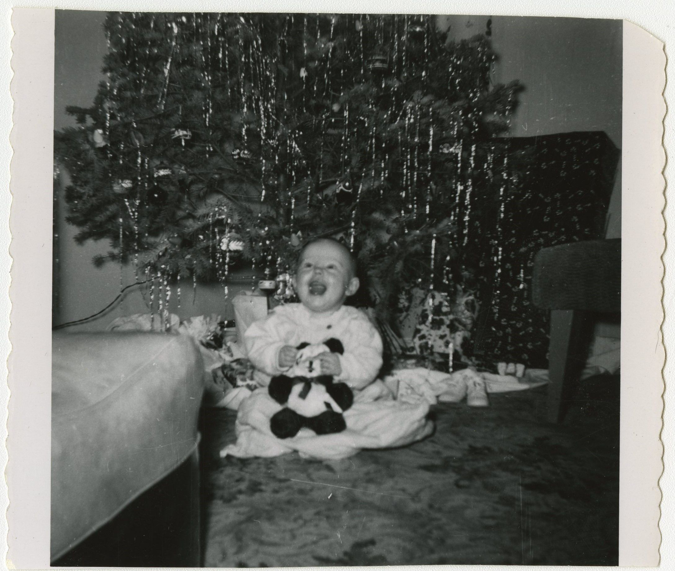 Black and white photograph of a baby in front of a Christmas tree. Baby is holding a teddy bear.