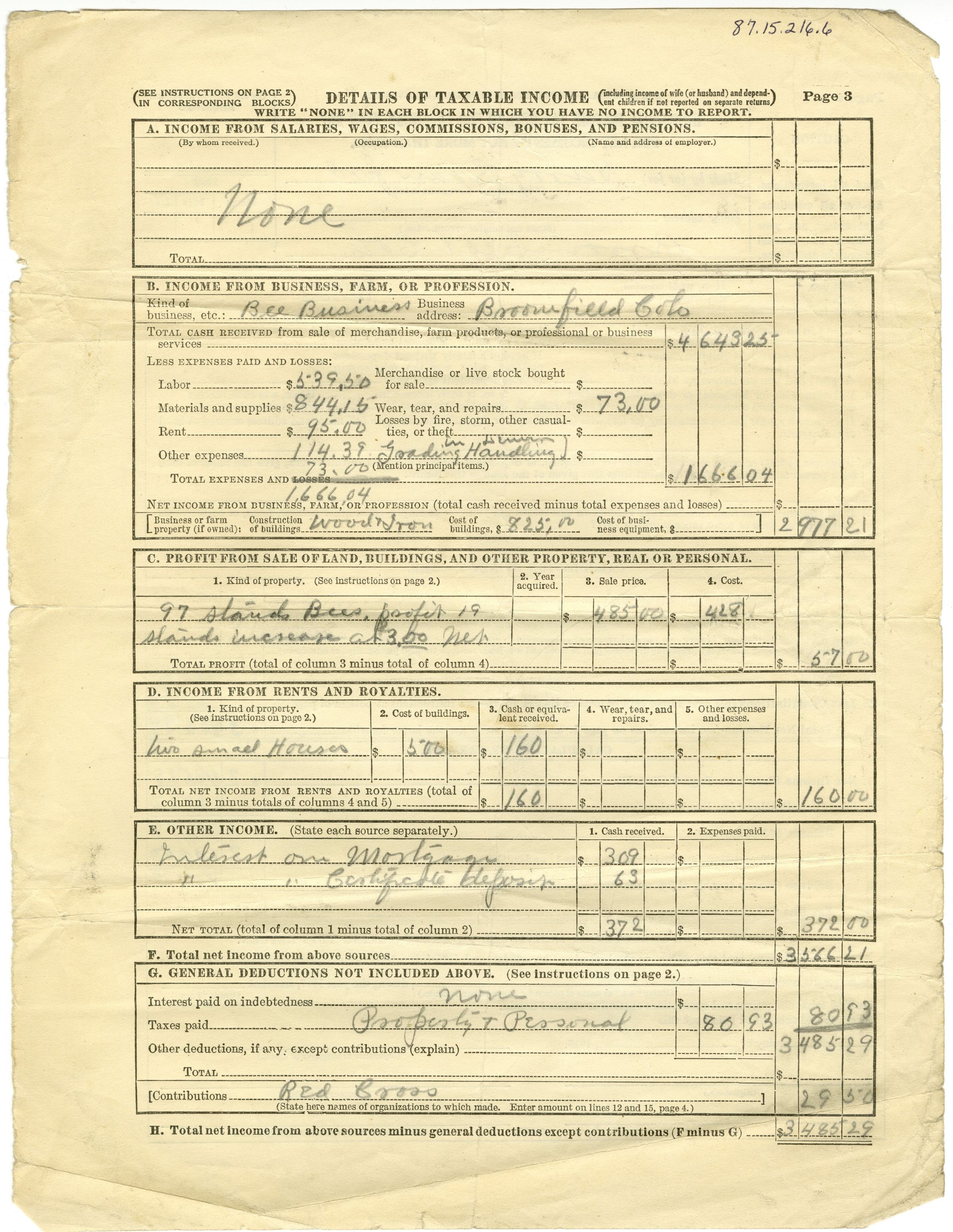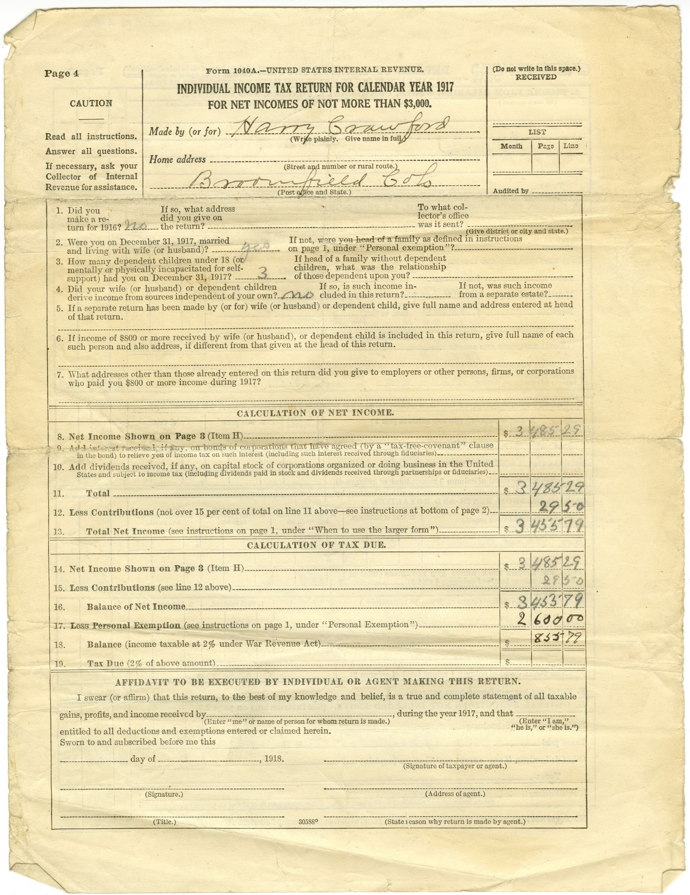 Individual Income Tax Return for Calendar Year 1917. Made by Harry Crawford, Broomfield Colo, for Bee Business.