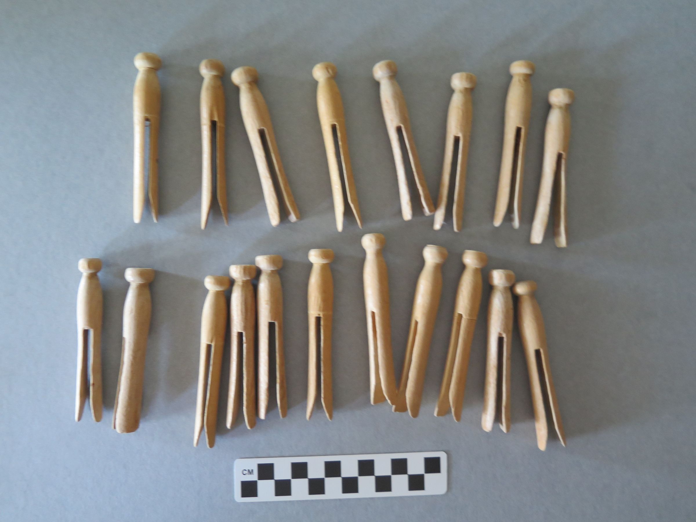 This is a set of 19 wood clothespins. The clothespins have a round top and feet that flare out at the bottom. All of the clothespins are in good condition, without any wear or splits in the wood. Each clothespin measures 0.5" (w) x 4" (l) x 0.5" (d).