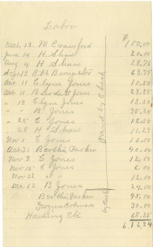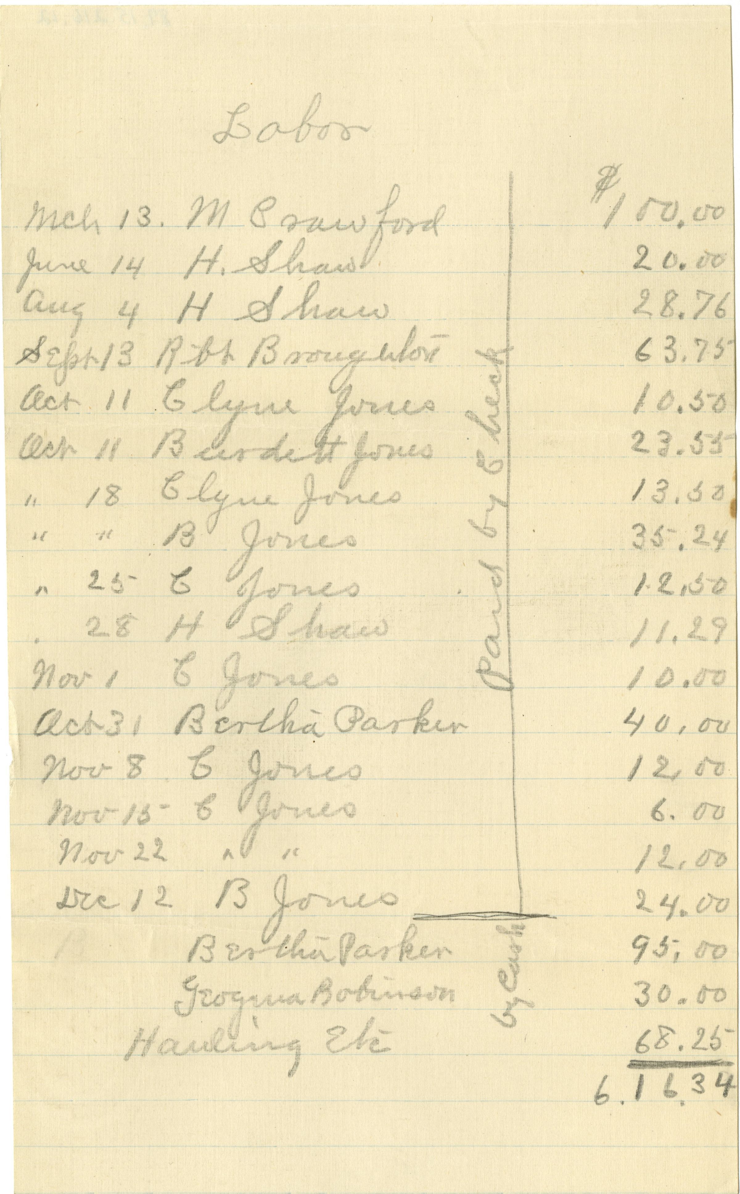 Labor list 19 lines of date, employee, and pay amount. Separated by a line saying "paid by check."