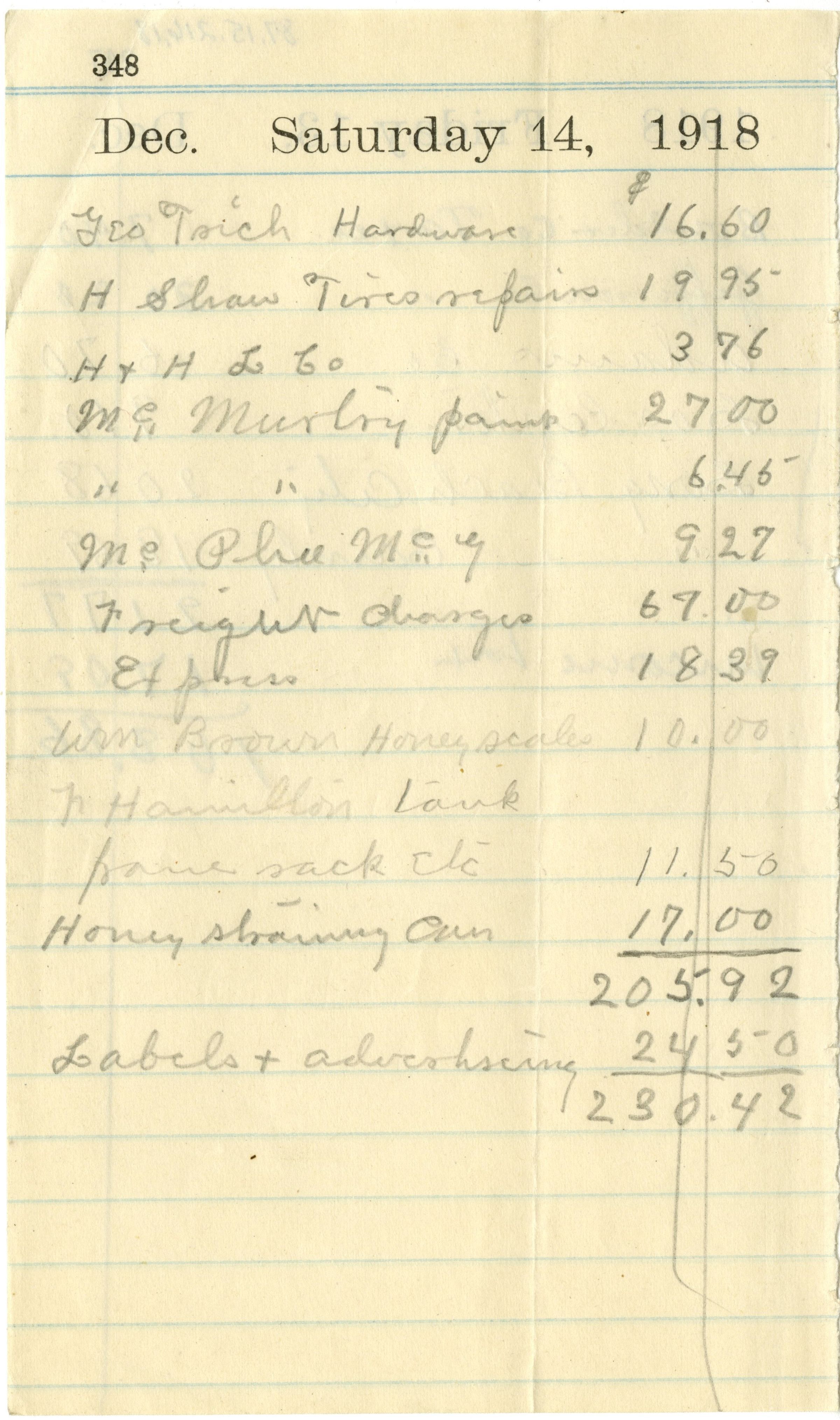 Front: Dec. Saturday 14, 1918. List of costs and numbers.