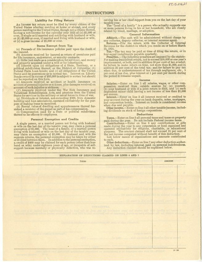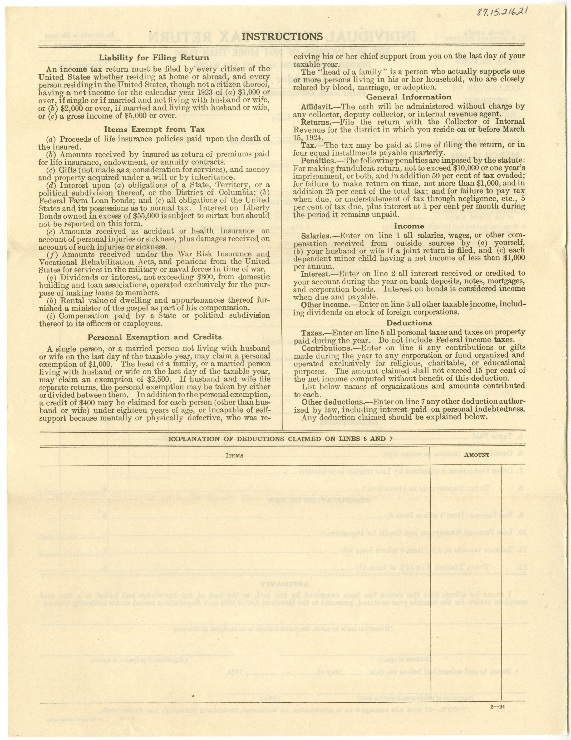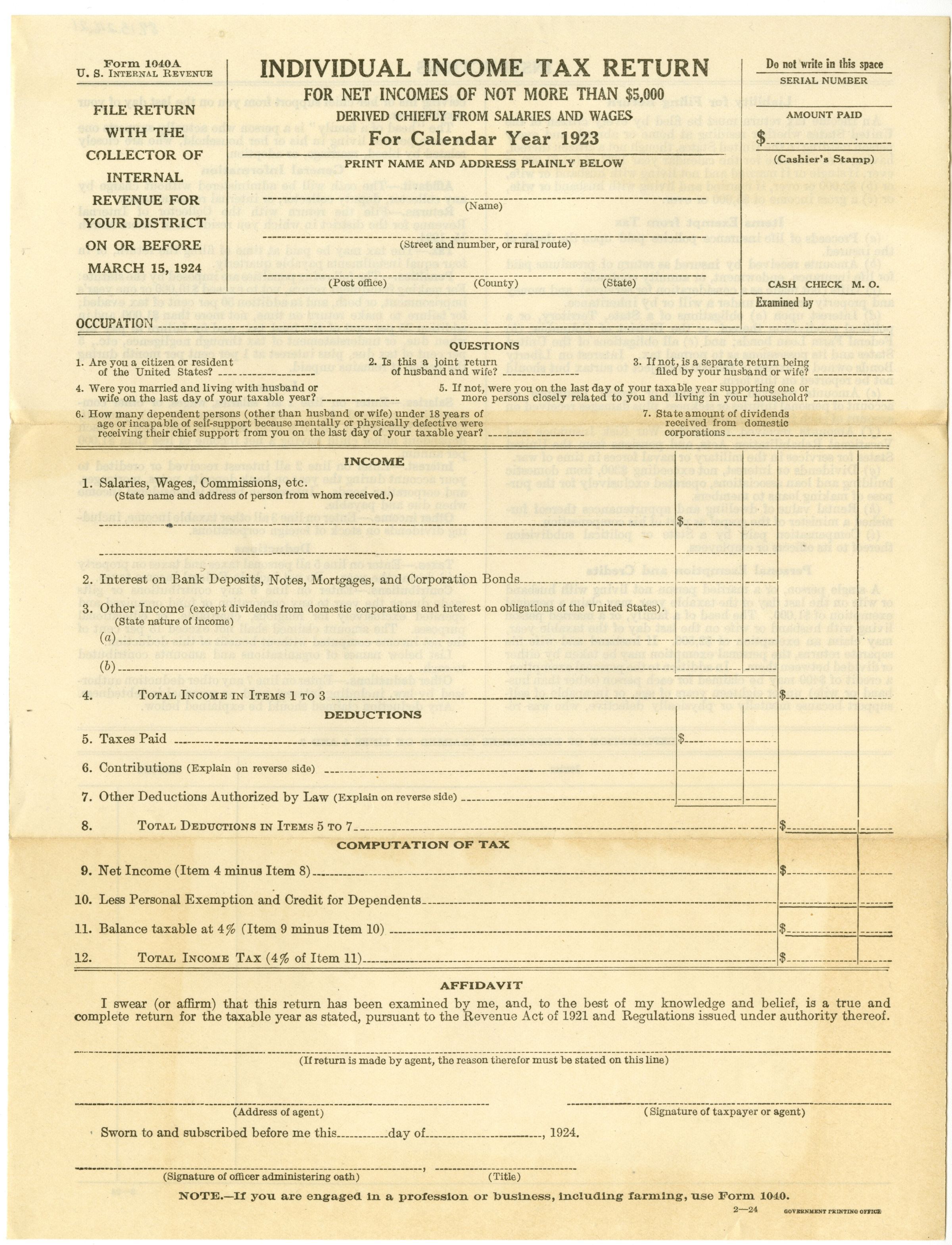 Individual Income Tax Return for Calendar Year 1923. No information filled out on page.