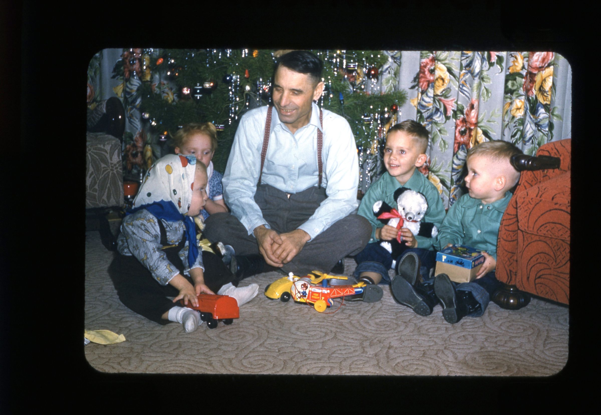 Color film still of Lester C Brunner and some of his grandchildren. Photograph was taken around Christmas at the Brunner Farmhouse.