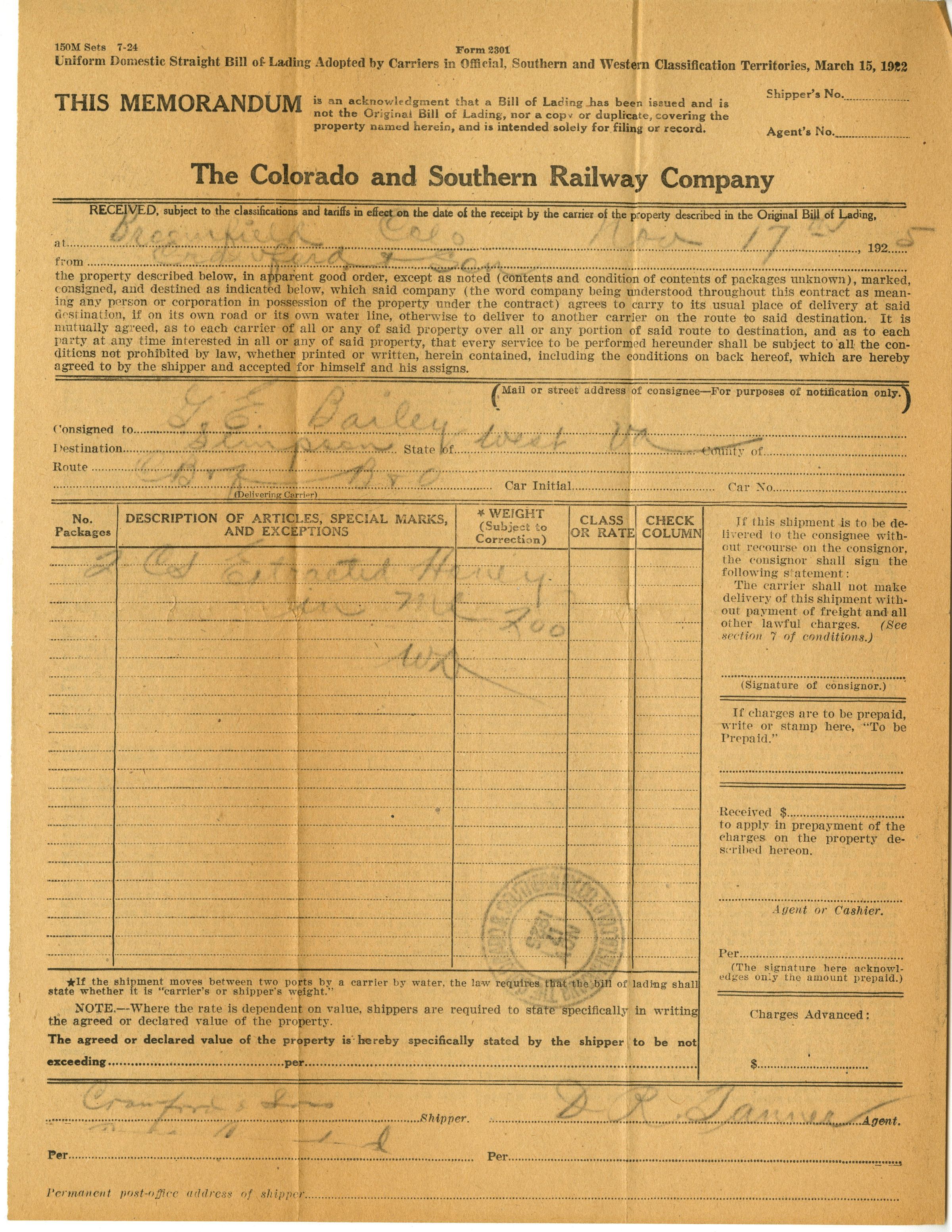 A memo acknoledging that a Bill of Landing, a contract for a shipment, has been made for The Colorado and Southern Railway Company to transport Crawford and Son Honey.