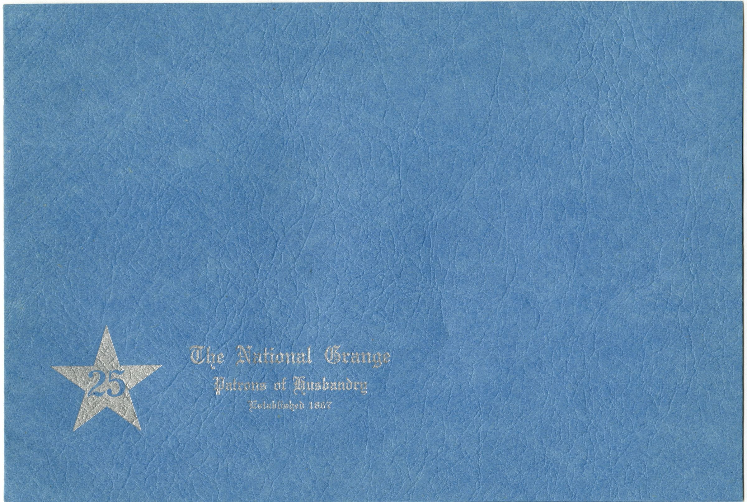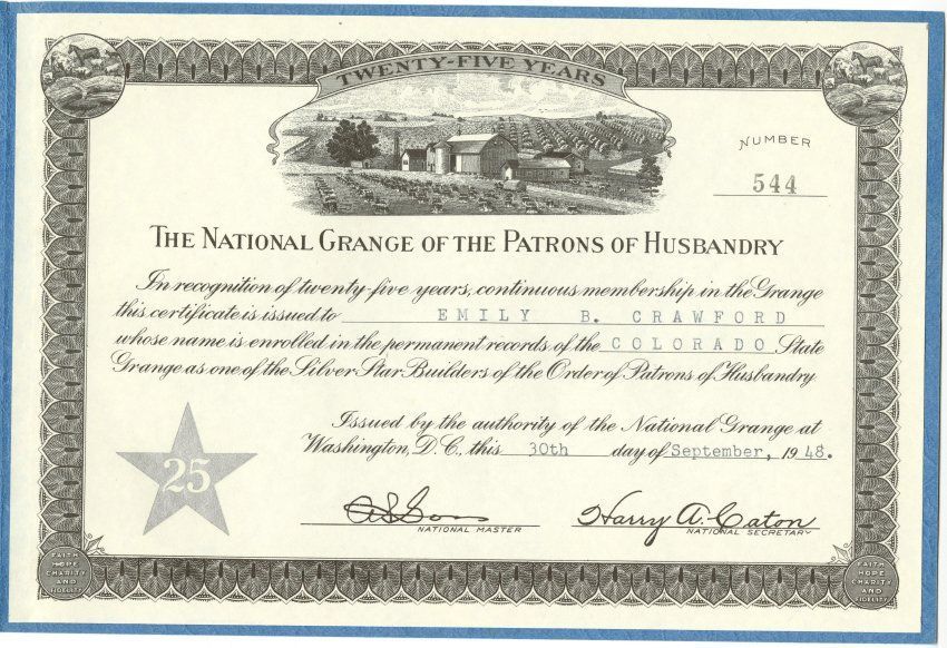 A blue folder holding a certificate from the National Grange of the Patrons of Husbandry. Recognizing 25 years membership of Emily Crawford to the Grange. Dated 30th of September, 1948.