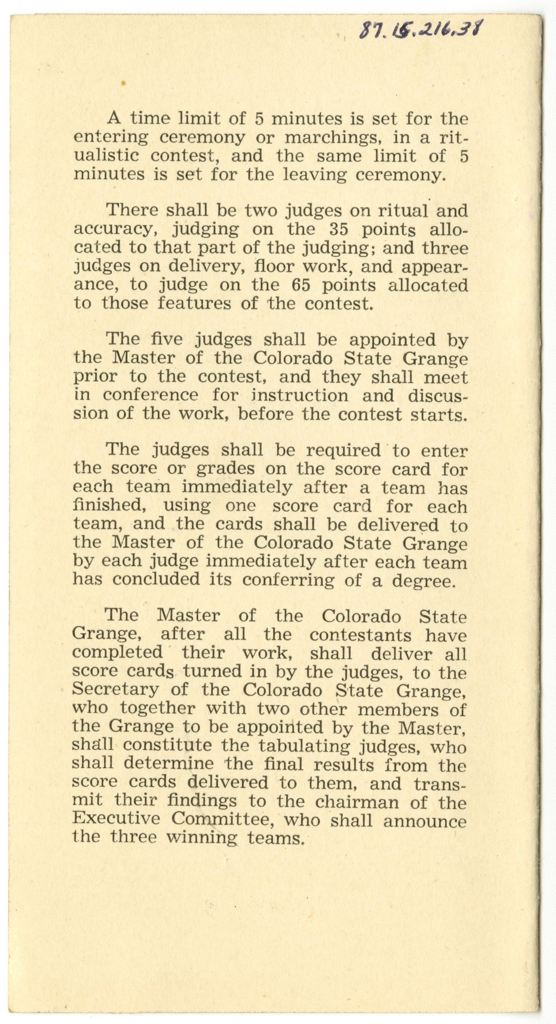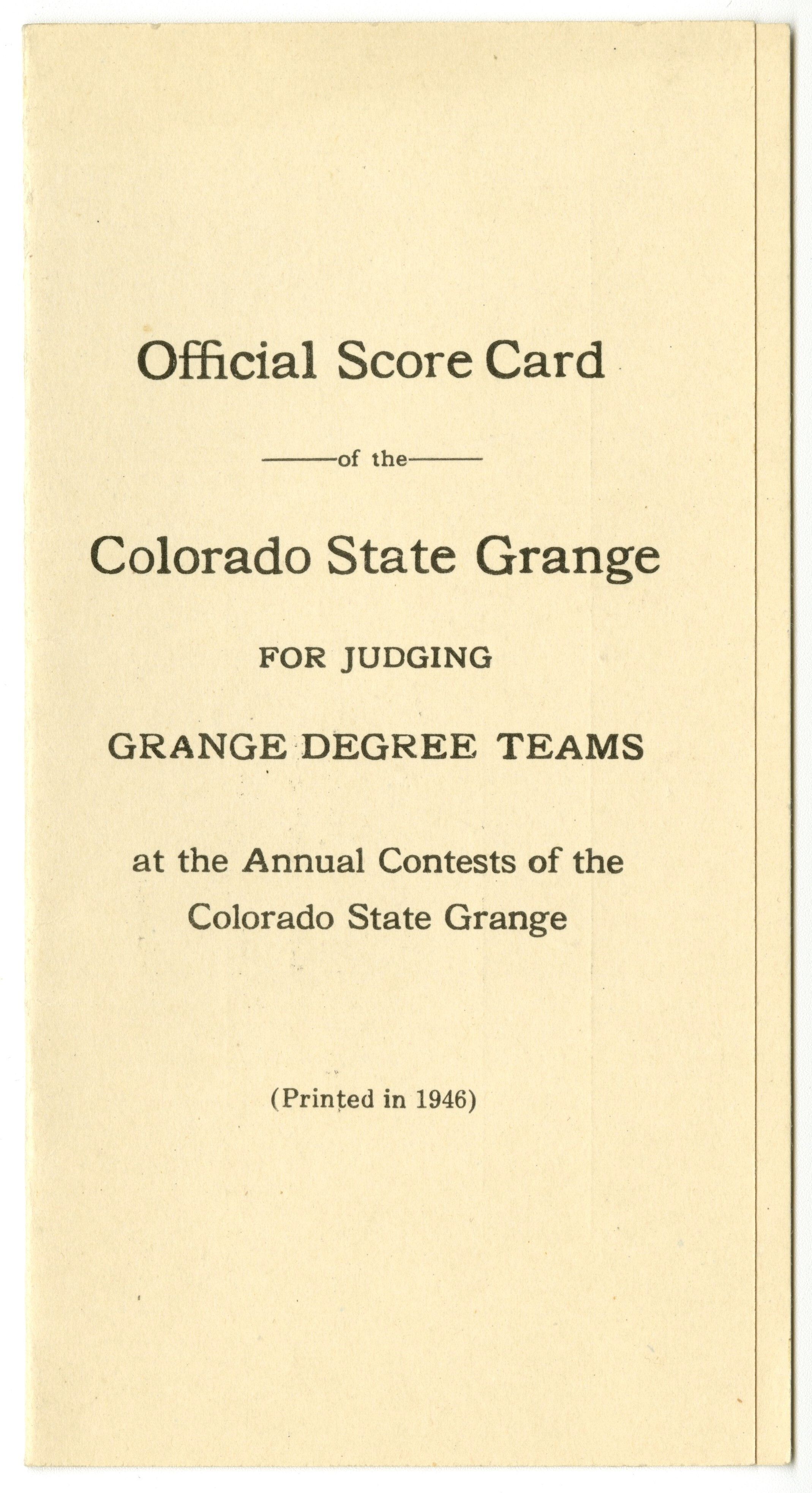 Official Score Card of the Colorado State Grange for Judging Grange Degree Teams at the Annual Contests of the Colorado State Grange. (Printed in 1946).