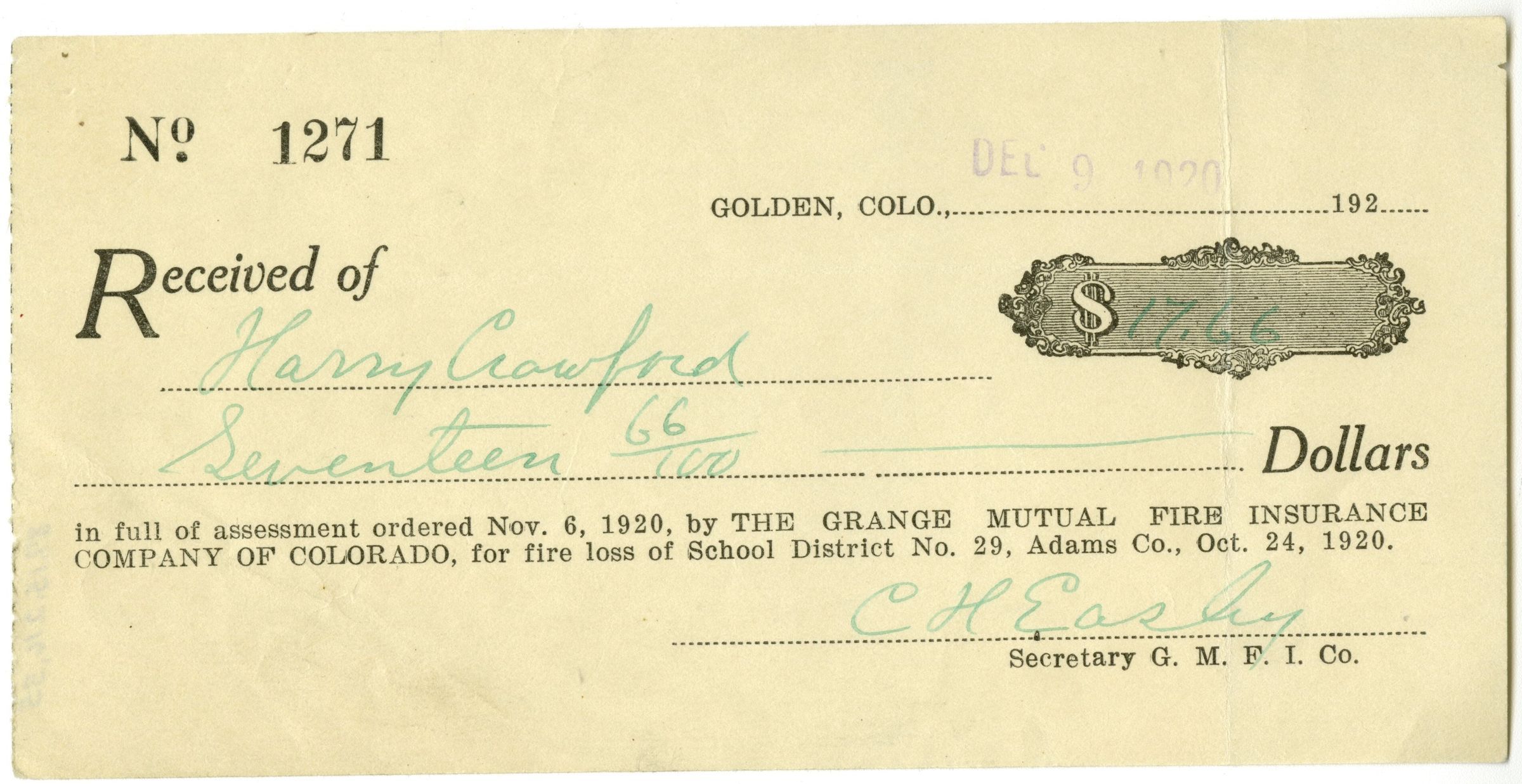Receipt of a check from Harry Crawford of $17.66, dated Dec 9, 1920.