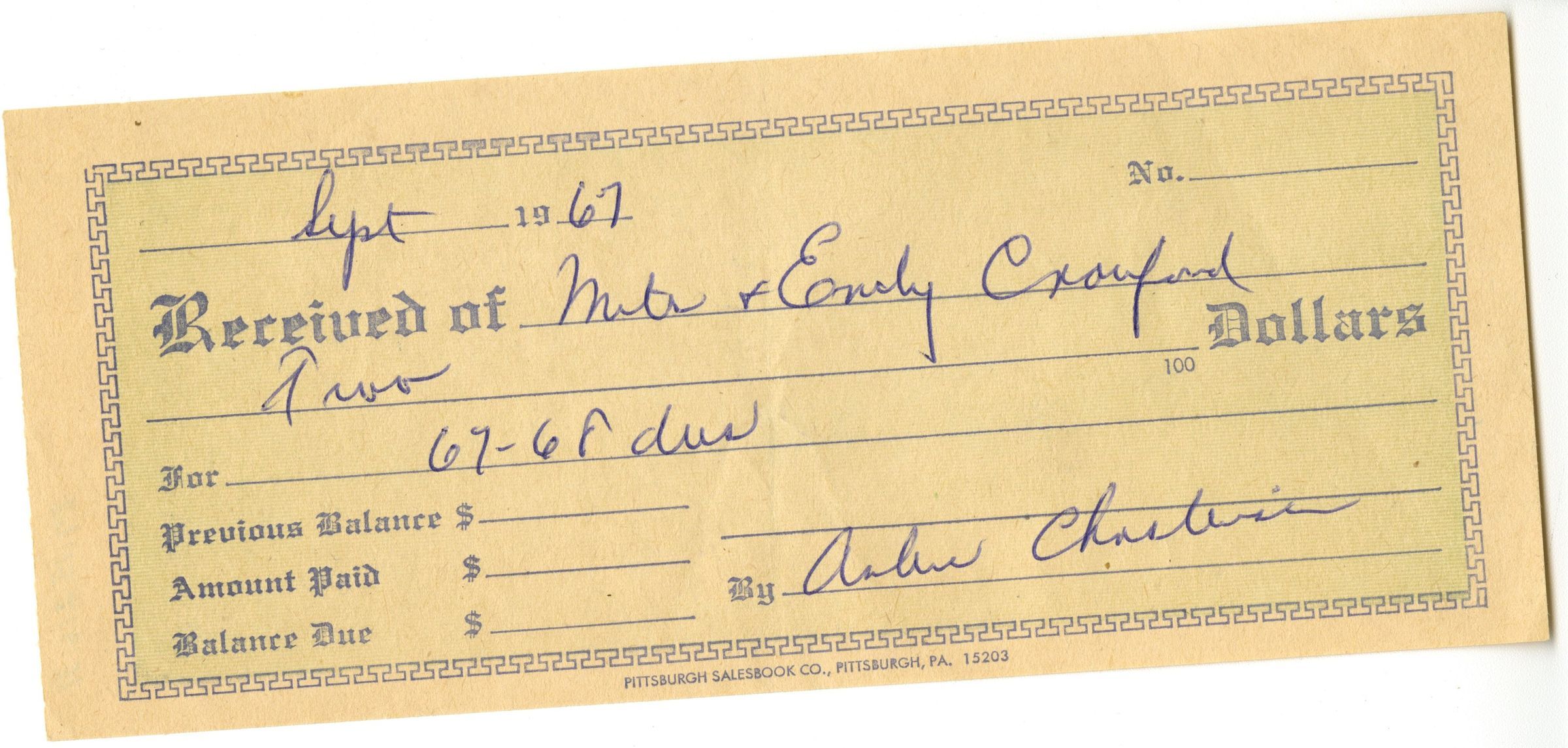 A receipt for a check from Miles and Emily Crawford, of $2. Dated Sept 1967.