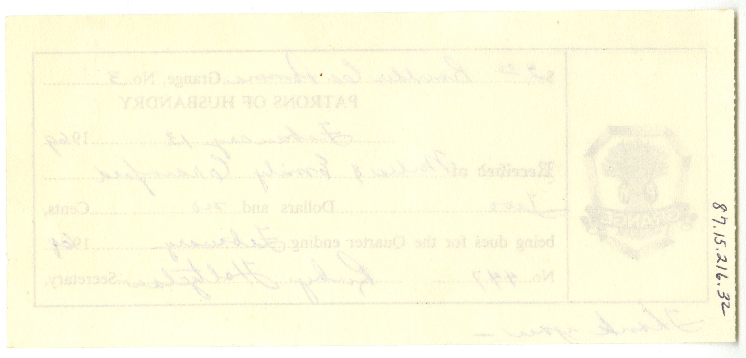 A receipt for a check from Miles and Emily Crawford of $2 for their dues for the Grange. Dated Febrary 13, 1969.
