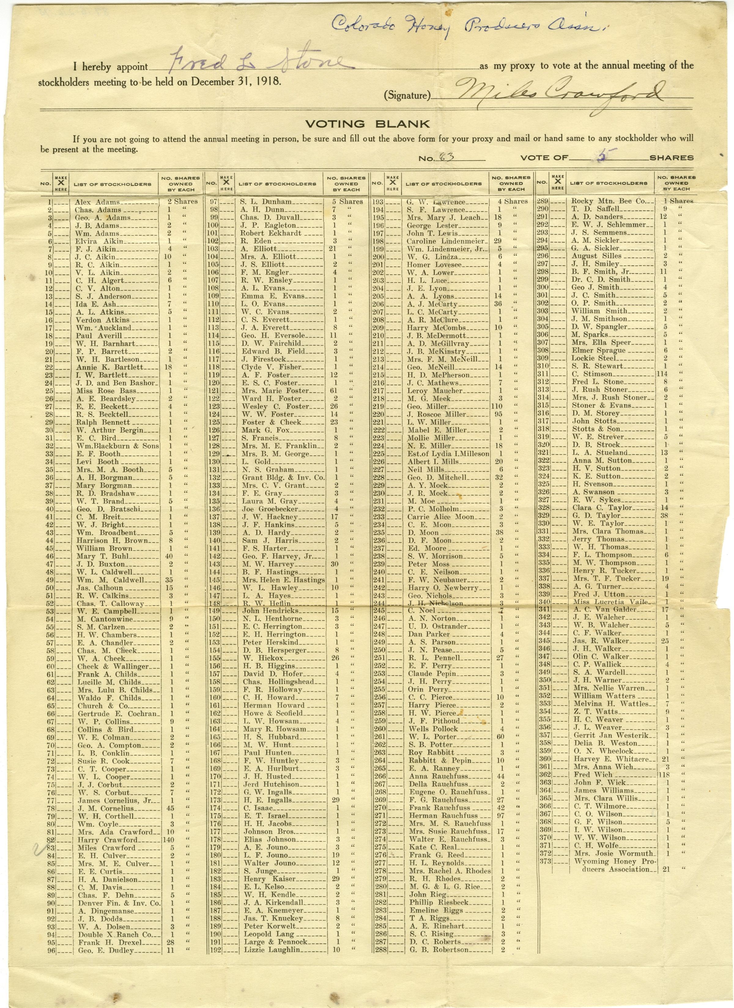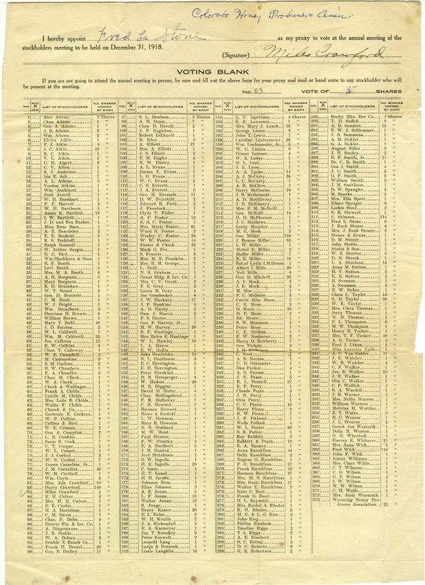 A page appointing Fred L Stone to act as Miles Crawford's proxy to the Colorado Honey Producer's Association and to vote for his 5 shares as a stakeholder.