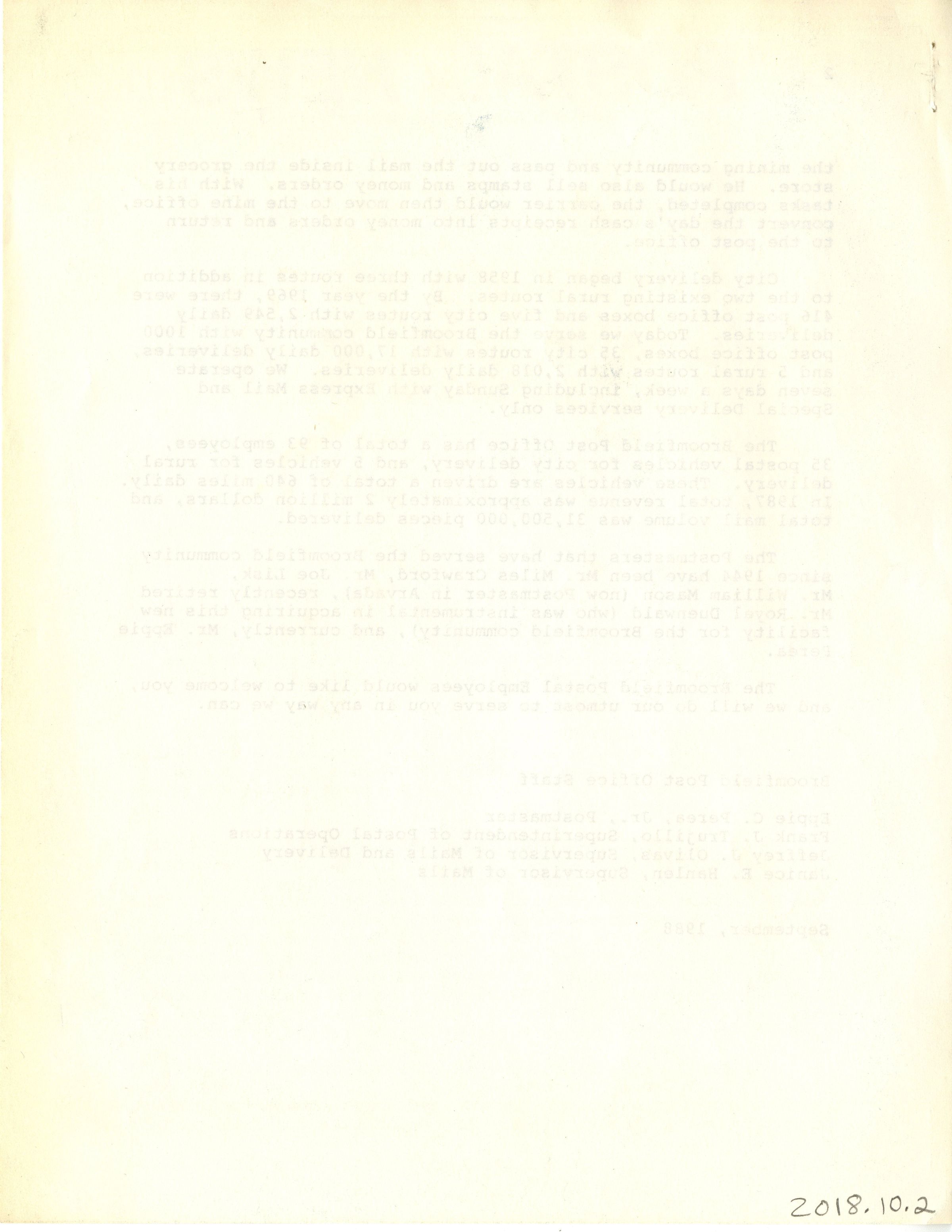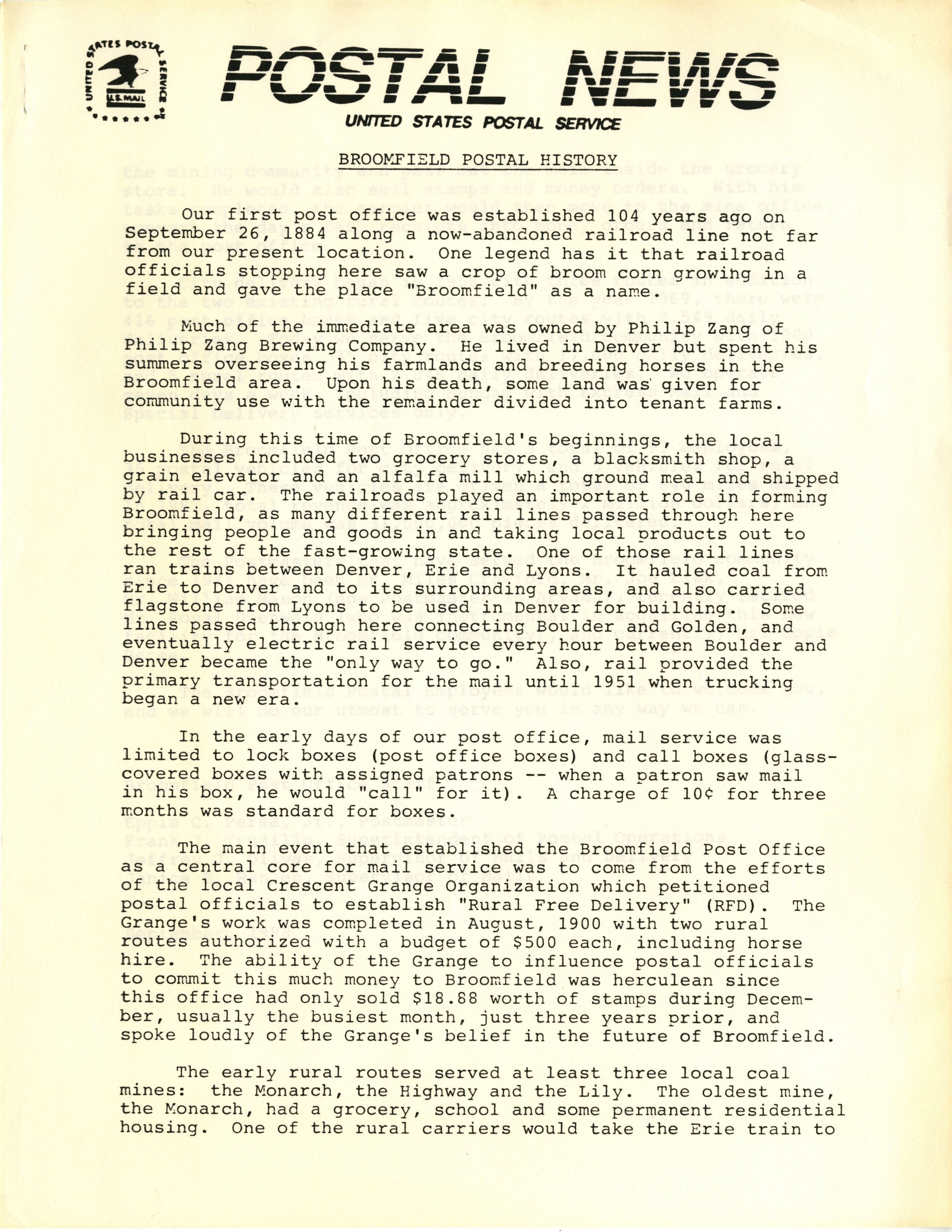 This document is a two page typed history of the Broomfield Postal Service by the Broomfield Post Office Staff. The first postal service in Broomfield began on September 26, 1884.