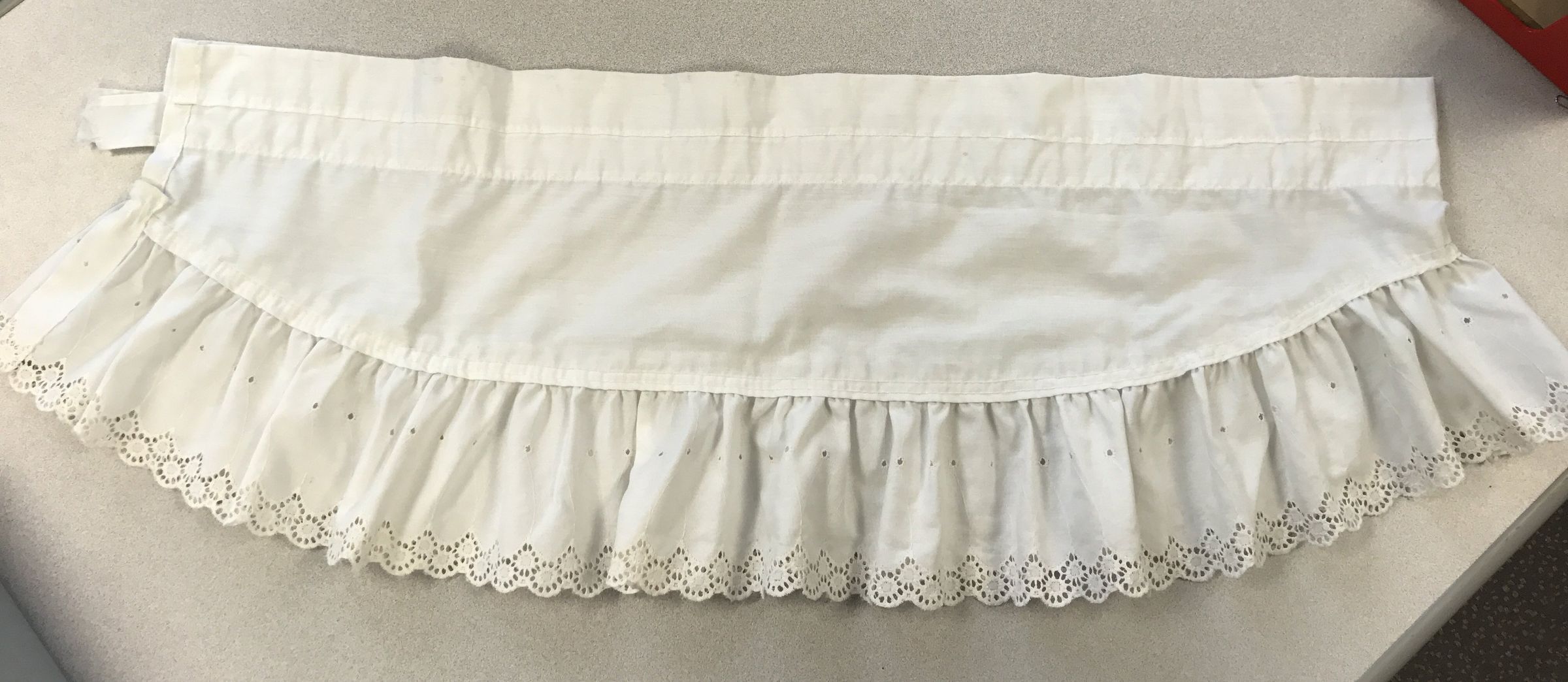 This is a white curtain with an eyelet pattern around the bottom edge. The curtain was stitched with the top folded over to create a pocket for the curtain rod. The curtain measures 13" (w) x 67" (l).