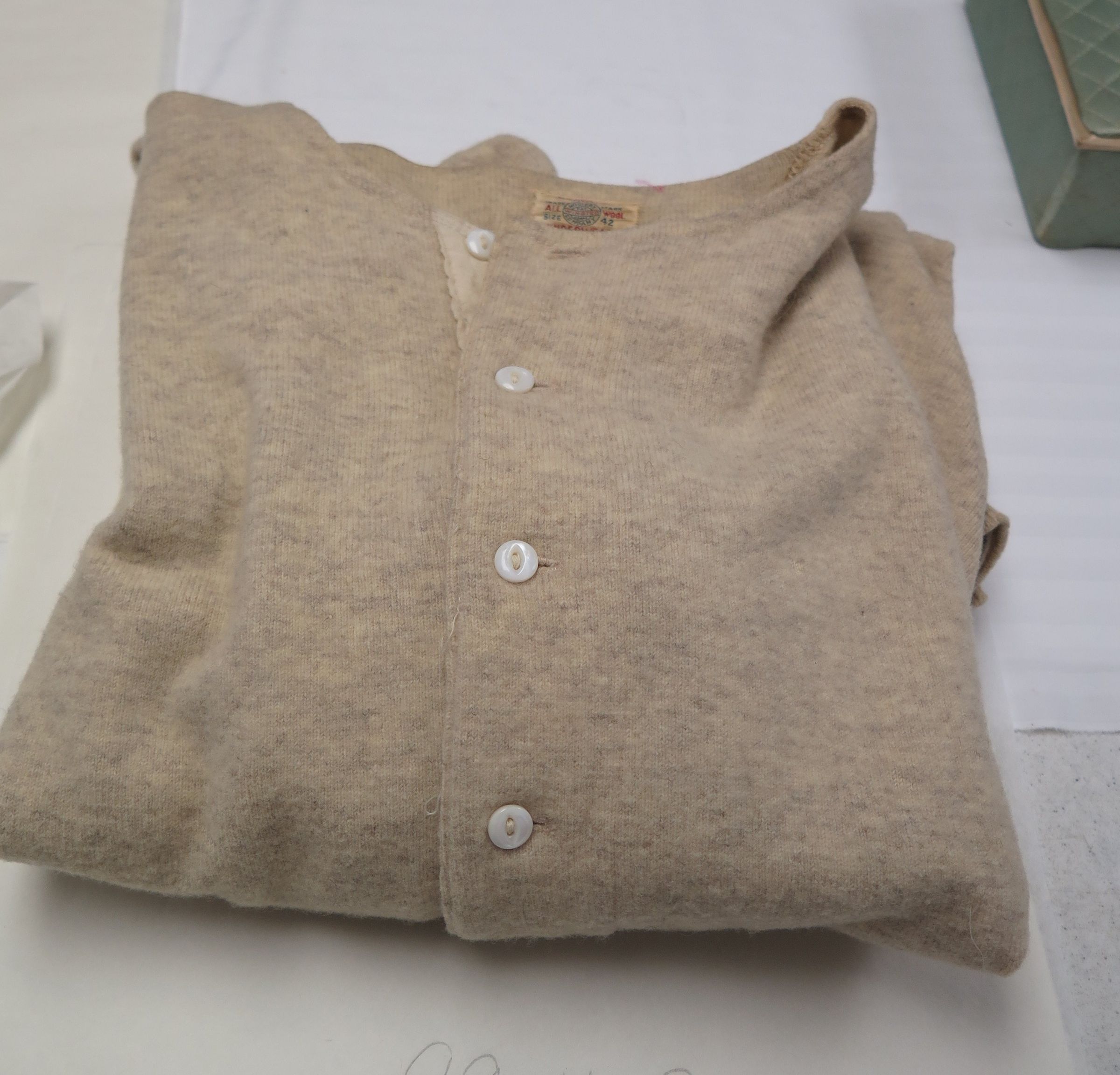 This is a wool Hosiery Company brand undershirt with 4 pearly white buttons down the front. The shirt is in size 42. The shirt measures 30.5" (w) x 33" (l).