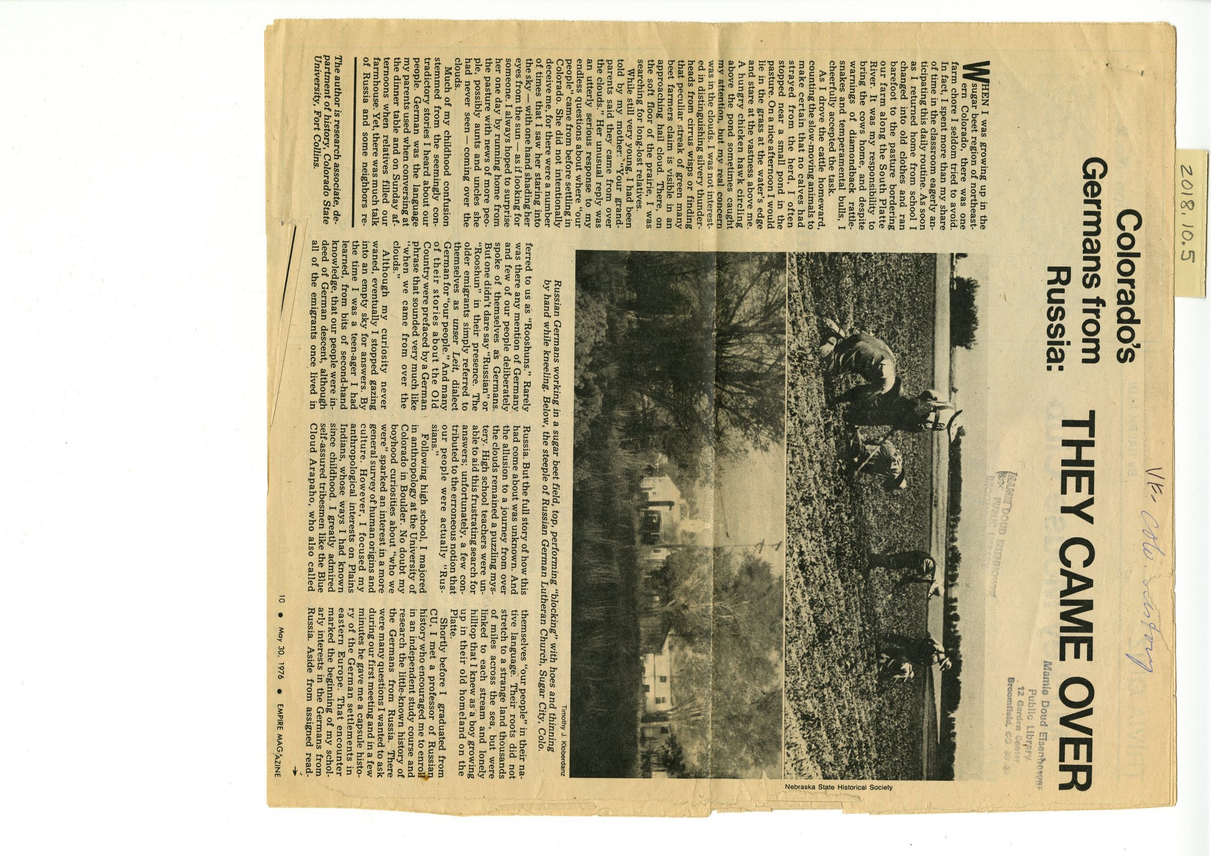 Article about German-Russian settlement in the Front Range area of Colorado. It is from the Empire Magazine newspaper and titled, "They Came Over The Clouds", by Timothy J. Koberdanz. The author was a research associate in the Department of History, Colorado State University, Fort Collins. The article tells the story of the German Russians spanning from 1762 to the present day of the article in 1976.Collection