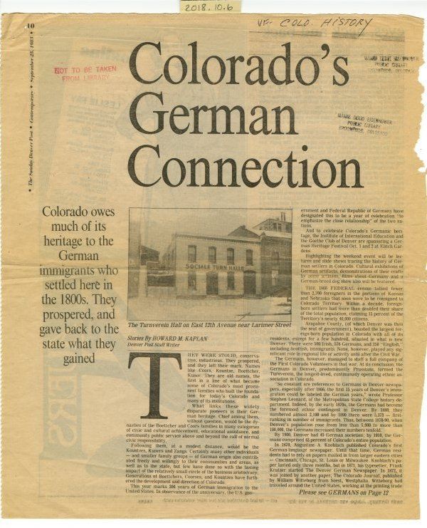 The main article is about German immigrants who settled in Colorado in the mid to late 1800's. It is from the Sunday Denver Post "Contemporary" newspaper and titled, Colorado's German Connection", by Howard M. Kaplan. He was a Denver Post Staff Writer and an Assistant Editor for the Empire Magazine. The article tells the story of several prominent German families such as Boettcher, Coors, Kountze, Kuner, and Zang families. The article features separate stories written on the Coors, Boettcher and Kountze families.Collection