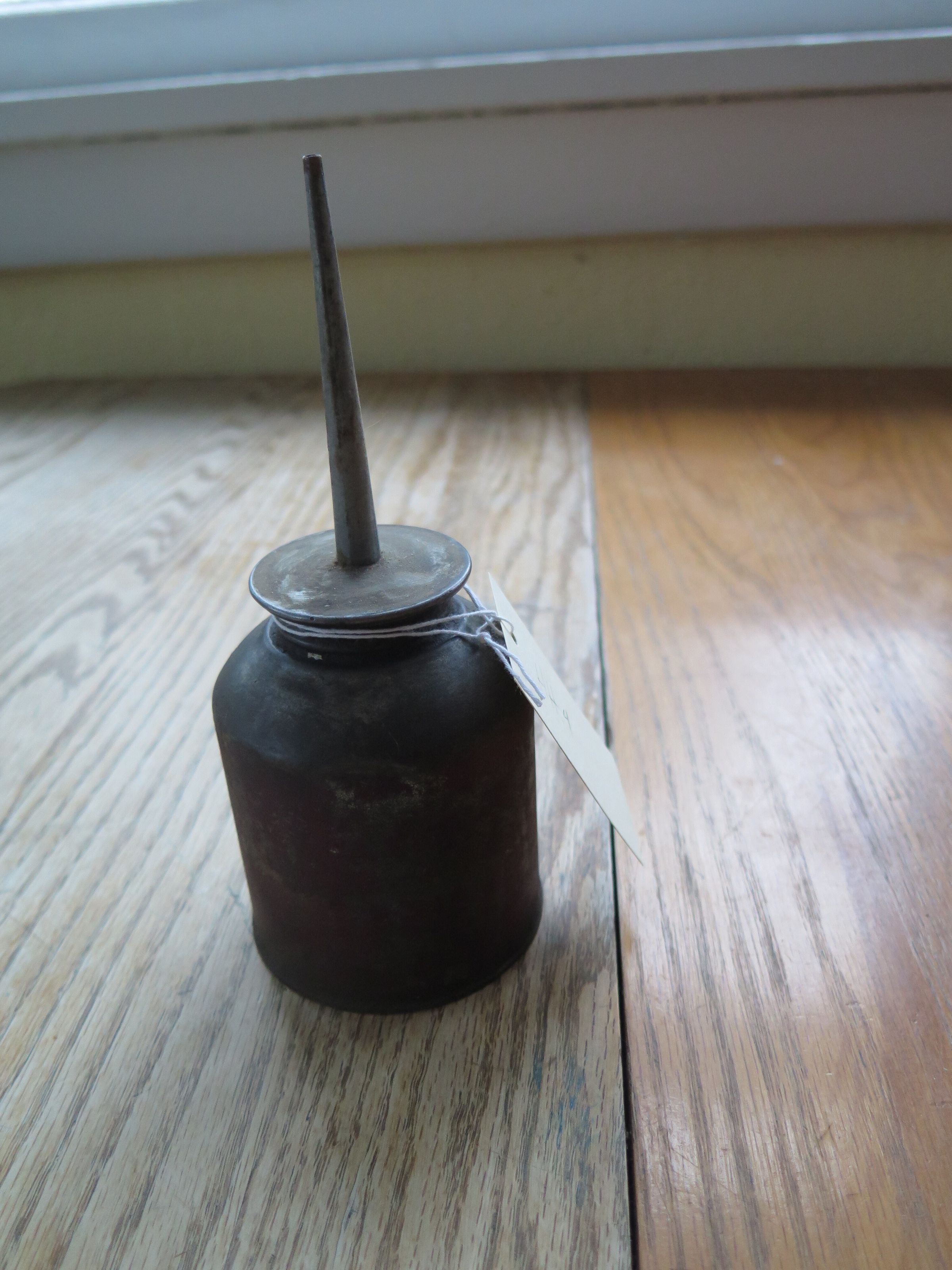 It is a metal oilcan. It was once painted red, but most of the paint has worn off. The oilcan measures 7.5" (w) x 3" (diam).