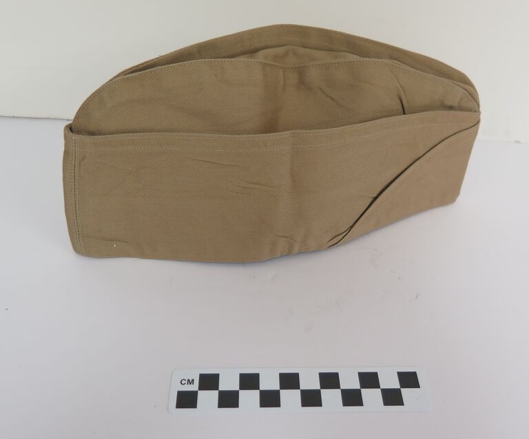 Item is a khaki army side cap with no piping. It is made of cotton and measures 11" (w) x 5" (l). The hat looks like it is labeled 2001.8.6, but that is incorrect. It was donated as a set with another army side cap.