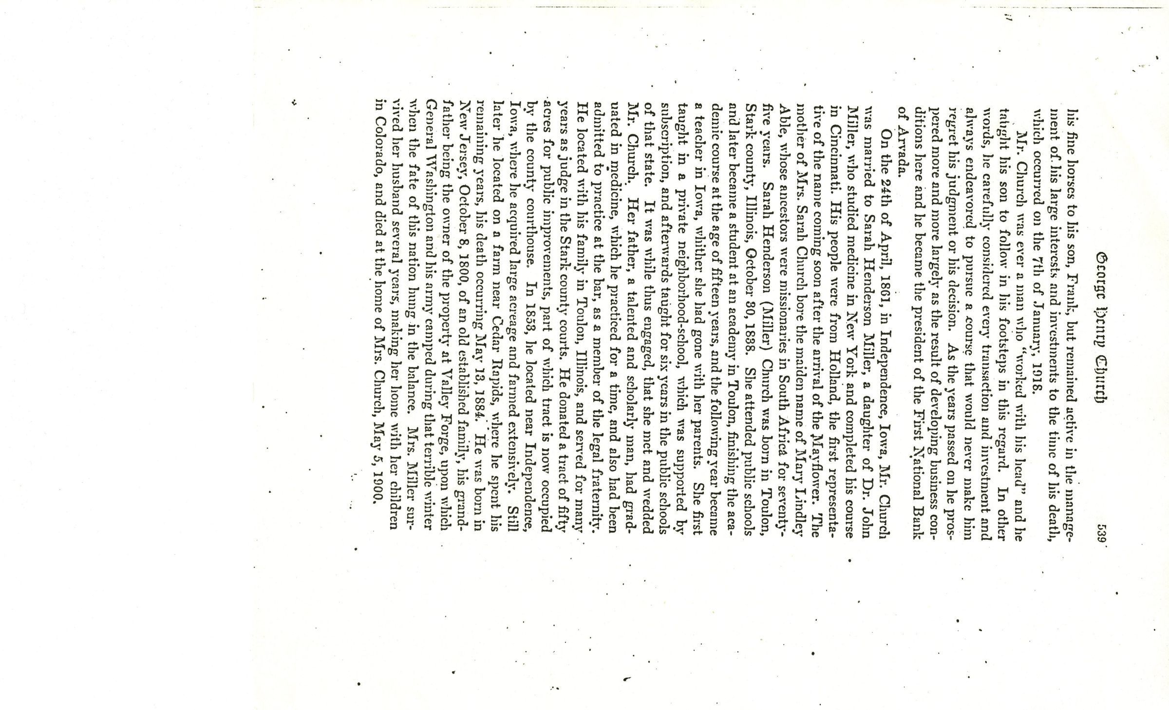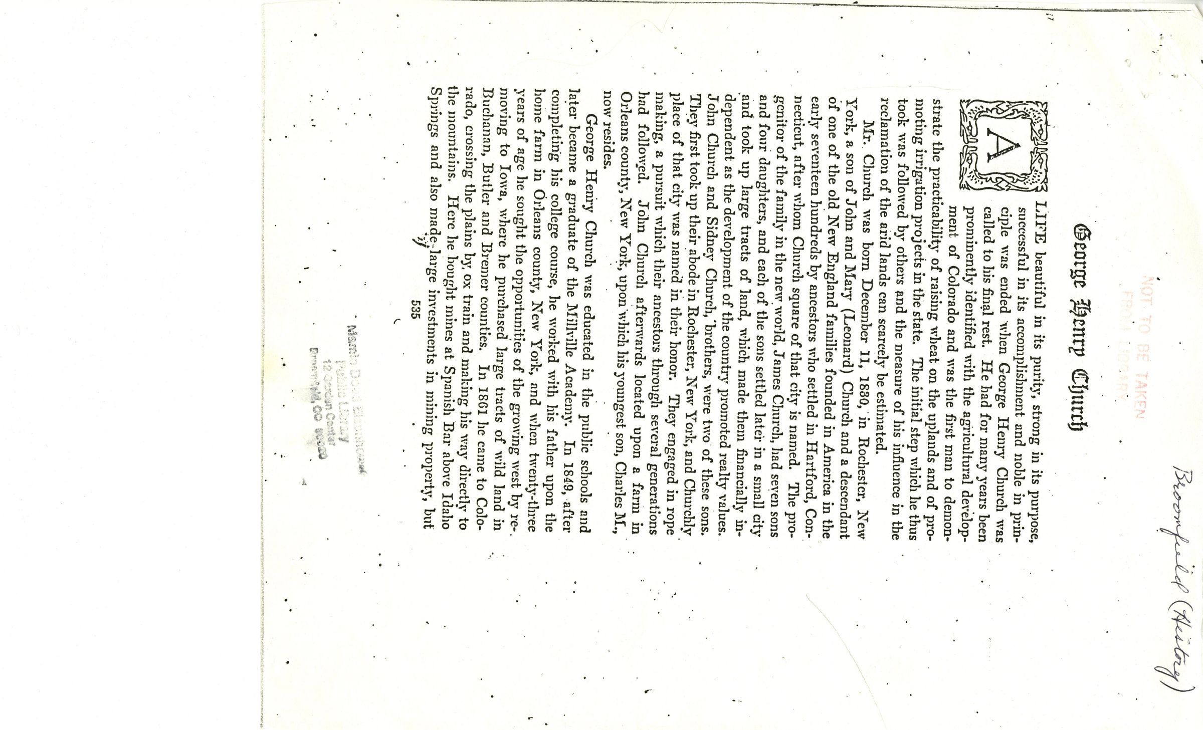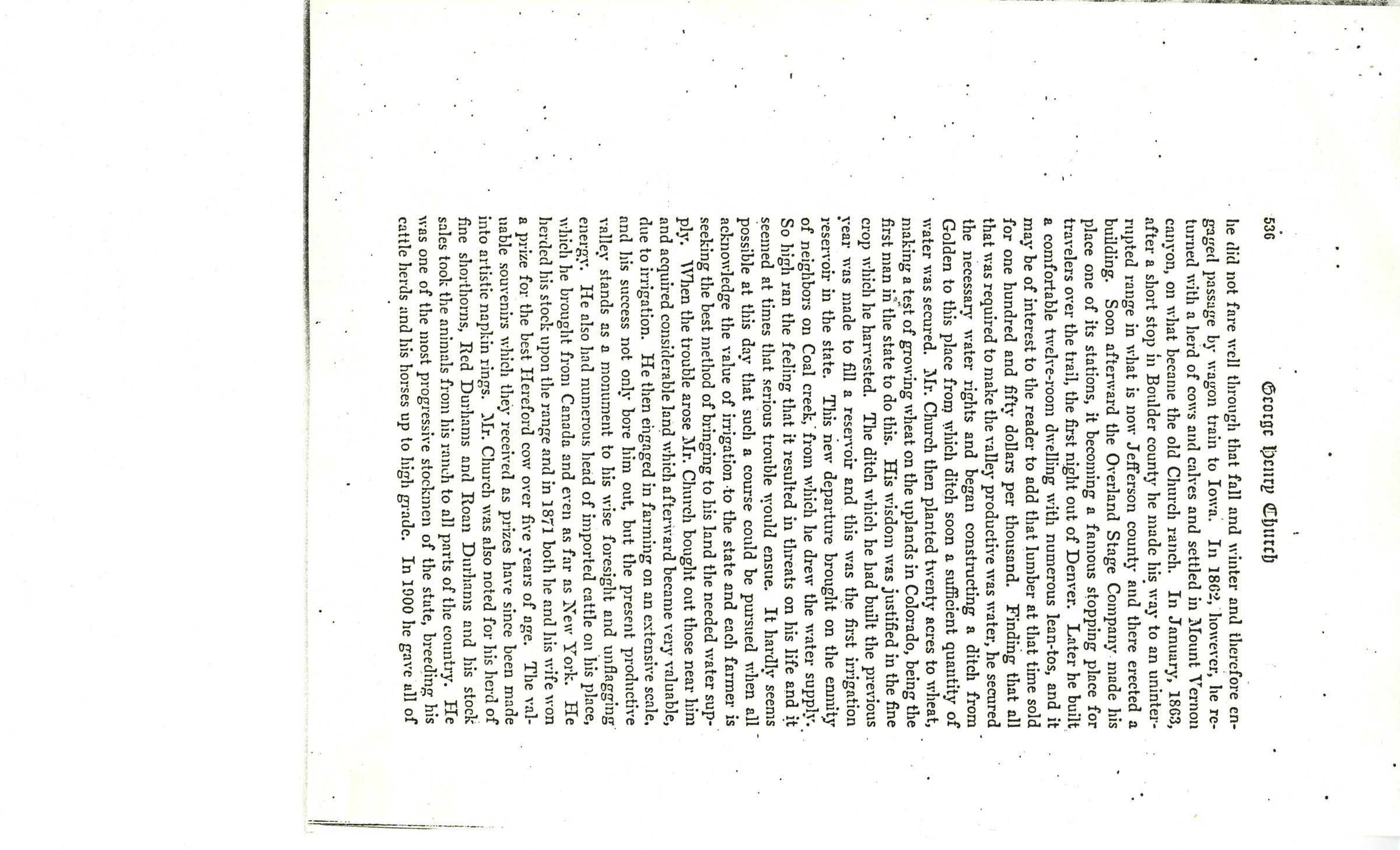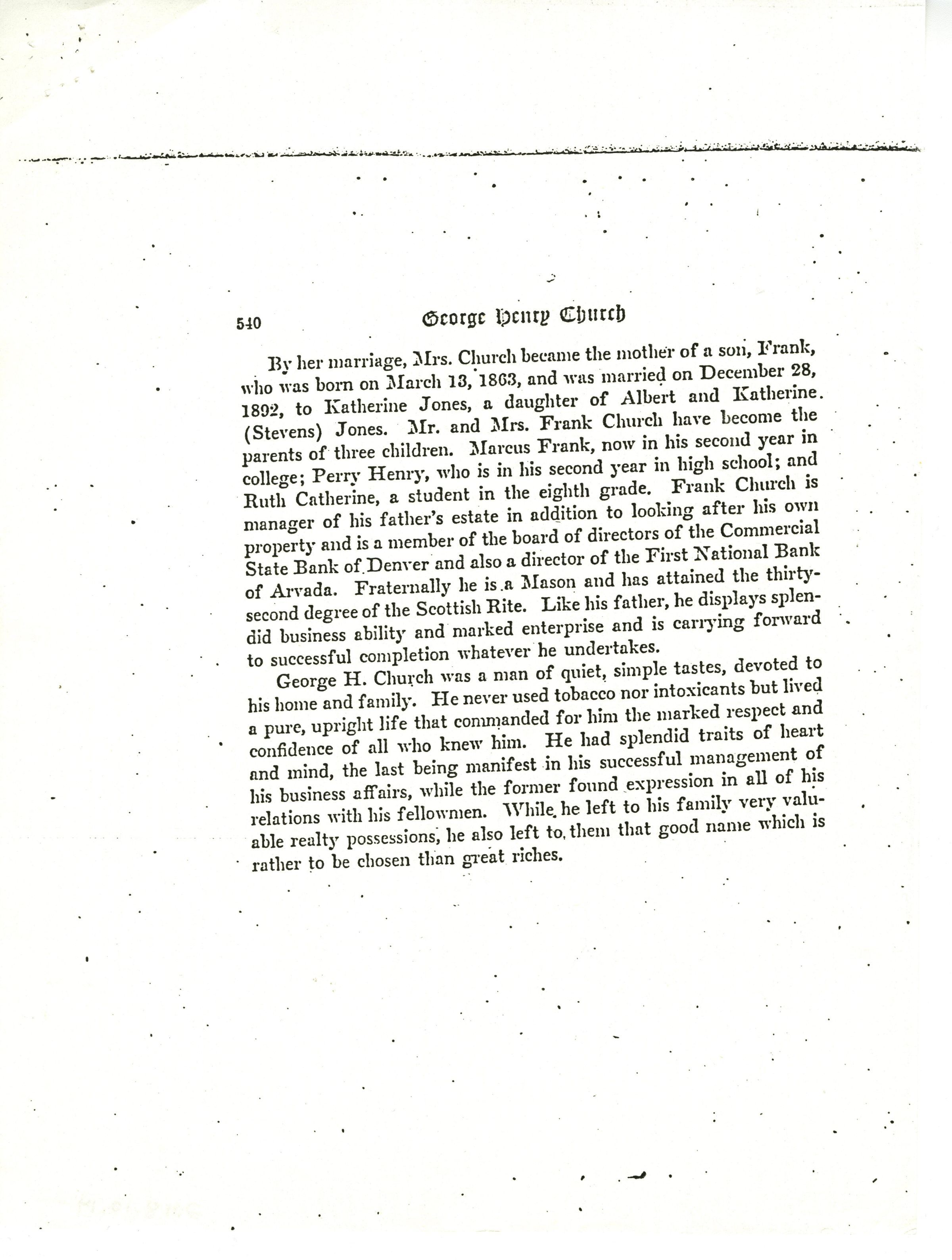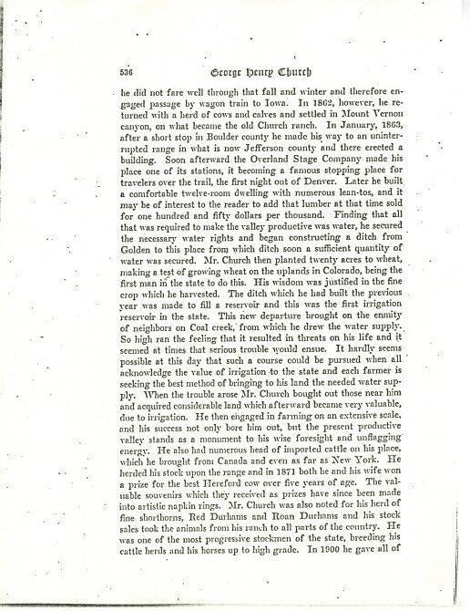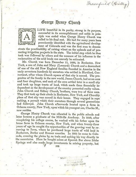 A biography (4 pgs, text on front side only) of George Henry Church (1830-1918). He was a farmer and cattle rancher who owned land in Arvada.