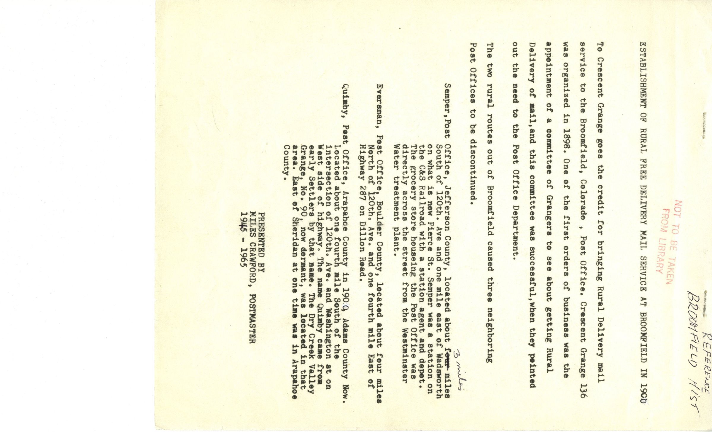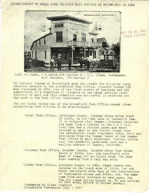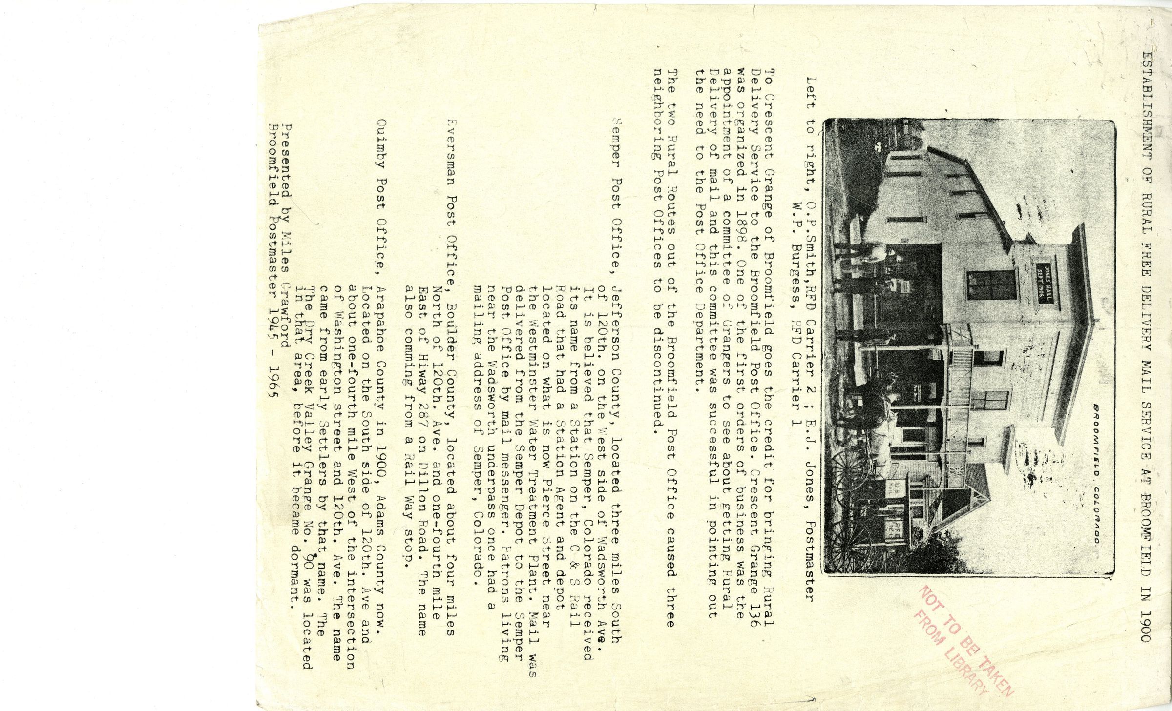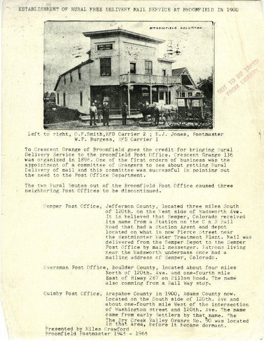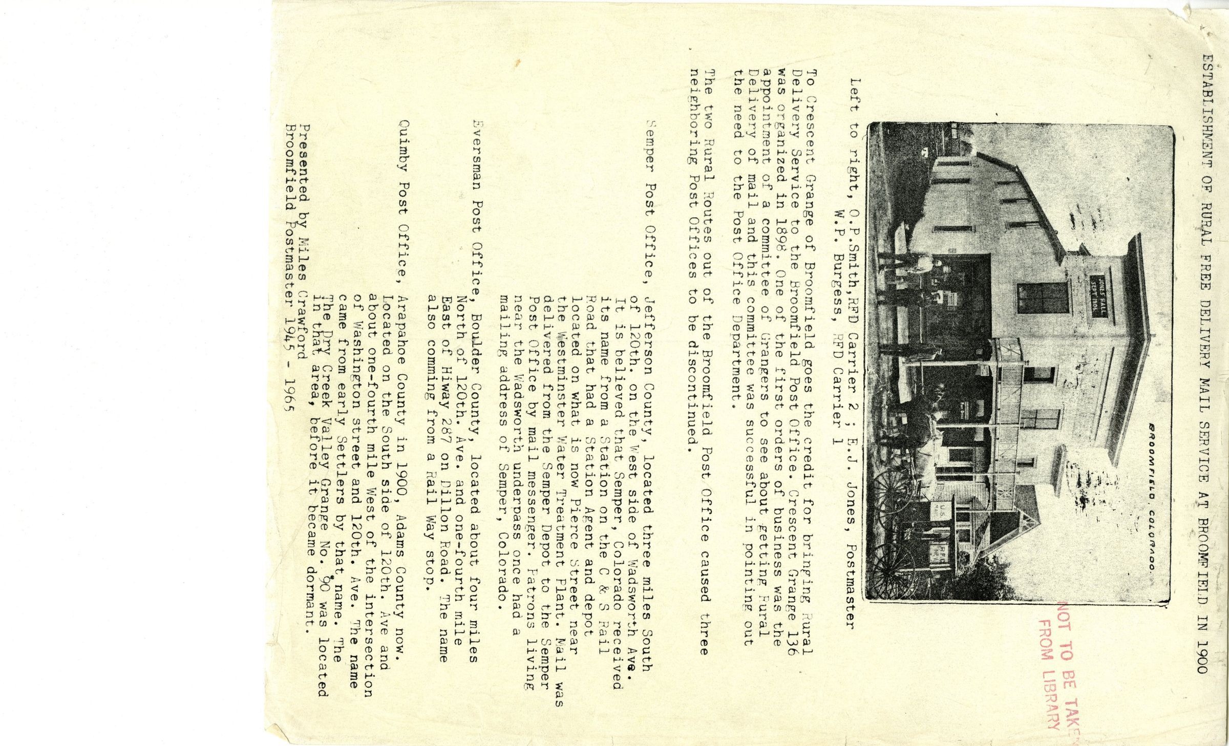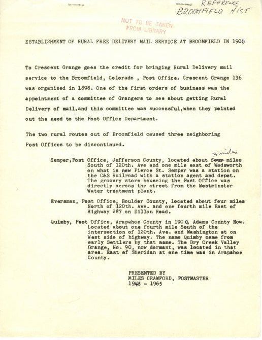 1 folder of documents (a-d) about the history of the Broomfield Post Office beginning on September 26, 1884. The documents are a collection of research for a presentation by Miles Crawford who was a former Postmaster from 1945-1965. It is titled, "Establishment of Rural Free Delivery Mail Service at Broomfield in 1900".