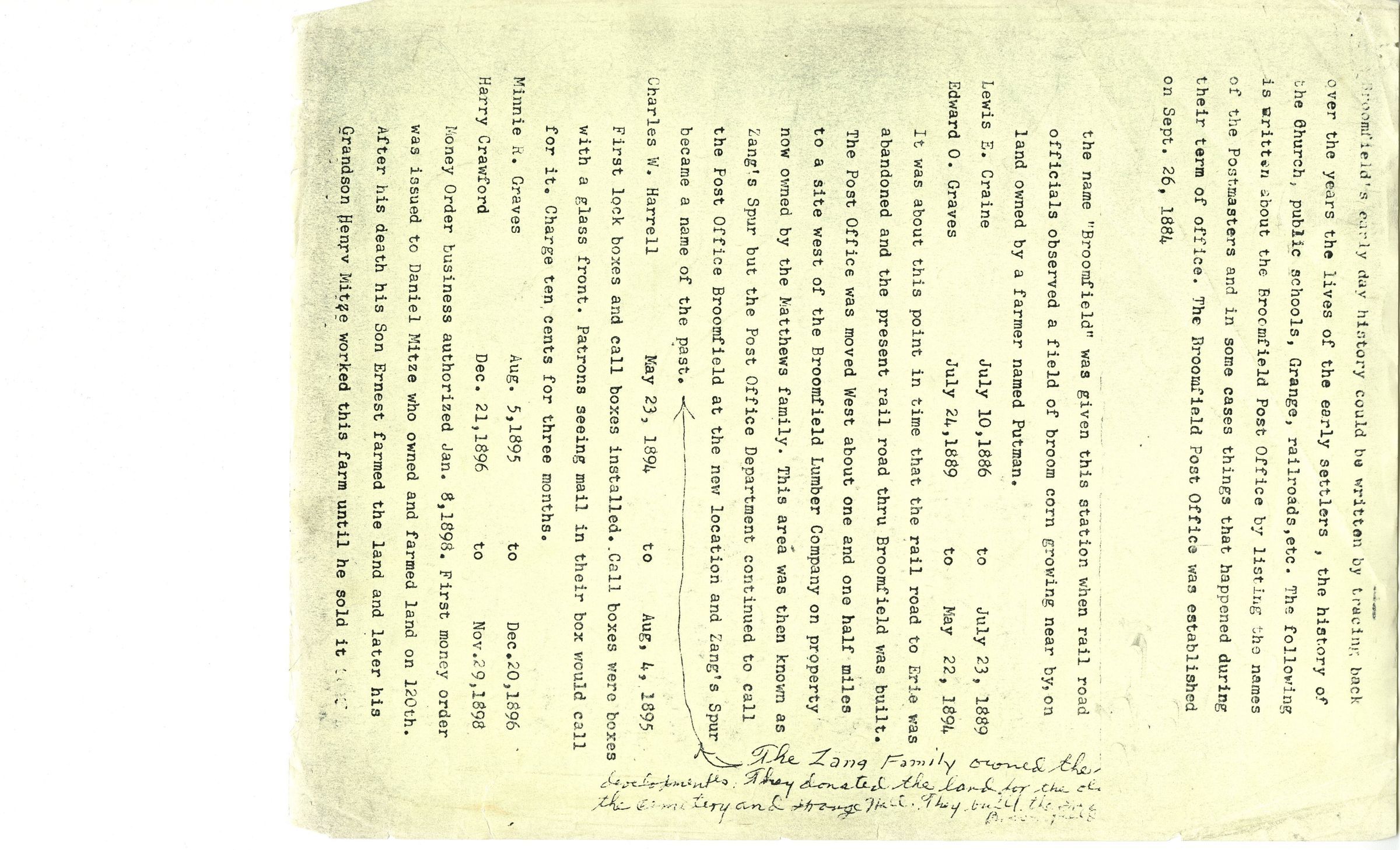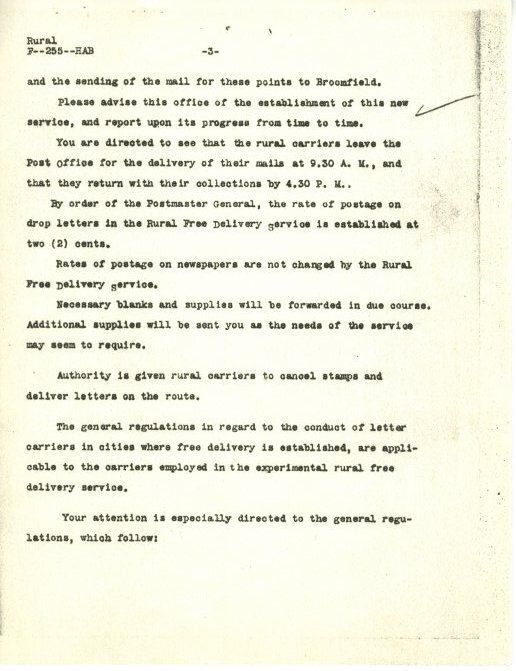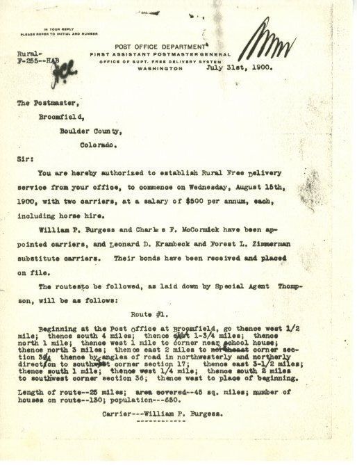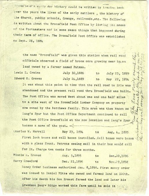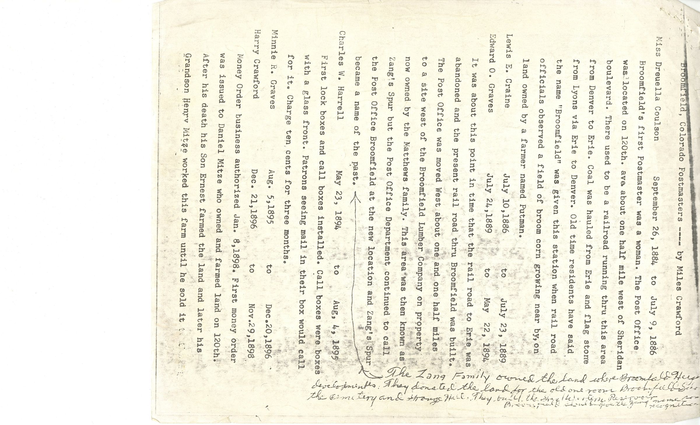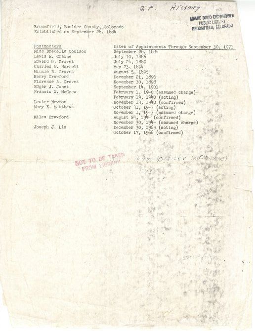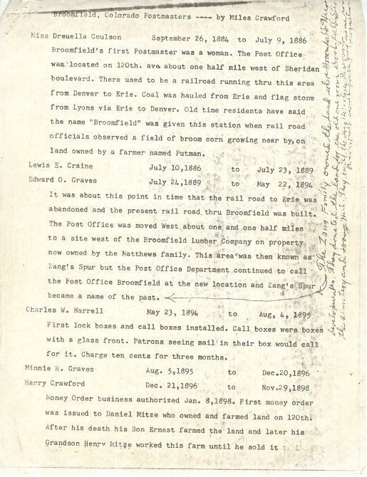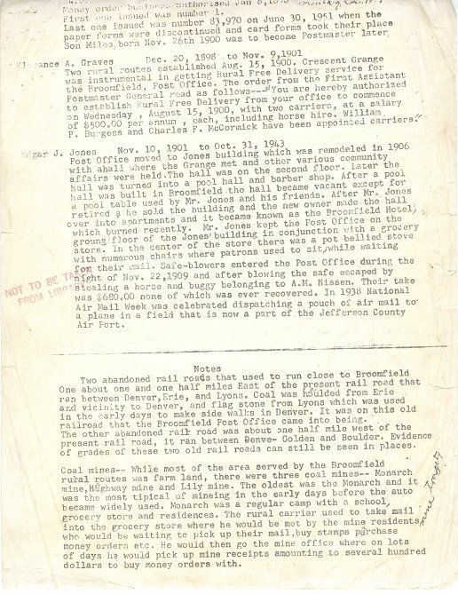 1 folder of documents (a-d) about the history of the Broomfield Post Office beginning on September 26, 1884. The documents are a collection of research for a presentation by Miles Crawford who was a former Postmaster from 1945-1965. It is titled, "Establishment of Rural Free Delivery Mail Service at Broomfield in 1900".