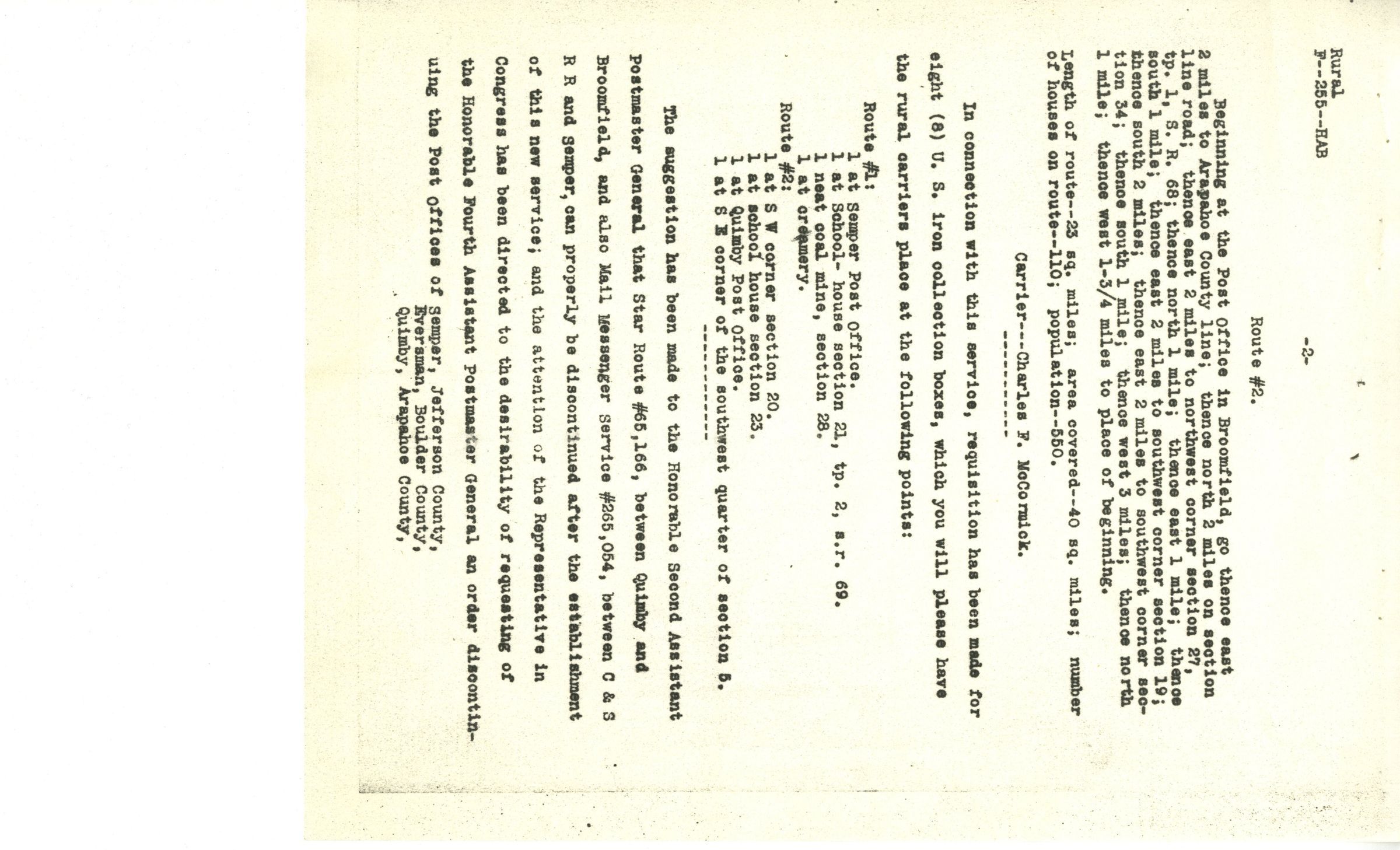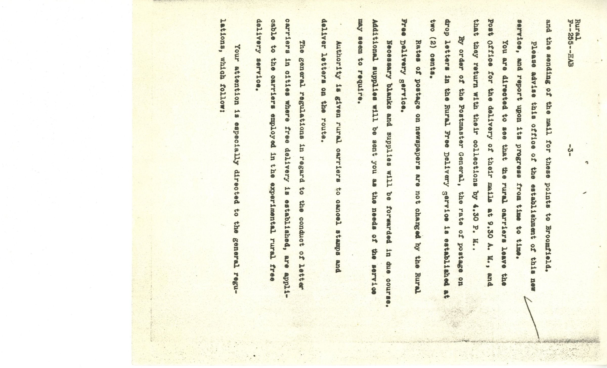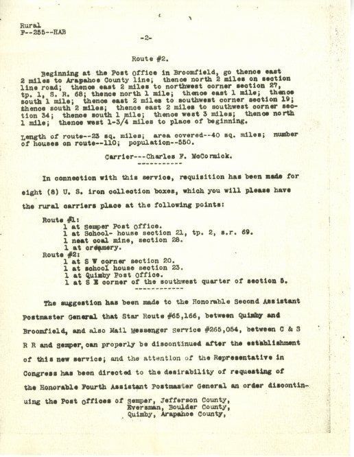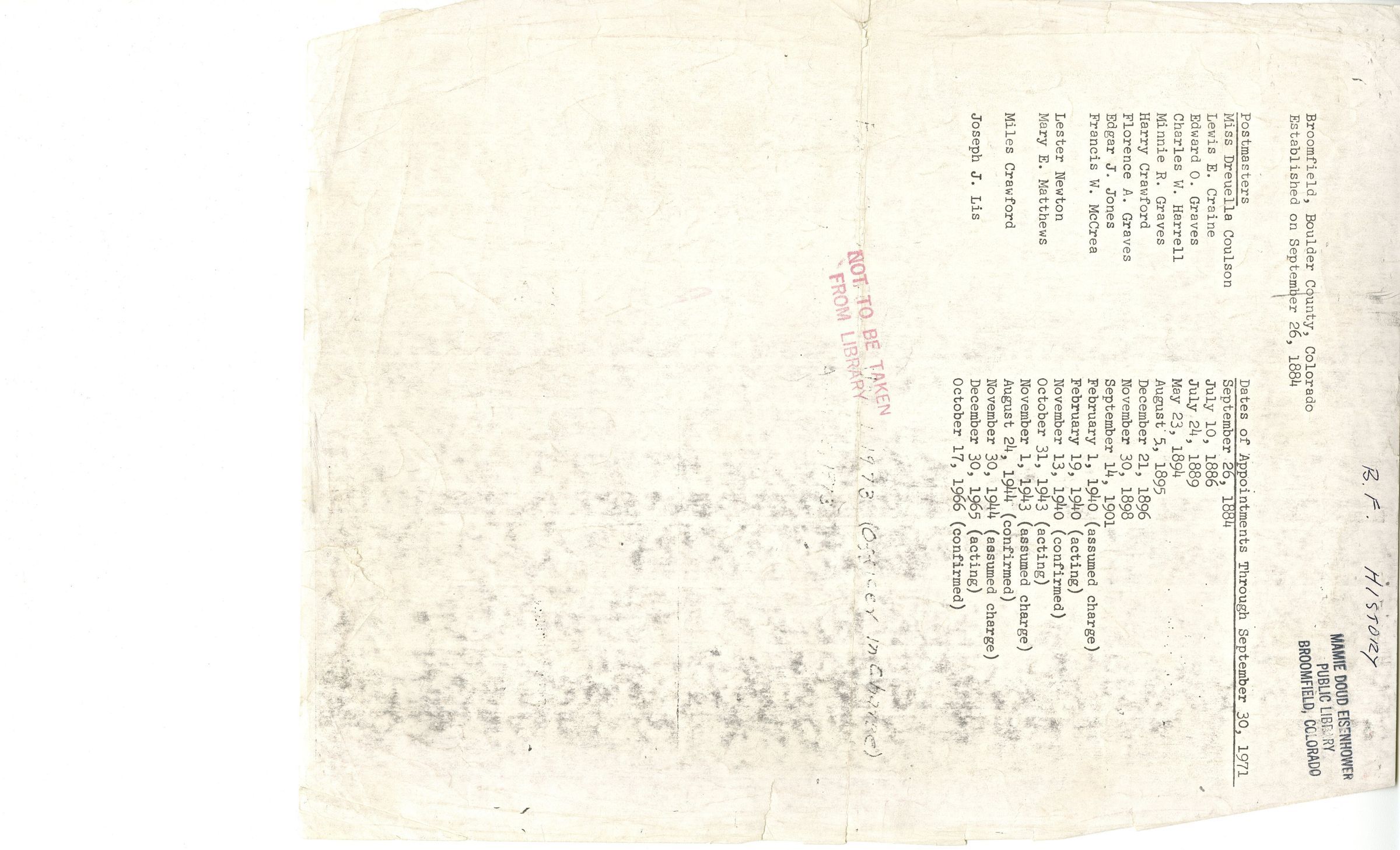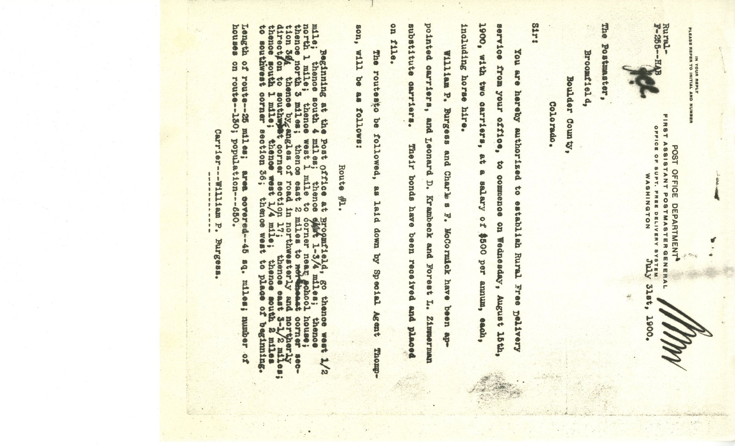 1 folder of documents (a-d) about the history of the Broomfield Post Office beginning on September 26, 1884. The documents are a collection of research for a presentation by Miles Crawford who was a former Postmaster from 1945-1965. It is titled, "Establishment of Rural Free Delivery Mail Service at Broomfield in 1900".