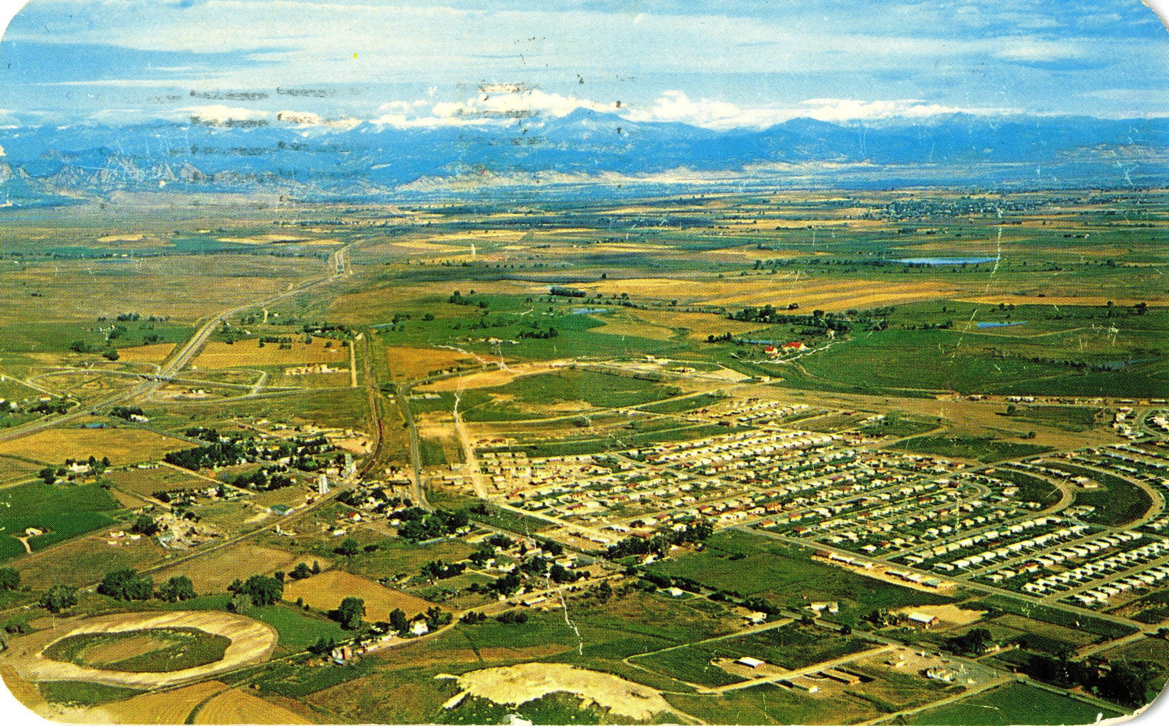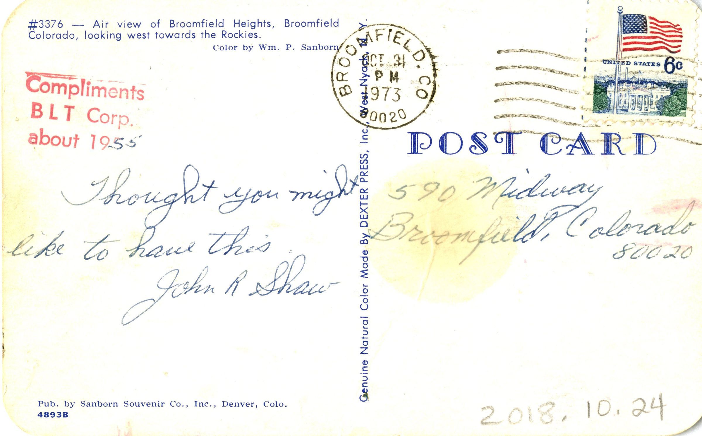 1 postcard with arial view of Broomfield Heights from 1955. The postcard has postmark date of October 31, 1973. It was mailed by John R. Shaw to an address on Midway in Broomfield using a stamp valued at 6 cents.