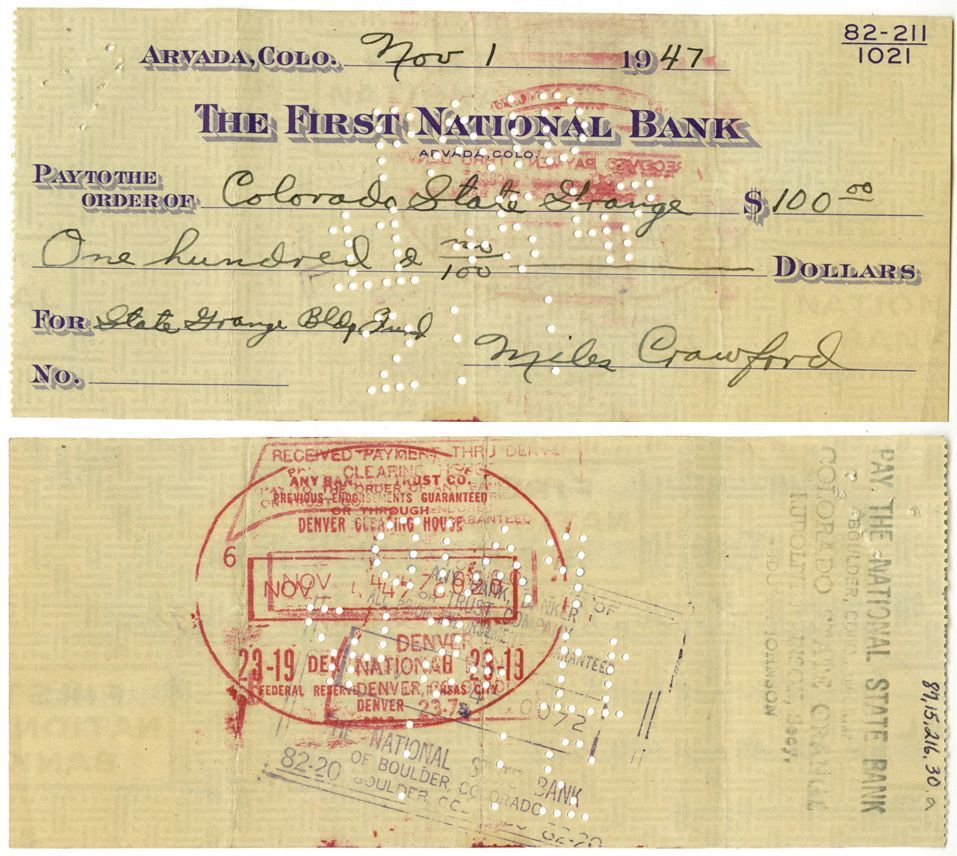 A: A check of $100 for the Colorado State Grange, paid by Miles Crawford, Nov 1, 1947. Several red stamps and a purple stamp on back, overlapping. Check number 82-211/1021. Small holes stamped through reading "Paid 11 +5 47, 21 1."