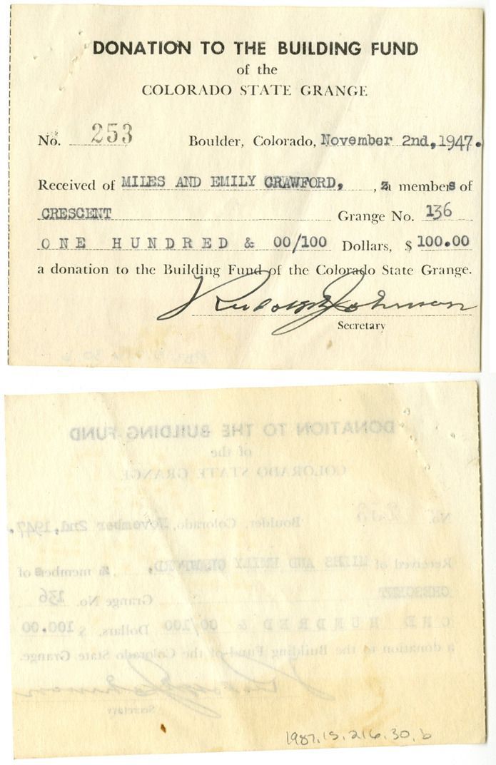 B: Receipt of a Donation to the Building Fund of the Colorado State Grange, November 2nd, 1947. Miles and Emily Crawford, paid $100.