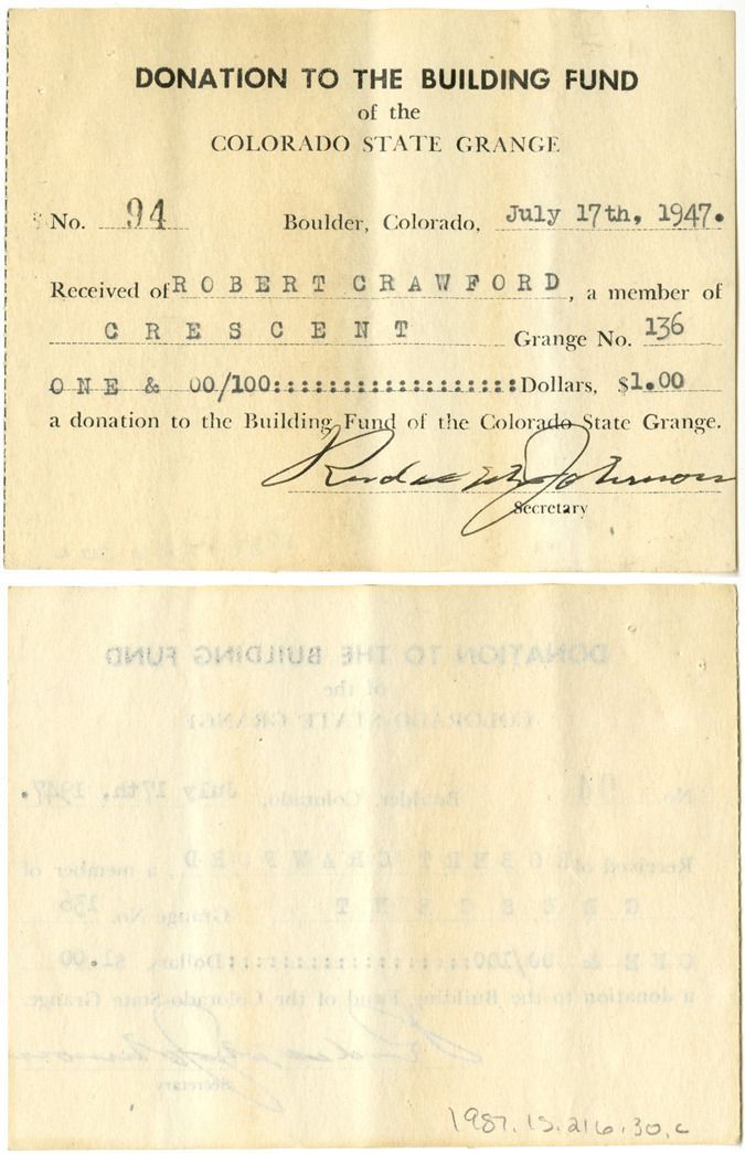 C: Receipt of a Donation to the Building Fund of the Colorado State Grange, July 17th, 1947. Robert Crawford paid $1.