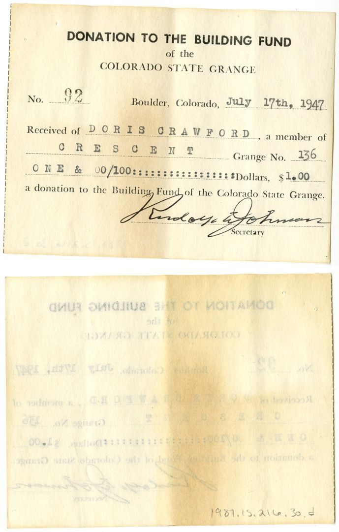 D: Receipt of a Donation to the Building Fund of the Colorado State Grange, July 17th, 1947. Doris Crawford paid $1.