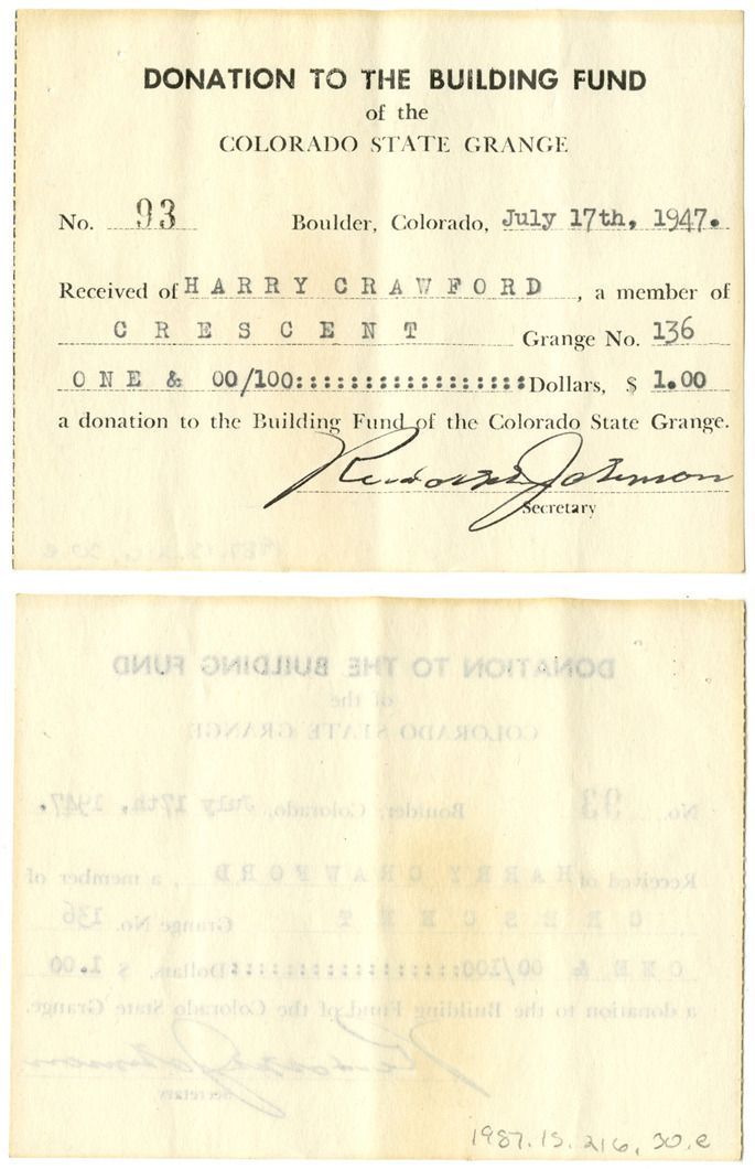 E: Receipt of a Donation to the Building Fund of the Colorado State Grange, July 17th, 1947. Harry Crawford paid $1.