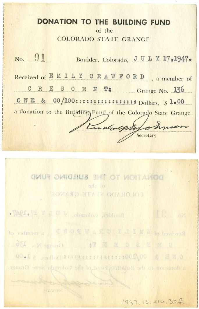 F: Receipt of a Donation to the Buidling Fund of the Colorado State Grange, July 17th, 1947. Emily Crawford paid $1.