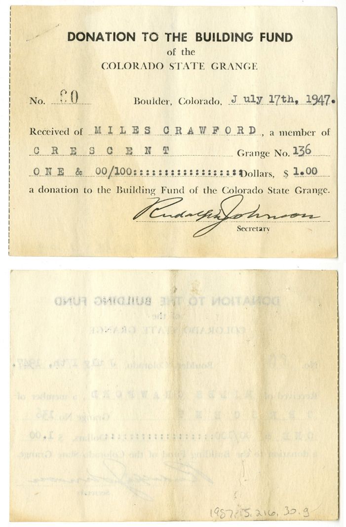 G: Receipt of a Donation to the Building Fund of the Colorado State Grange, July 17th, 1947. Miles Crawford paid $1.Collection