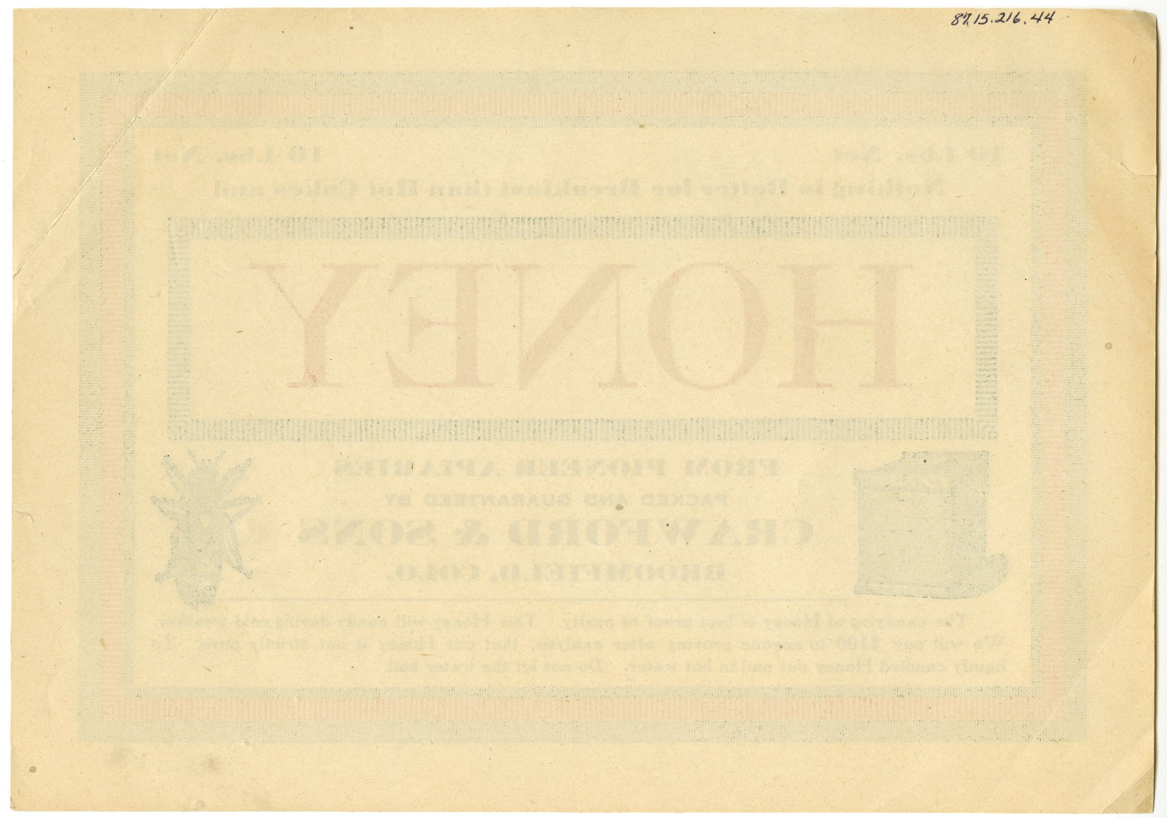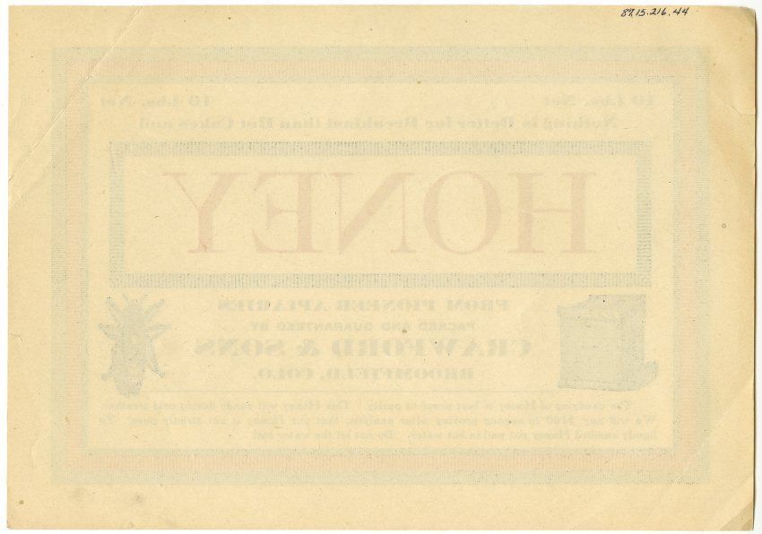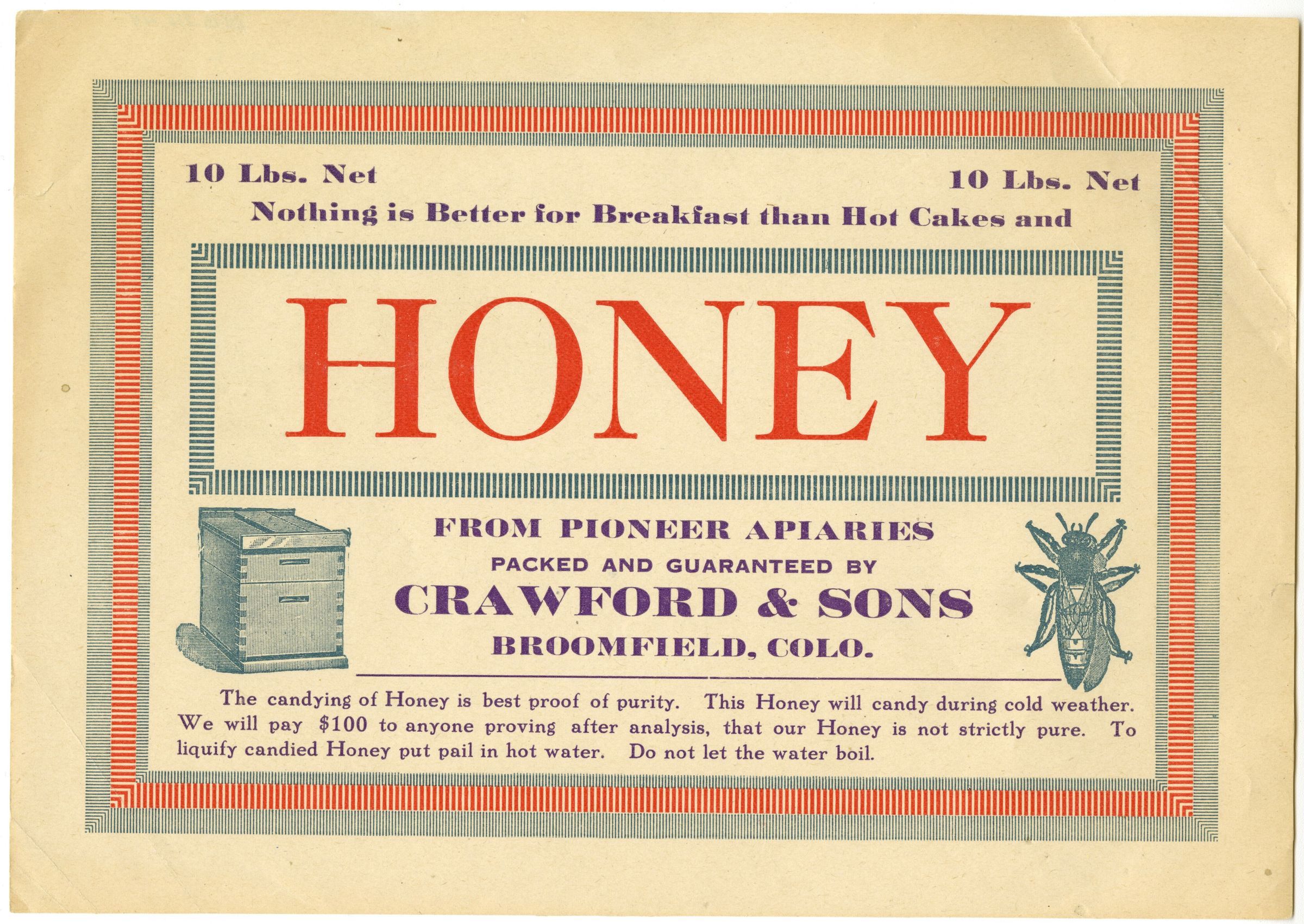 From pioneer apiaries, packed and guaranteed by Crawford & Sons, Broomfield, Colo.