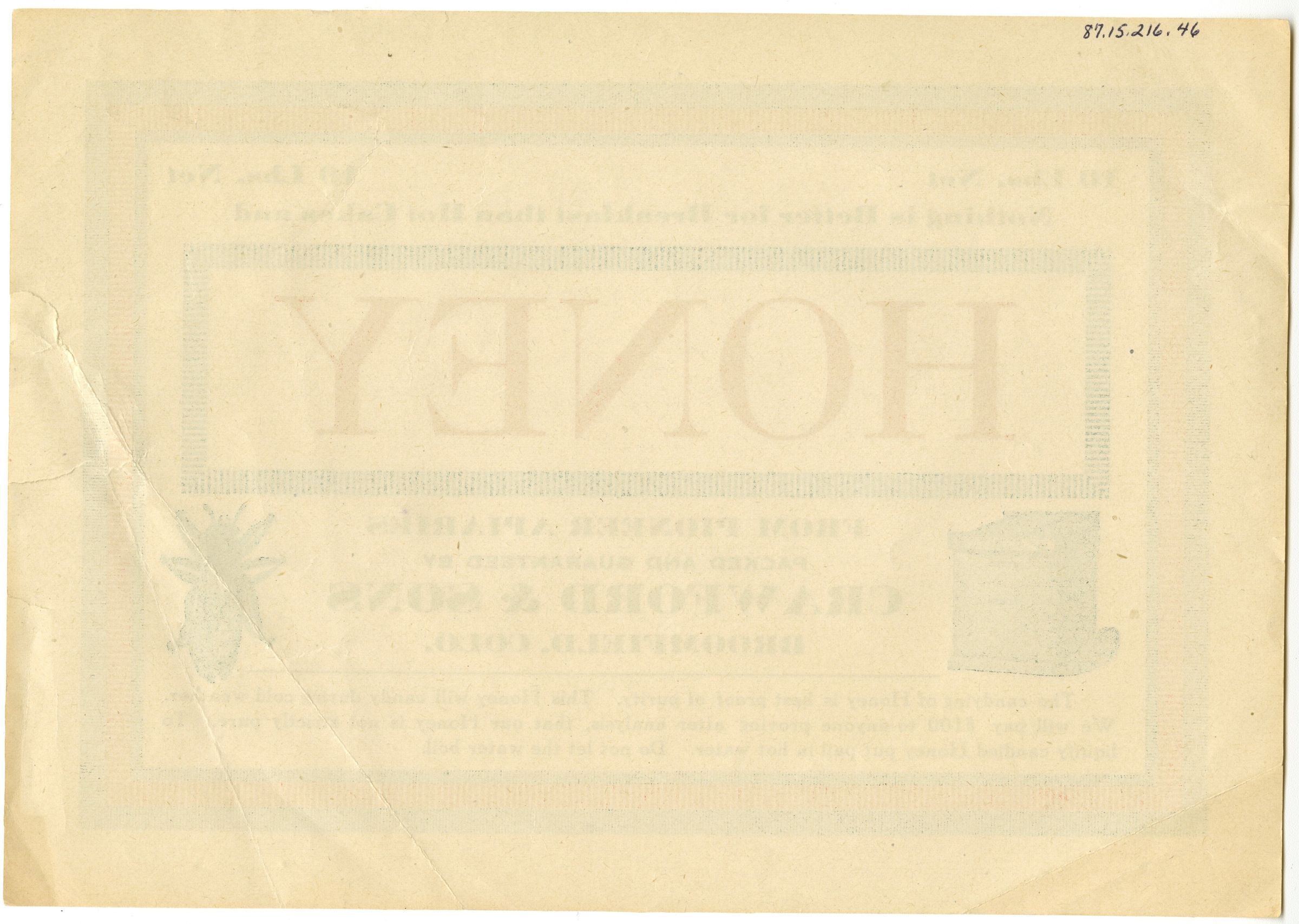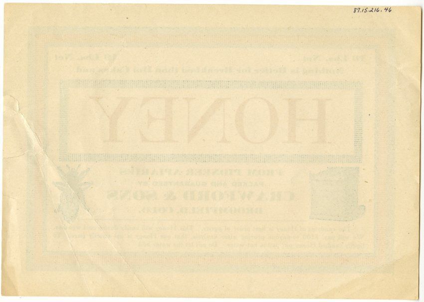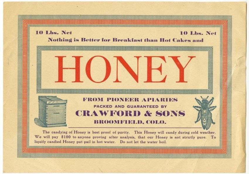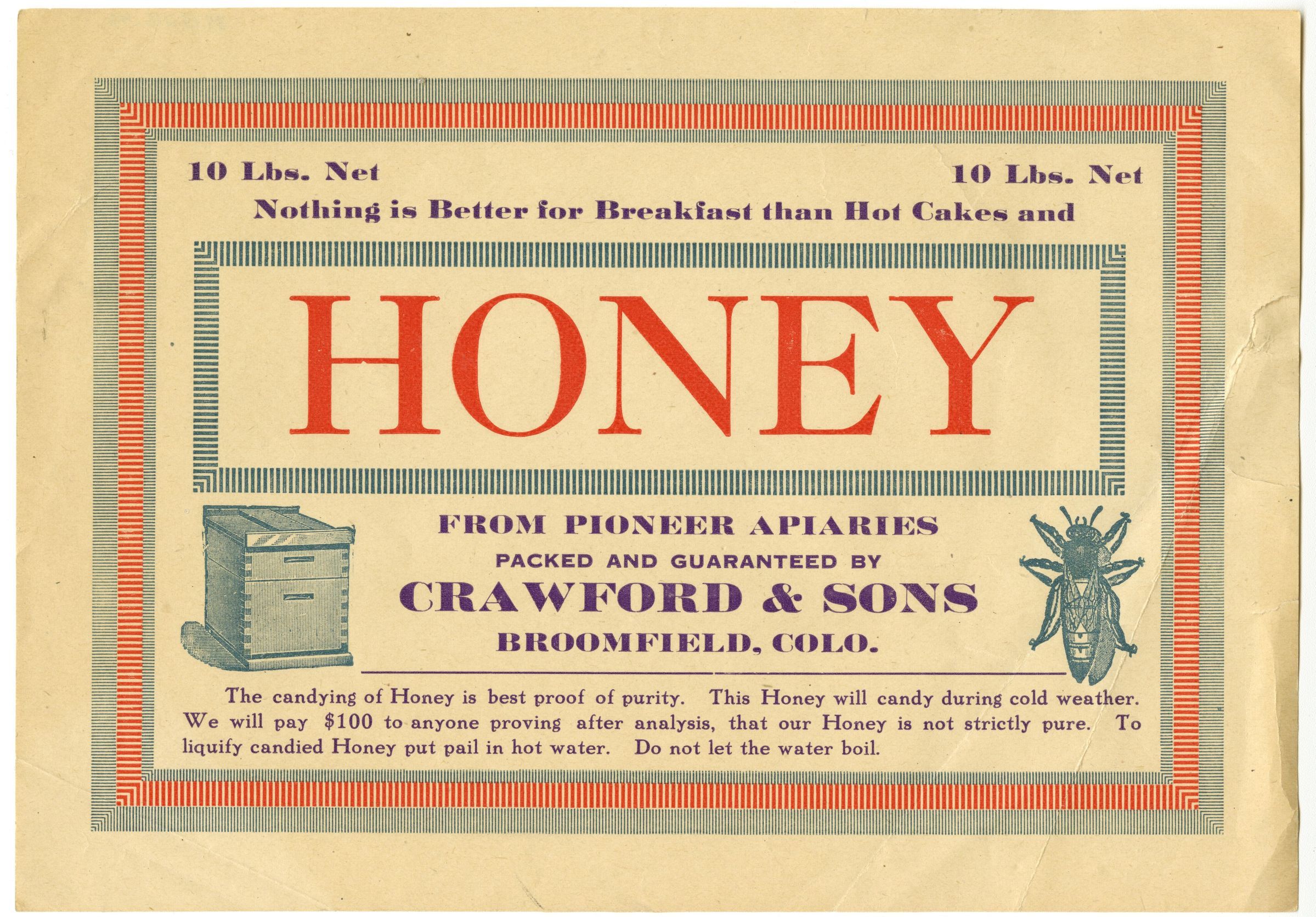 From pioneer apiaries, packed and guaranteed by Crawford & Sons, Broomfield, Colo.