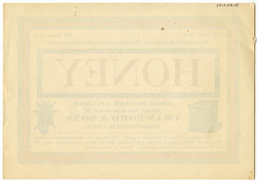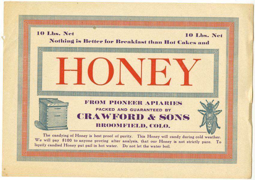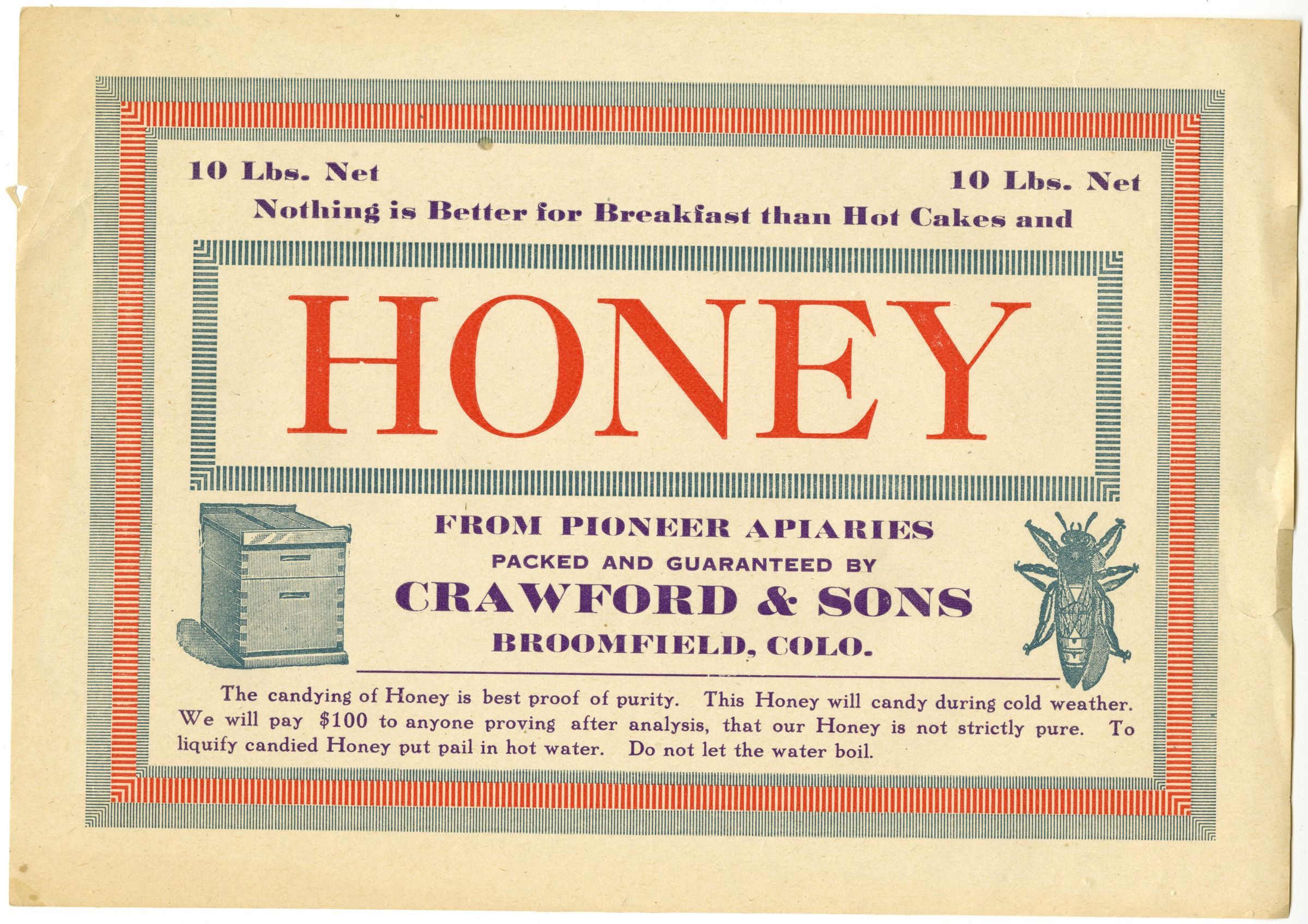 From pioneer apiaries, packed and guaranteed by Crawford & Sons, Broomfield, Colo.