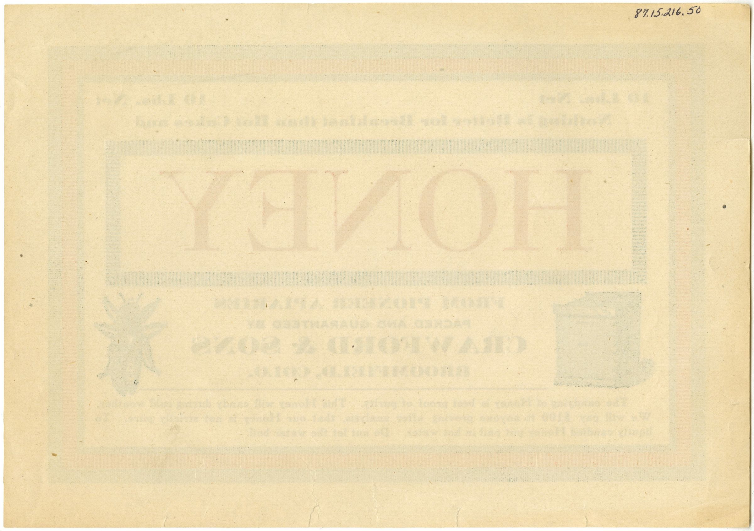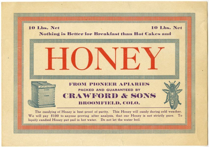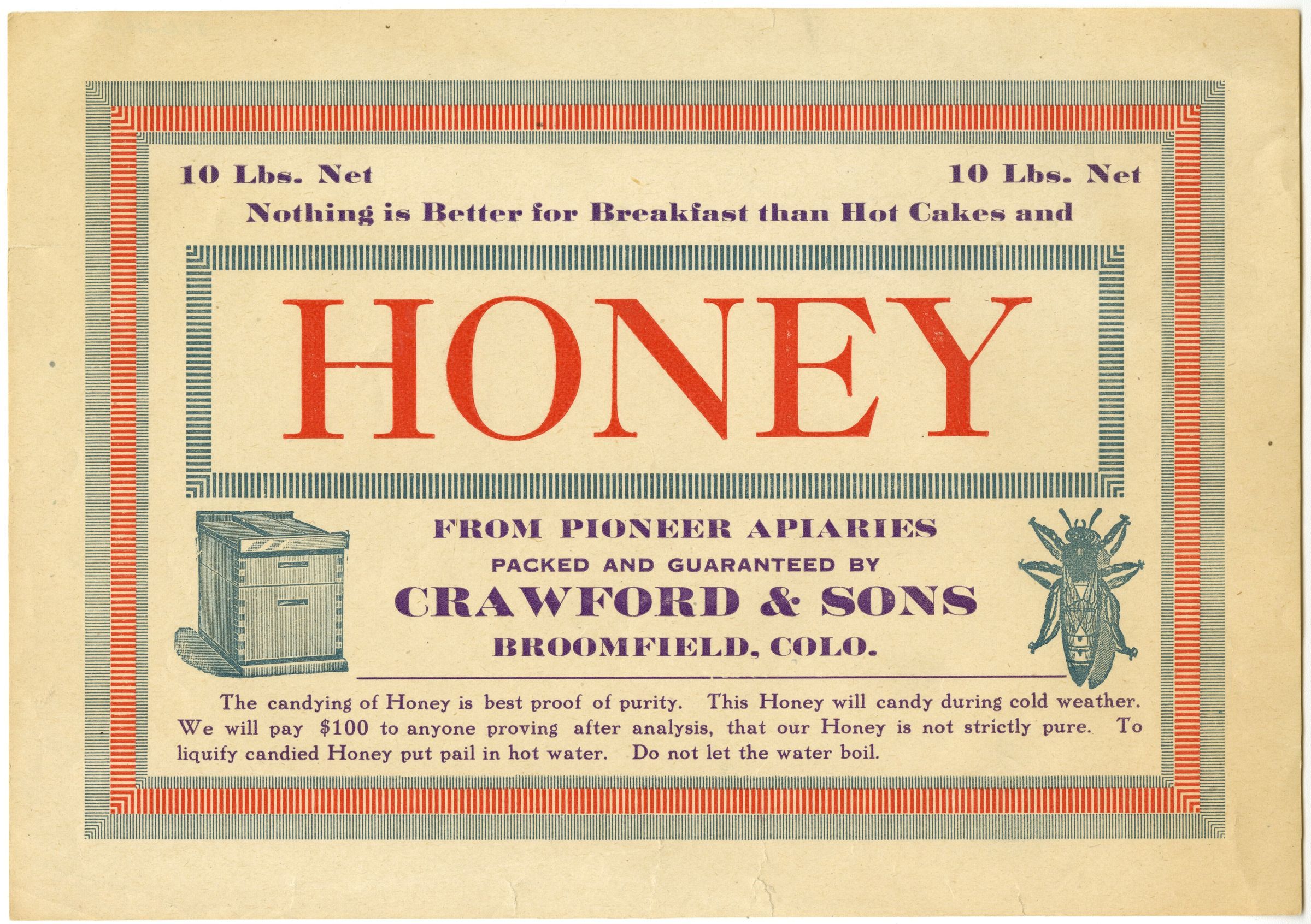 From pioneer apiaries, packed and guaranteed by Crawford & Sons, Broomfield, Colo.
